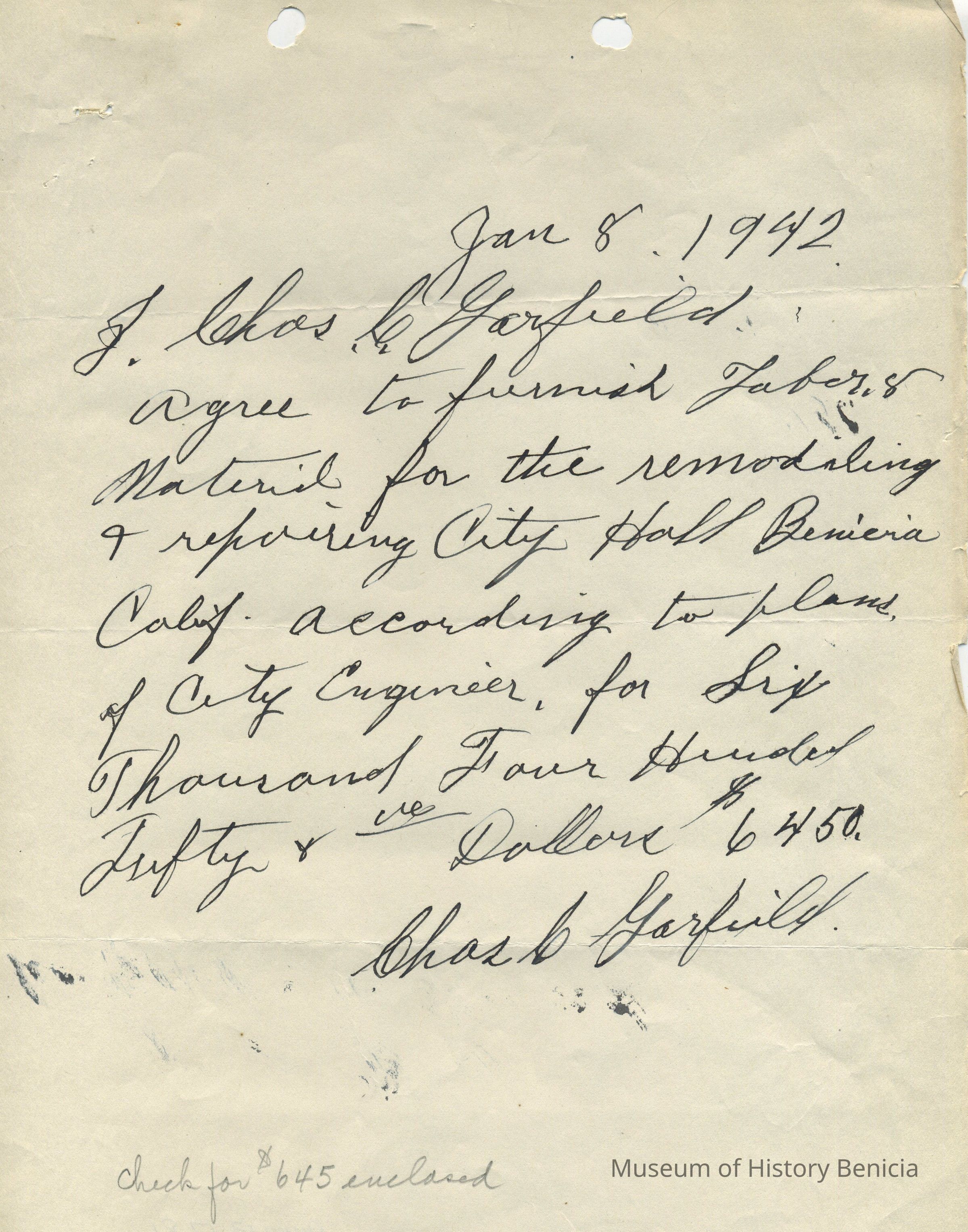 Contract/Proposal - Bid from Charles Garfield "...to furnish labor & materials for the remodeling and repairing City Hall of Benicia..." Work was to be done on the Capitol building which was serving as Benicia's City Hall at that time. The bid was handwritten and dated January 8, 1942.The work was estimated to cost $6,450.00. A 10% deposit check of $645.00 was enclosed with the bid.