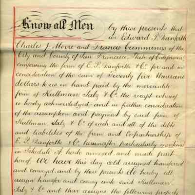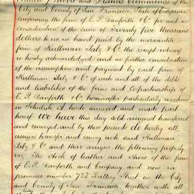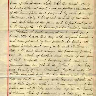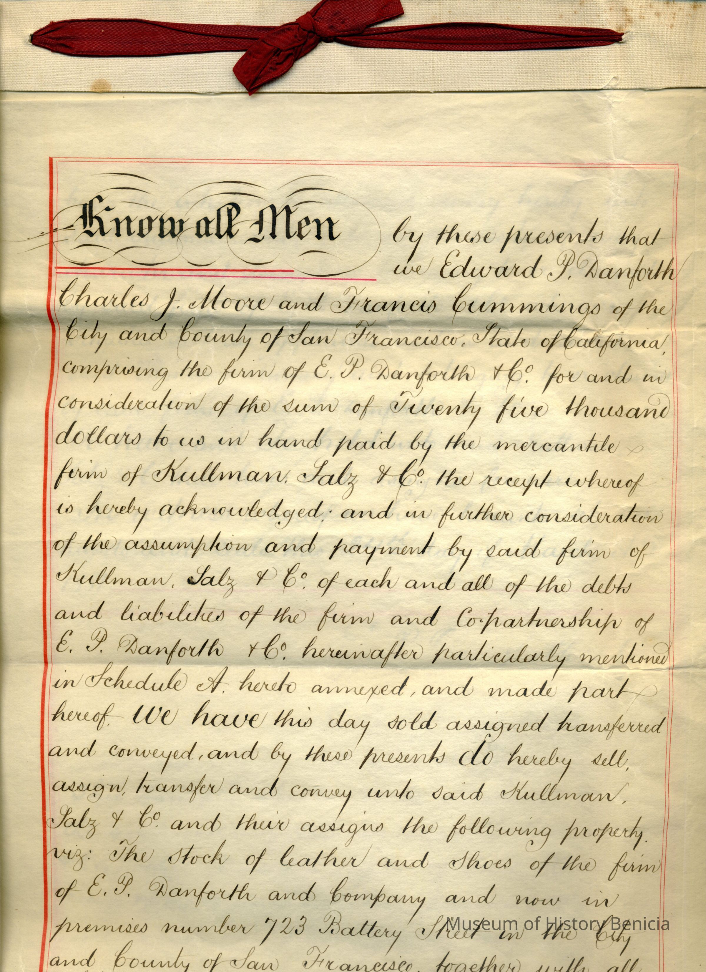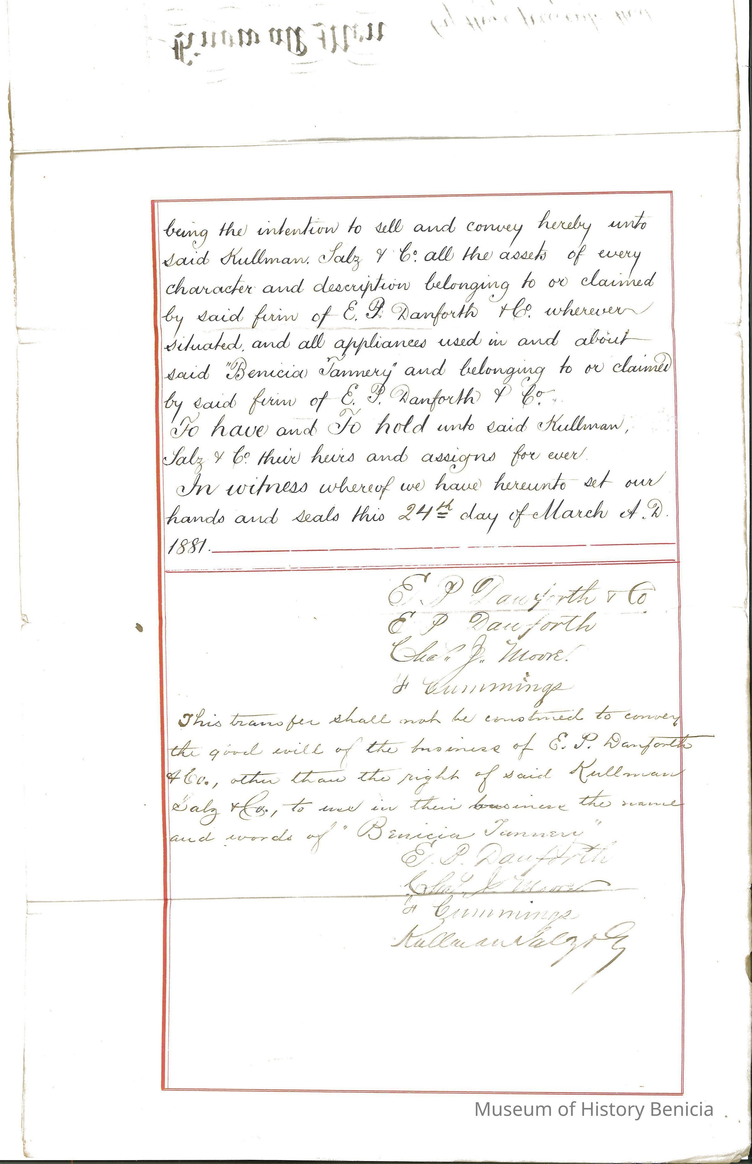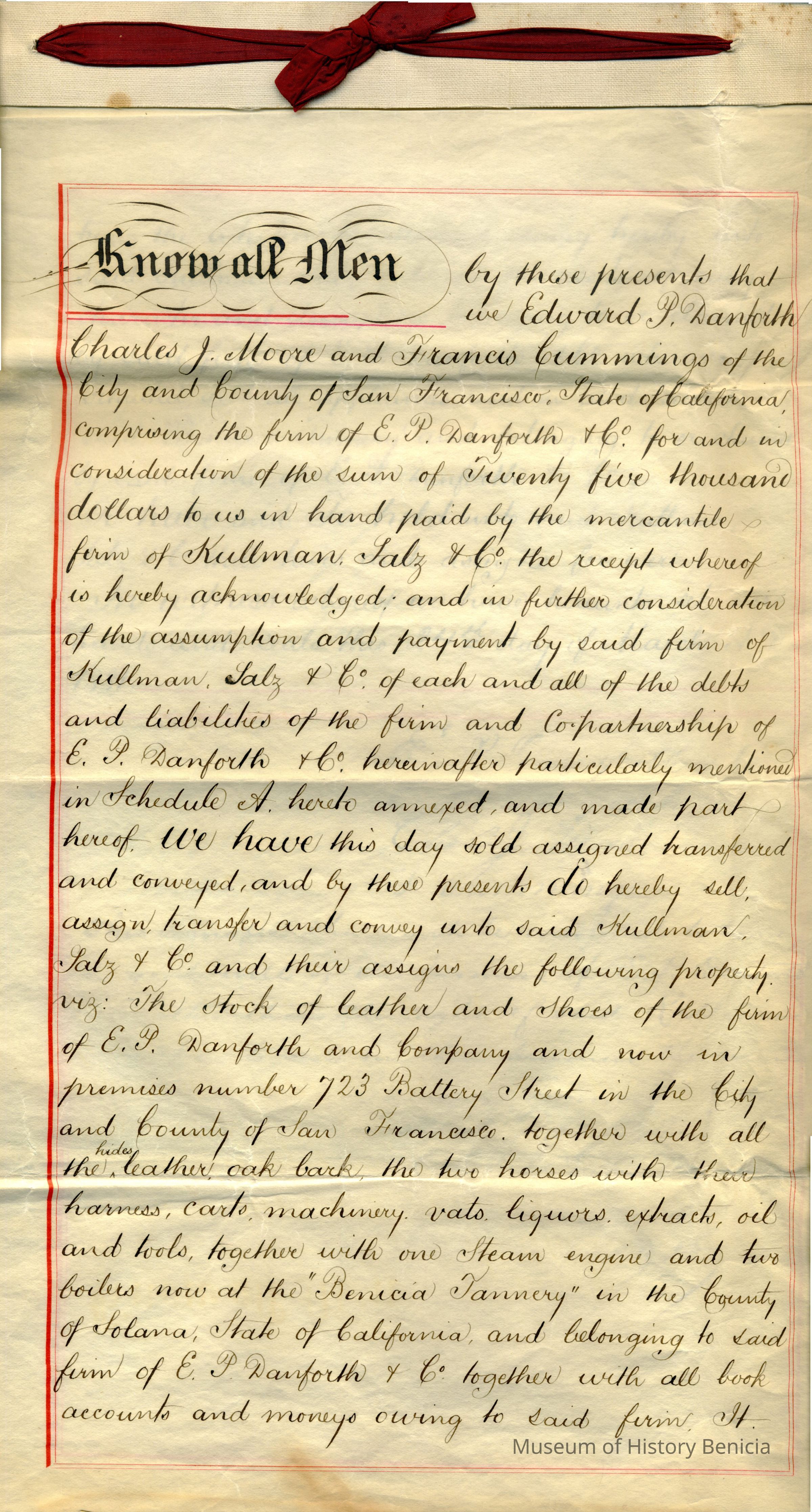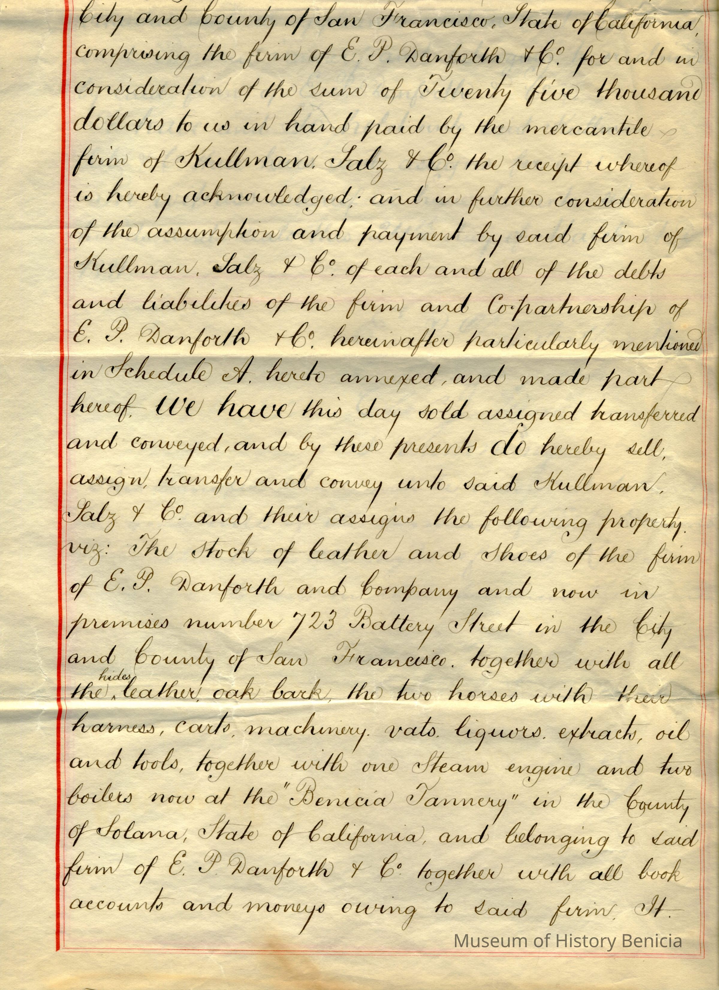 Bill of Sale of Edward P. Danforth & Co., "Benicia Tannery" and all parts and equipment to Kullman, Salz & Company for $25,000 and the assumption of debts. They did not sell the "goodwill" of the Benicia Tannery but they did sell the name.