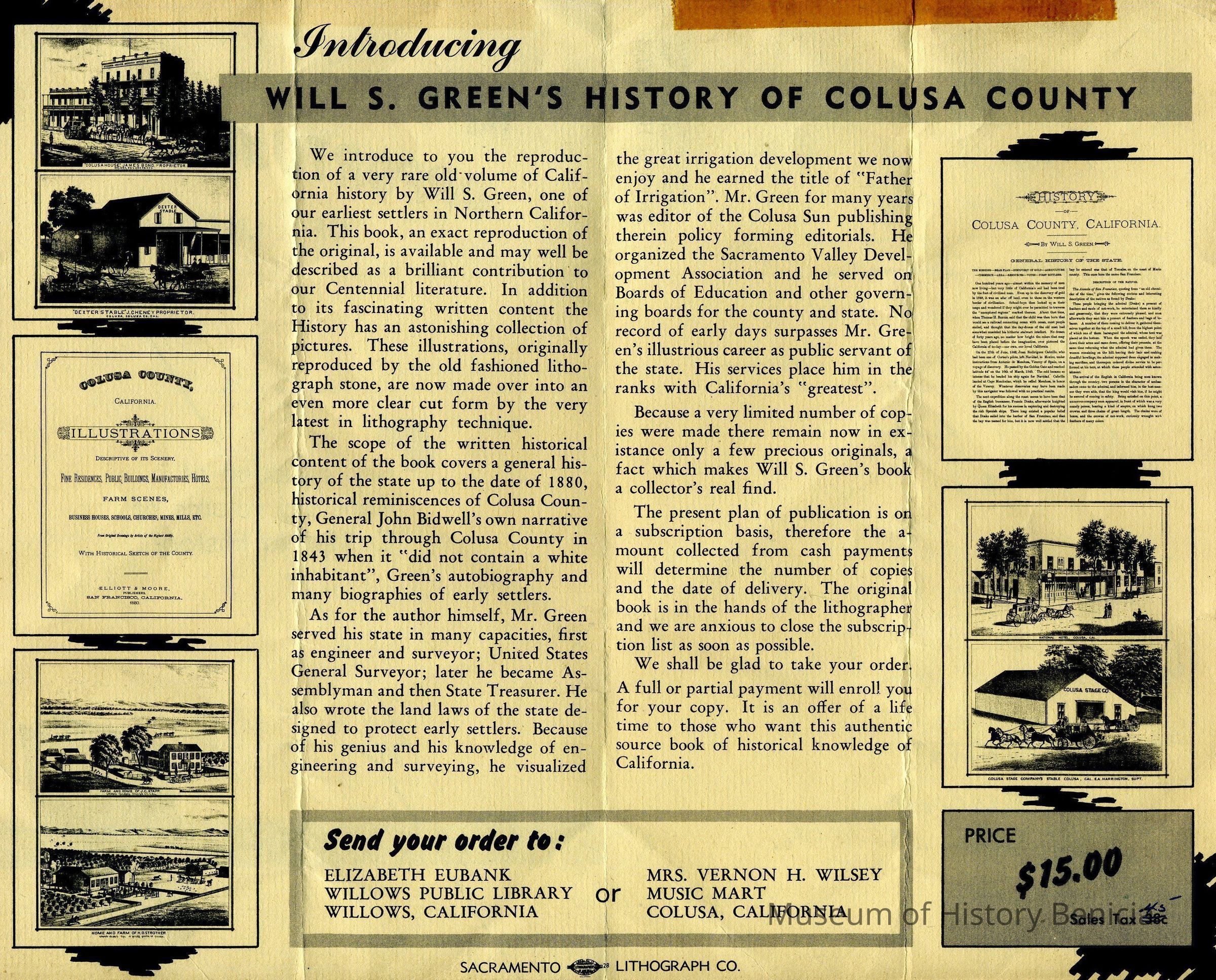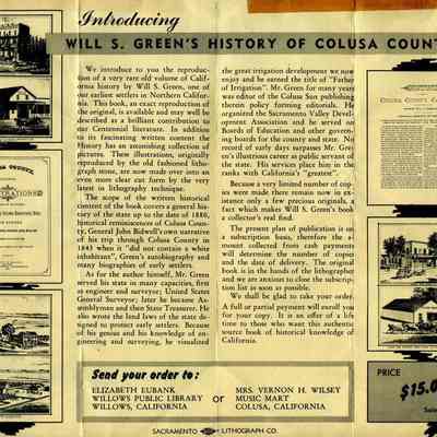 File titled "Correspondence Semple" contains many pages. Brochure introducing Will S Green's History of Colusa County. On the back are several names/addresses previously mentioned in this series. Mr Wohlgemuth was contributing chapters to a four volume history of Free Masonry in California which was published in 1950. The volumes are available for reference in the Benicia Public Library.
