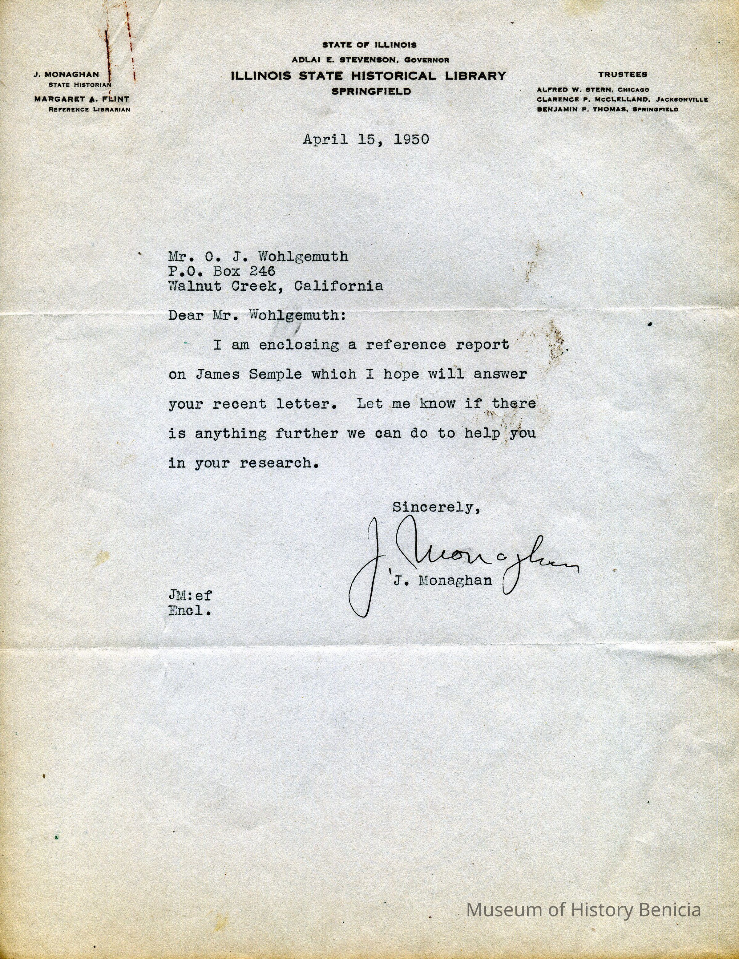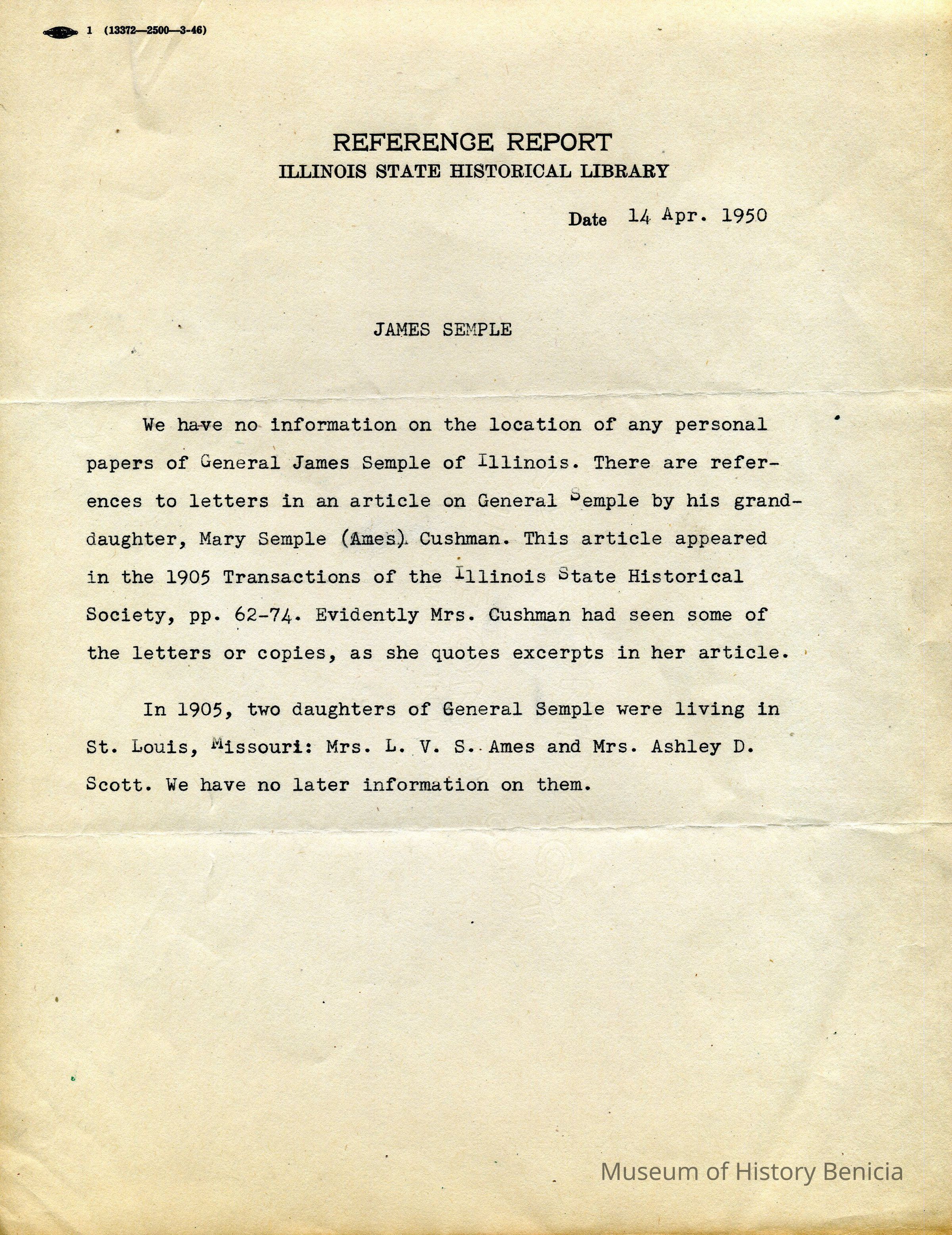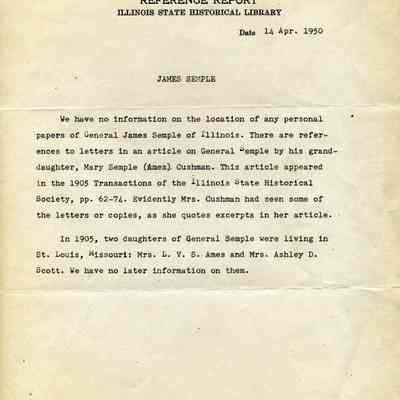 Letter, and Reference Report, from the Illinois State Historical Library to O. J. Wohlgemuth, Walnut Creek written in 1950 concerning Robert Semple's father, James Semple.
