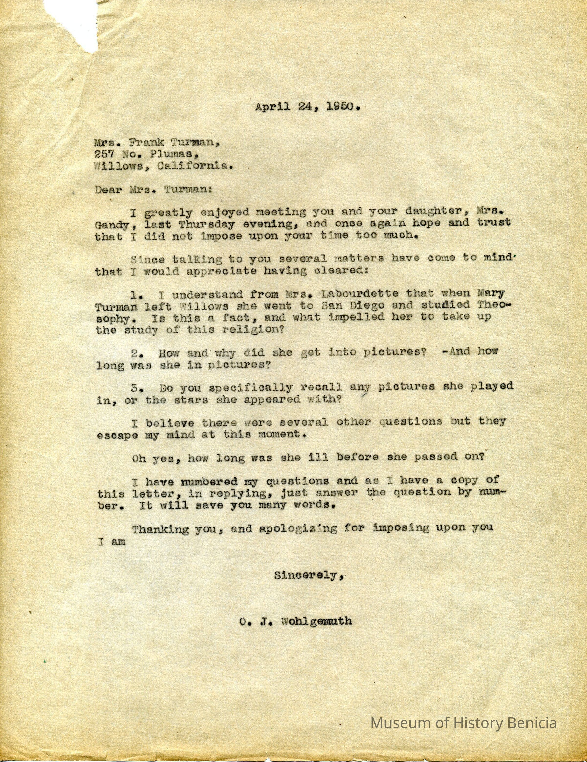Copy of letter from O. J. Wohlgemuth, Walnut Creek to Mrs. Frank Thurman, Winters, CA giving his appreciation for his recent meeting with Mrs. Thurman and her daughter.