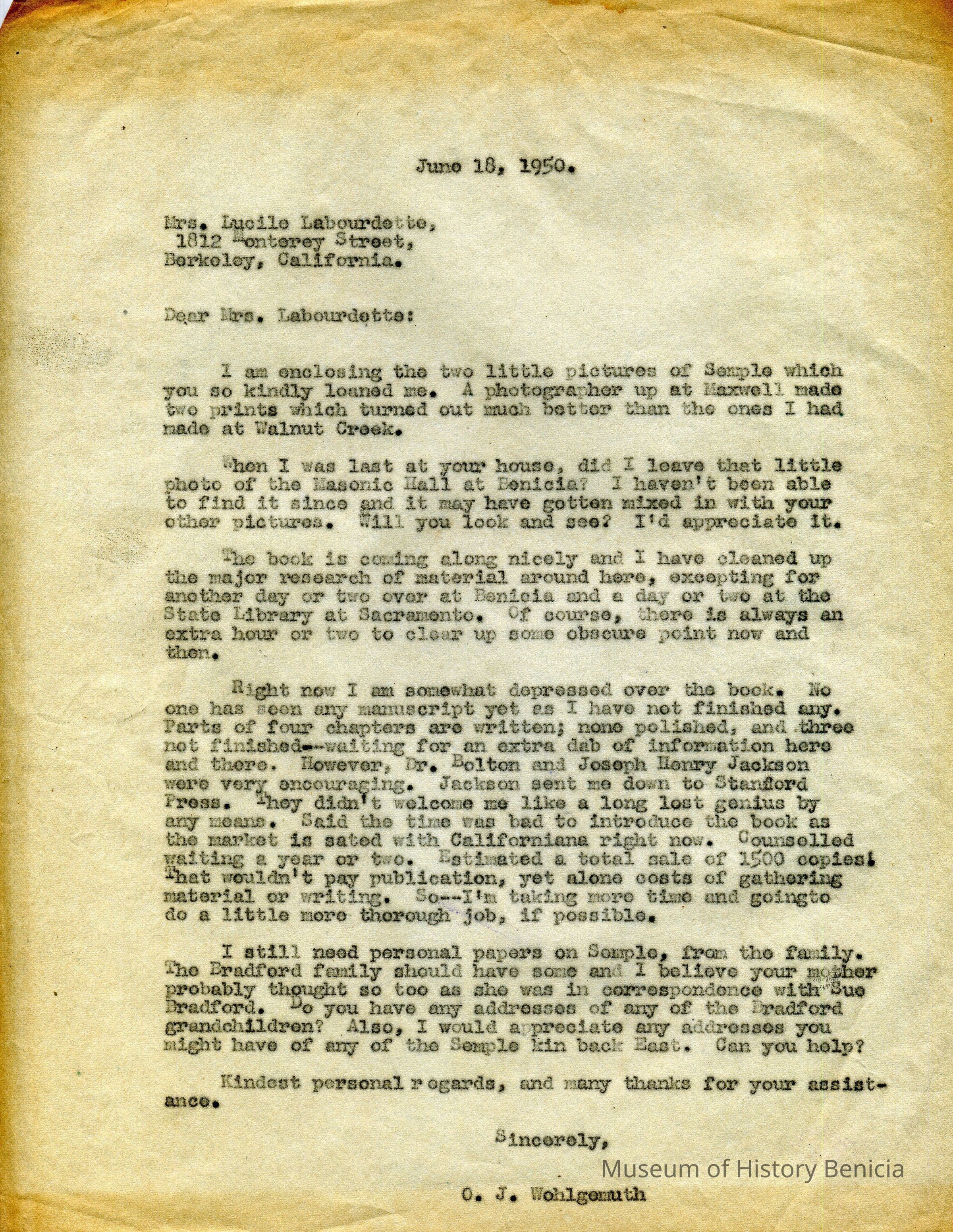 Letter from O. J. Wohlgemuth, Walnut Creek to Lucile Labourdette requesting further details on Robert Semple and lamenting his frustrations on finishing his book and the publishing of same.