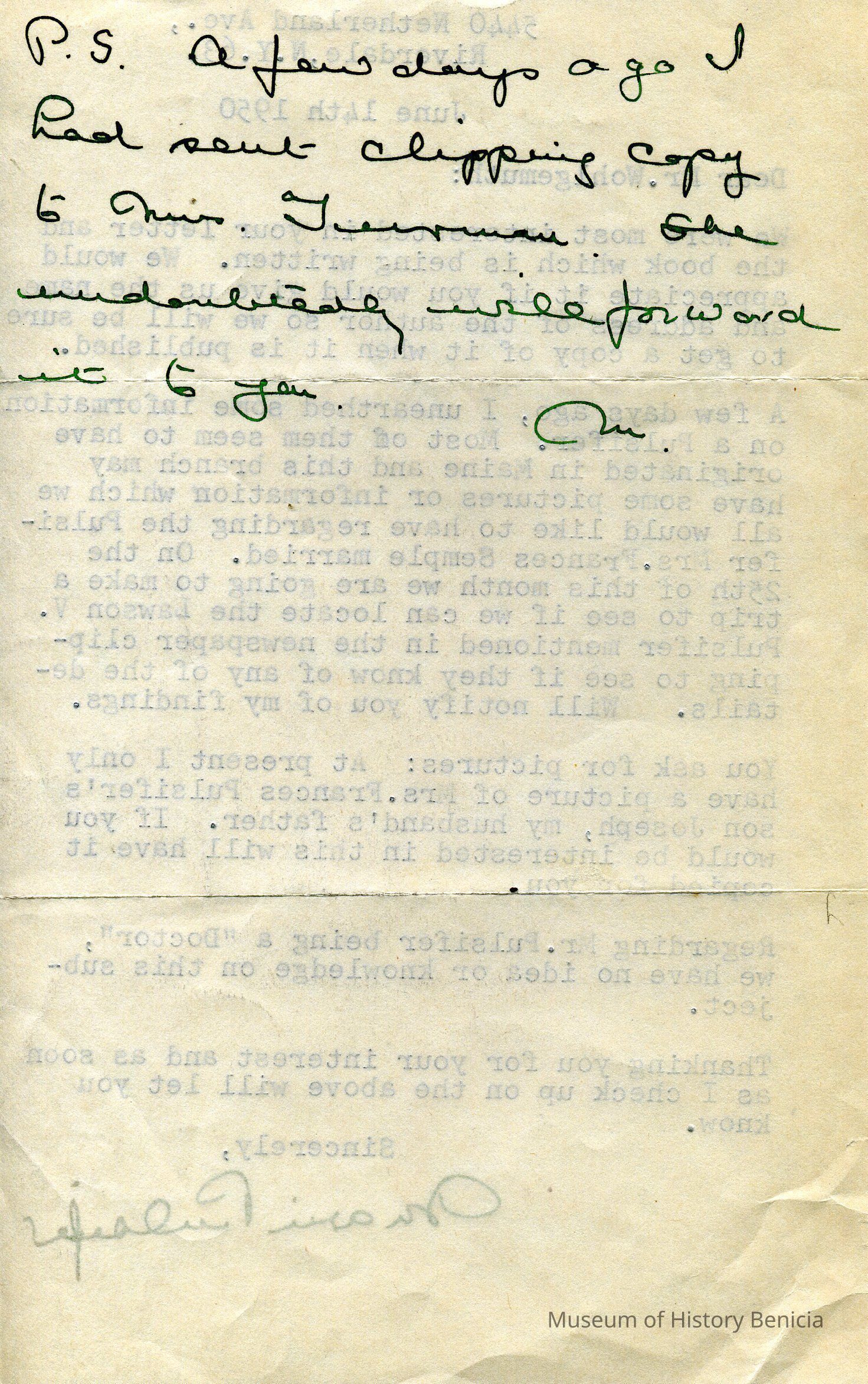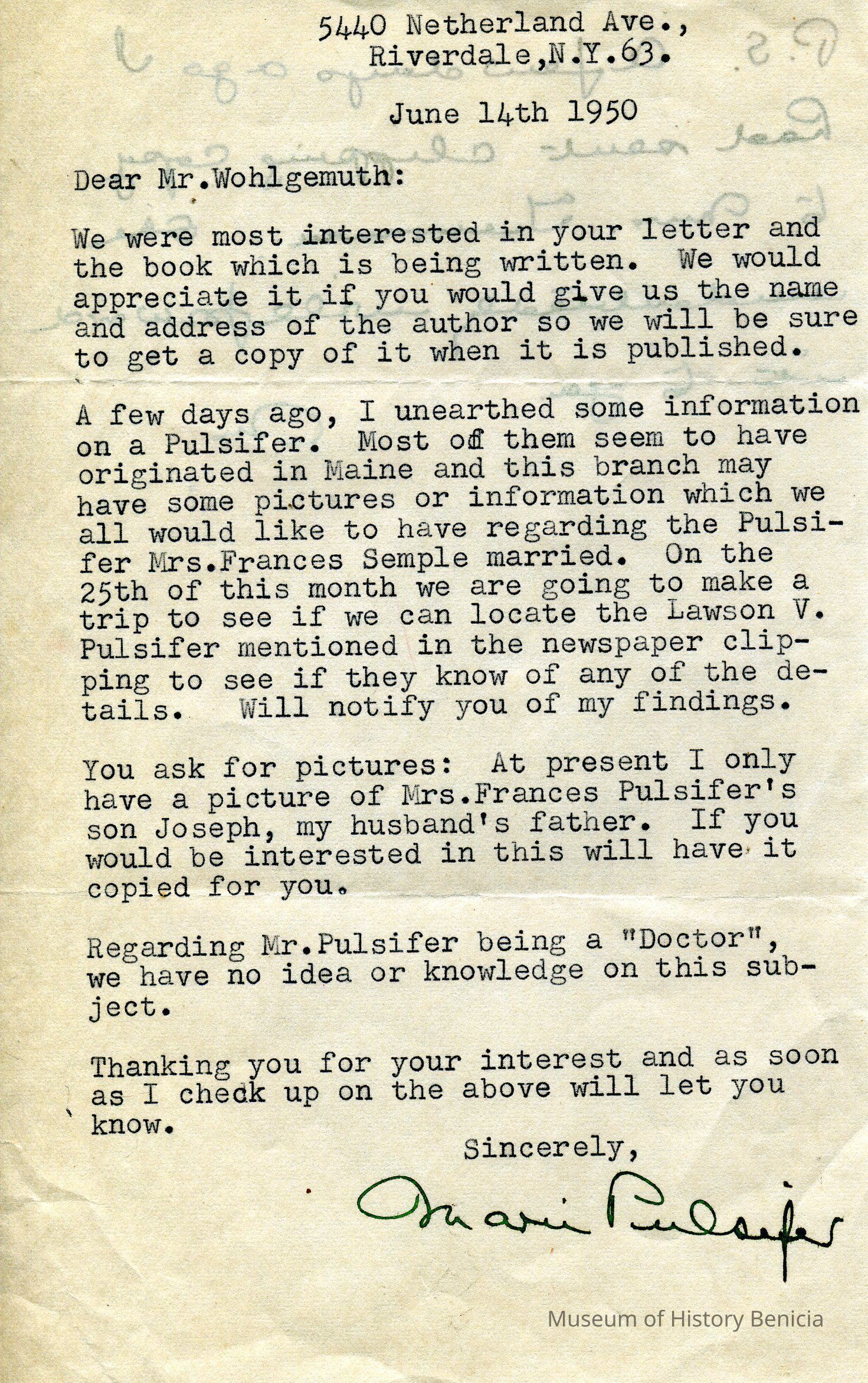 Letter to Mr Wohlgemuth from Marie Pulsifer regarding information on Dr Robert Semple's wife Frances Pulsifer.