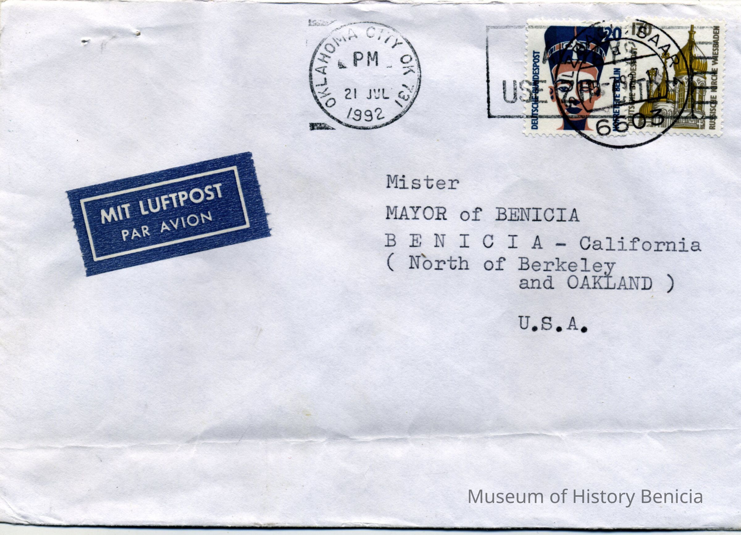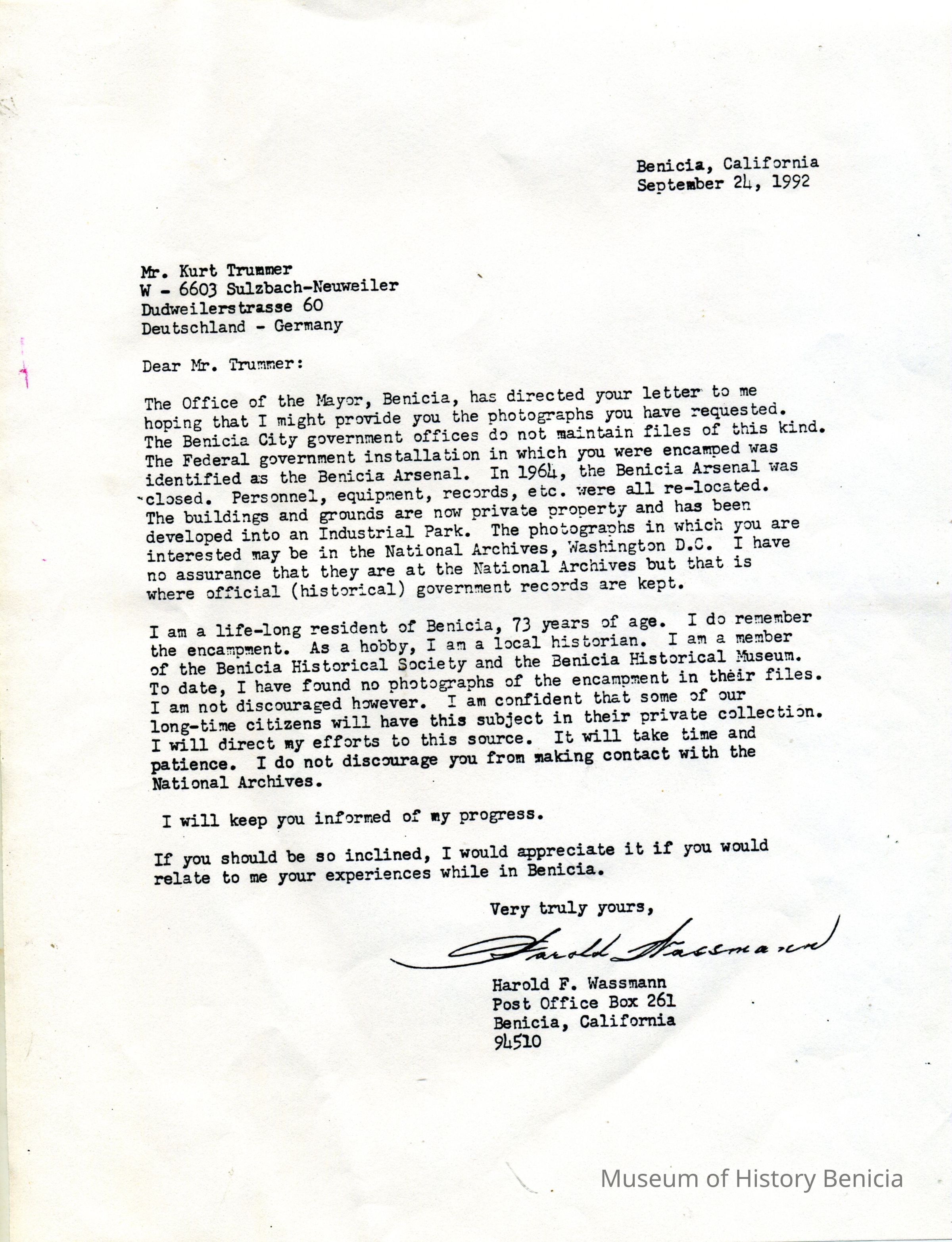 This is an exchange of letters between a German Prisoner of War (POW) and people in Benicia. The POW was writing to the Mayor of Benicia asking for photographs of the prison where he stayed for two months during WWII. His name is Kurt Trummer. He was in the German Africa Corps (Afrika-Korps). The stationary he used has markings from that unit. The mayor asked Harry Wassmann to answer the man.