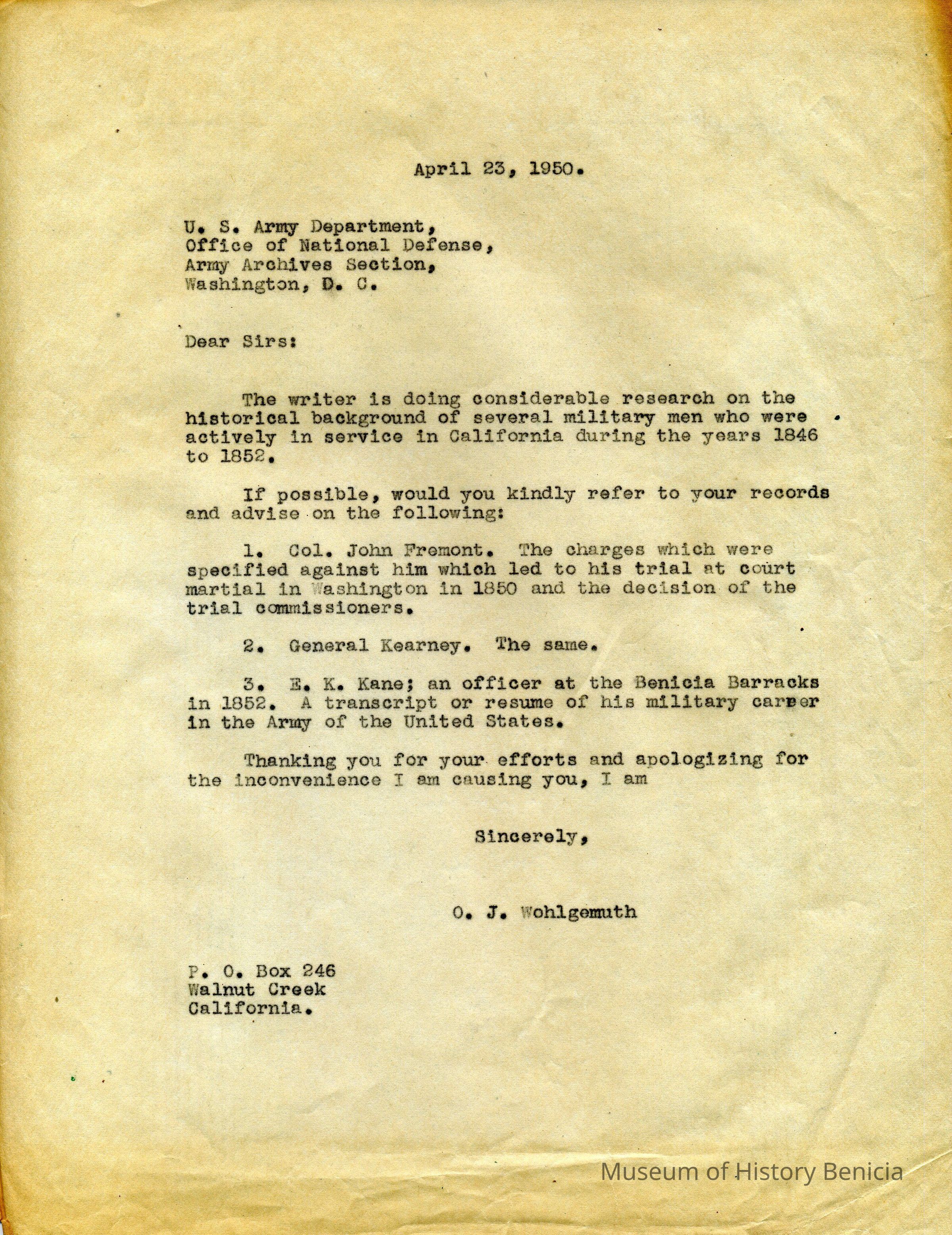 Letter to the US Army Department, Washington DC from O. J. Wohlgemuth, Walnut Creek written in 1950 requesting information on three officers, two of which had charges brought before them and subsequent court martial in 1850.
