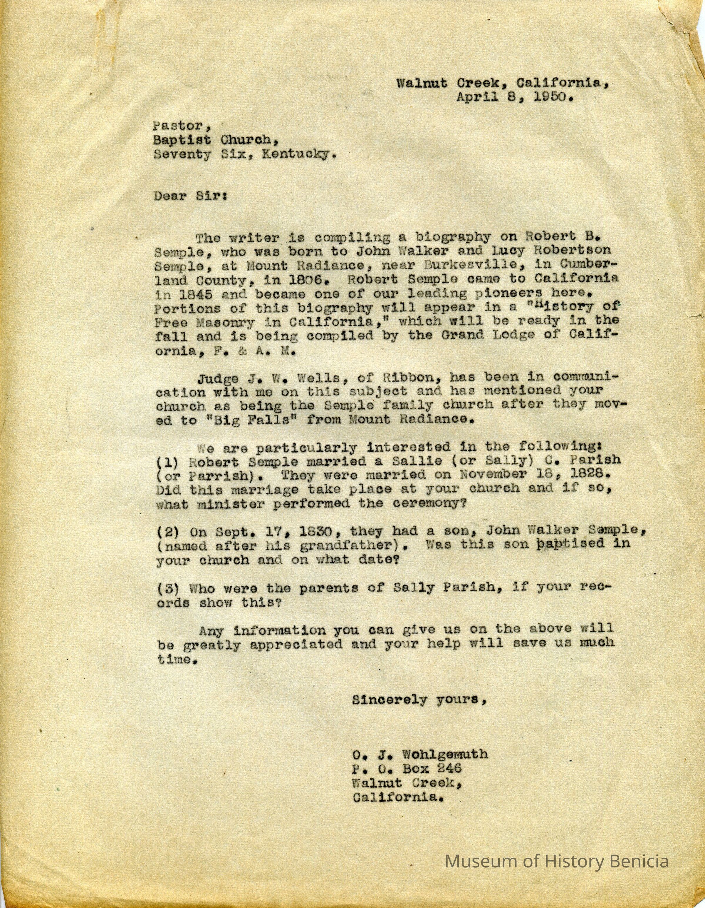 Letter from O. J. Wohlgemuth, Walnut Creek to Pastor, Baptist Church, Seventy Six, Kentucky requesting if Robert Semple was married in this church and if his son was baptised in same.