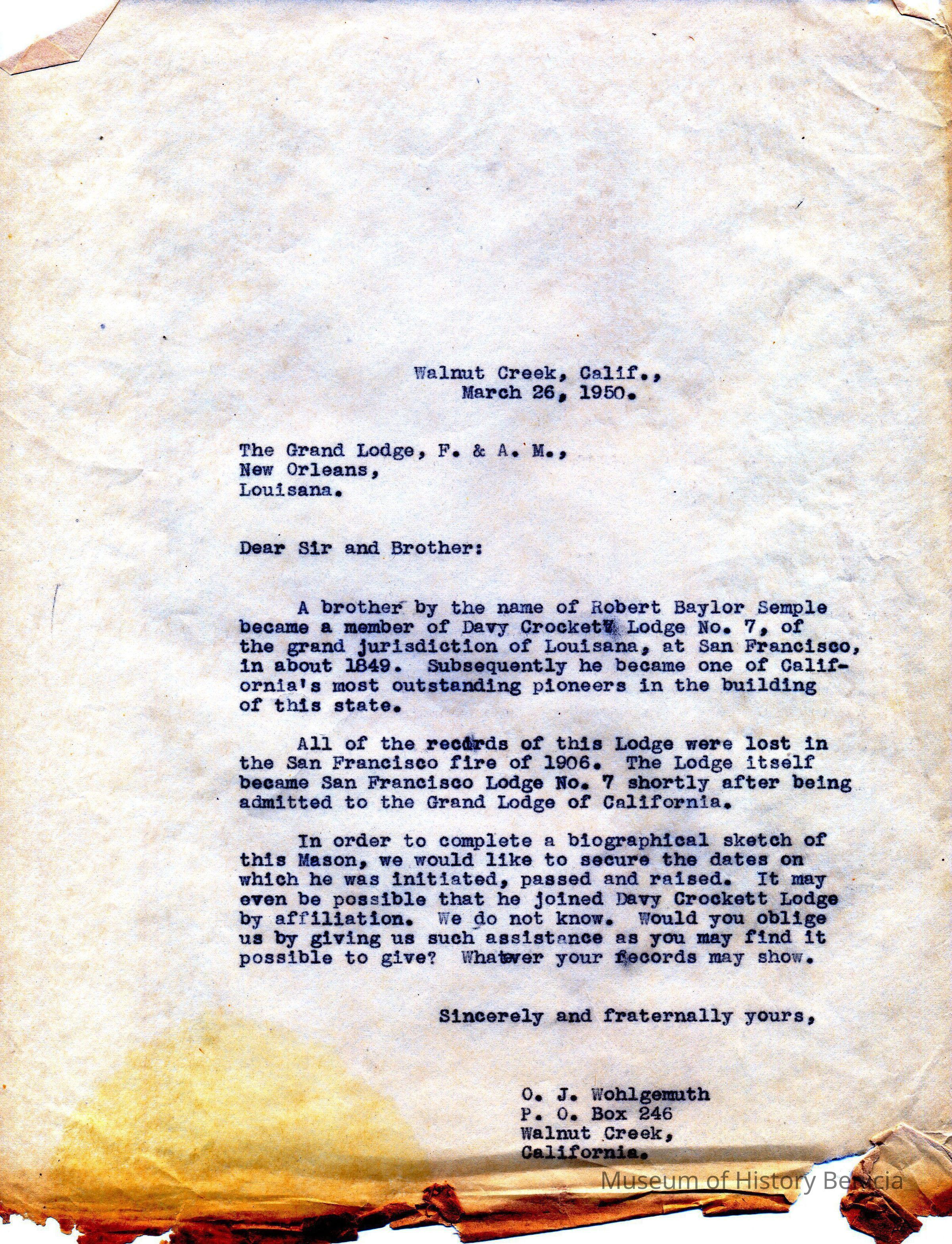 Carbon Copy of letter sent to Grand Lodge (Mason) in New Orleans, Louisana by O. J. Wohlgemuth, Walnut Creek written in 1950 requesting the dates Robert Semple was initiated, passed and raised in the Blue Lodge in San Francisco. Since the records were destroyed in the fires of 1906 a request is being made for the possibility that the Grand Lodge might have these dates.