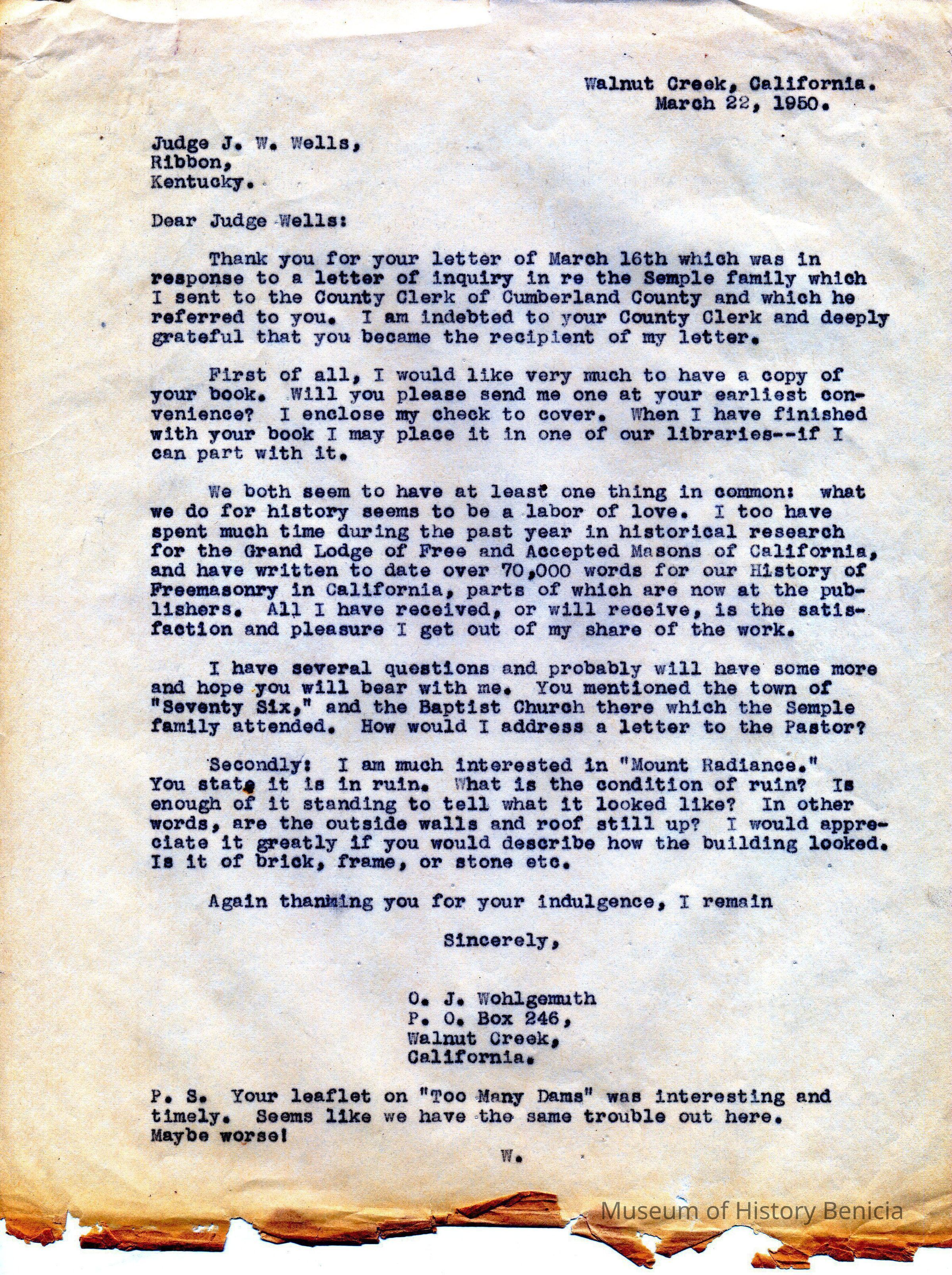 Carbon Copy of letter sent to Judge Wells, Ribbon Kentucky by O. J. Wohlgemuth, Walnut Creek written in 1950 responding to a previous letter from Judge Wells and asking for clarification.