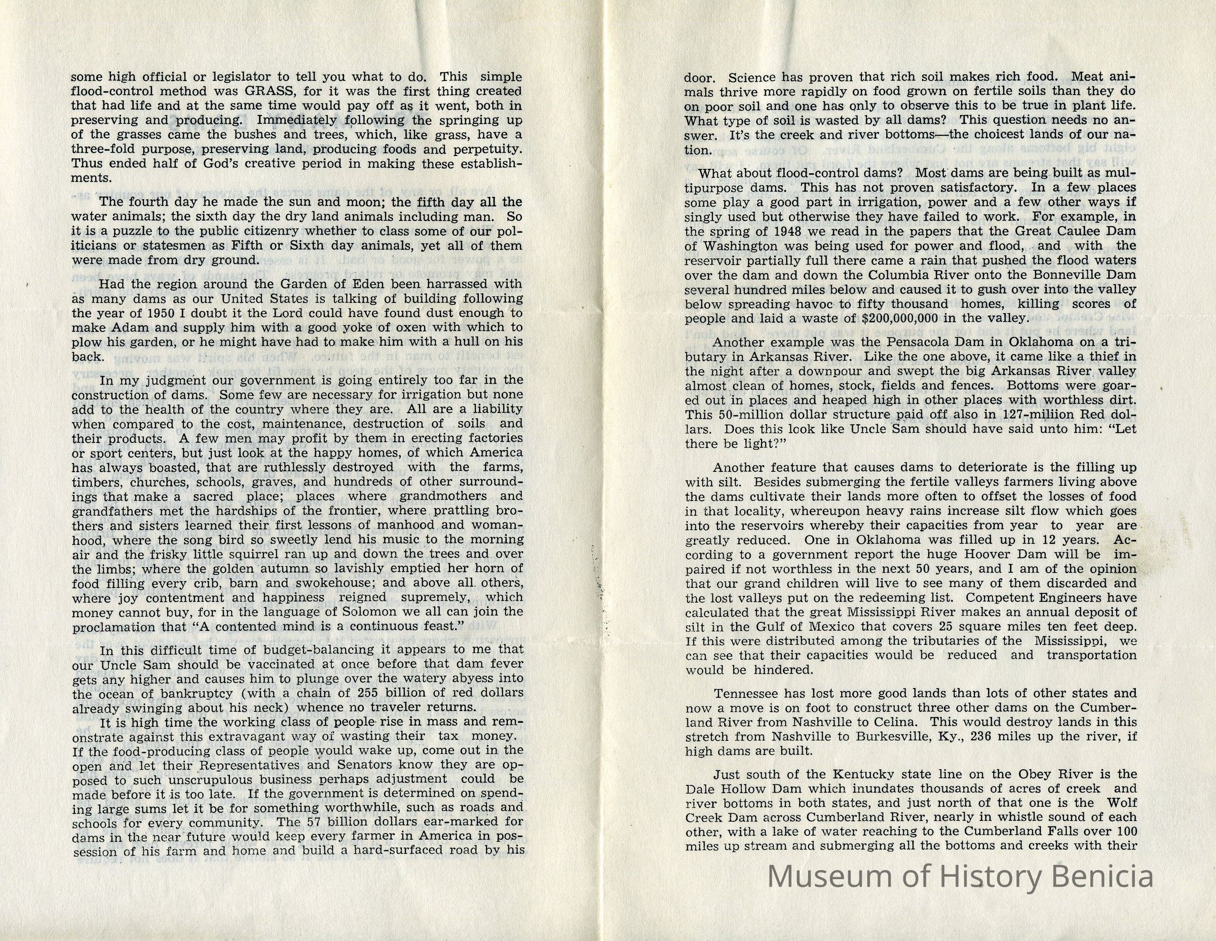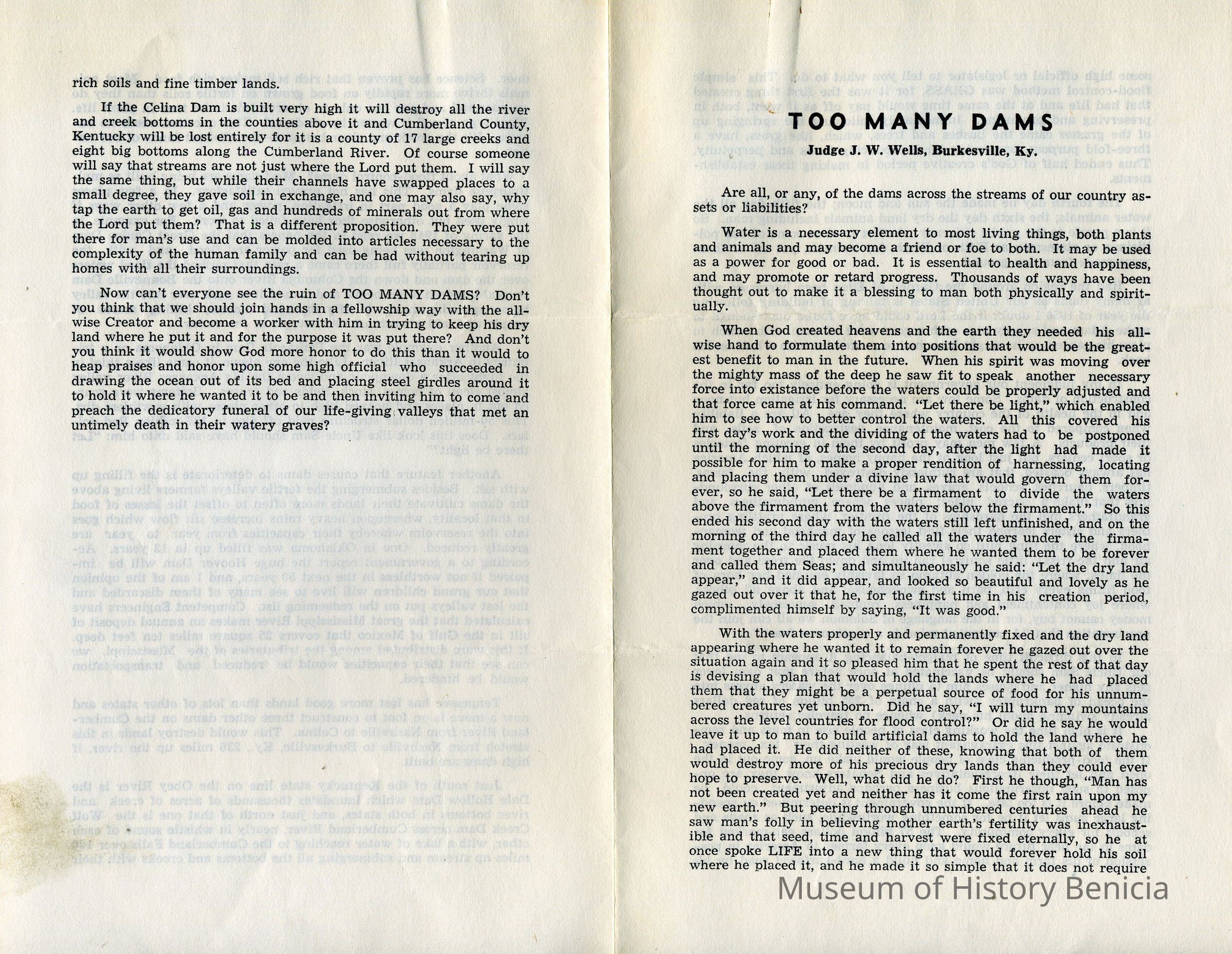 Brochure by Judge Wells, Burkesville, Kentucky, lamenting the number of dams being built in Kentucky.