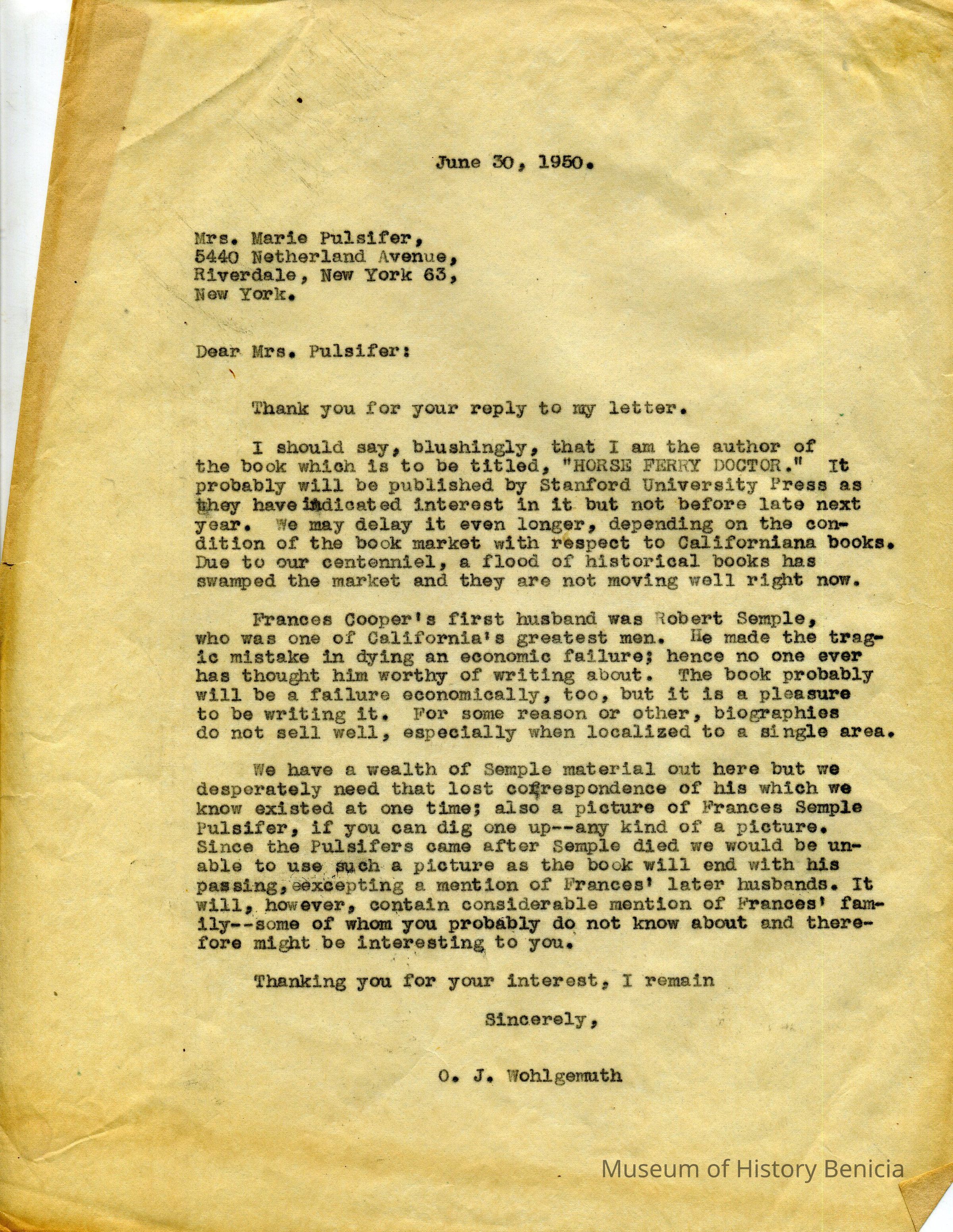 Letter from O. J. Wohlgemuth, Walnut Creek to Marie Pulsifer, Riverdale, New York requesting information on the early life of Frances Cooper (aka Frances Semple Pulsifer) whose first husband was Dr Robert Semple.