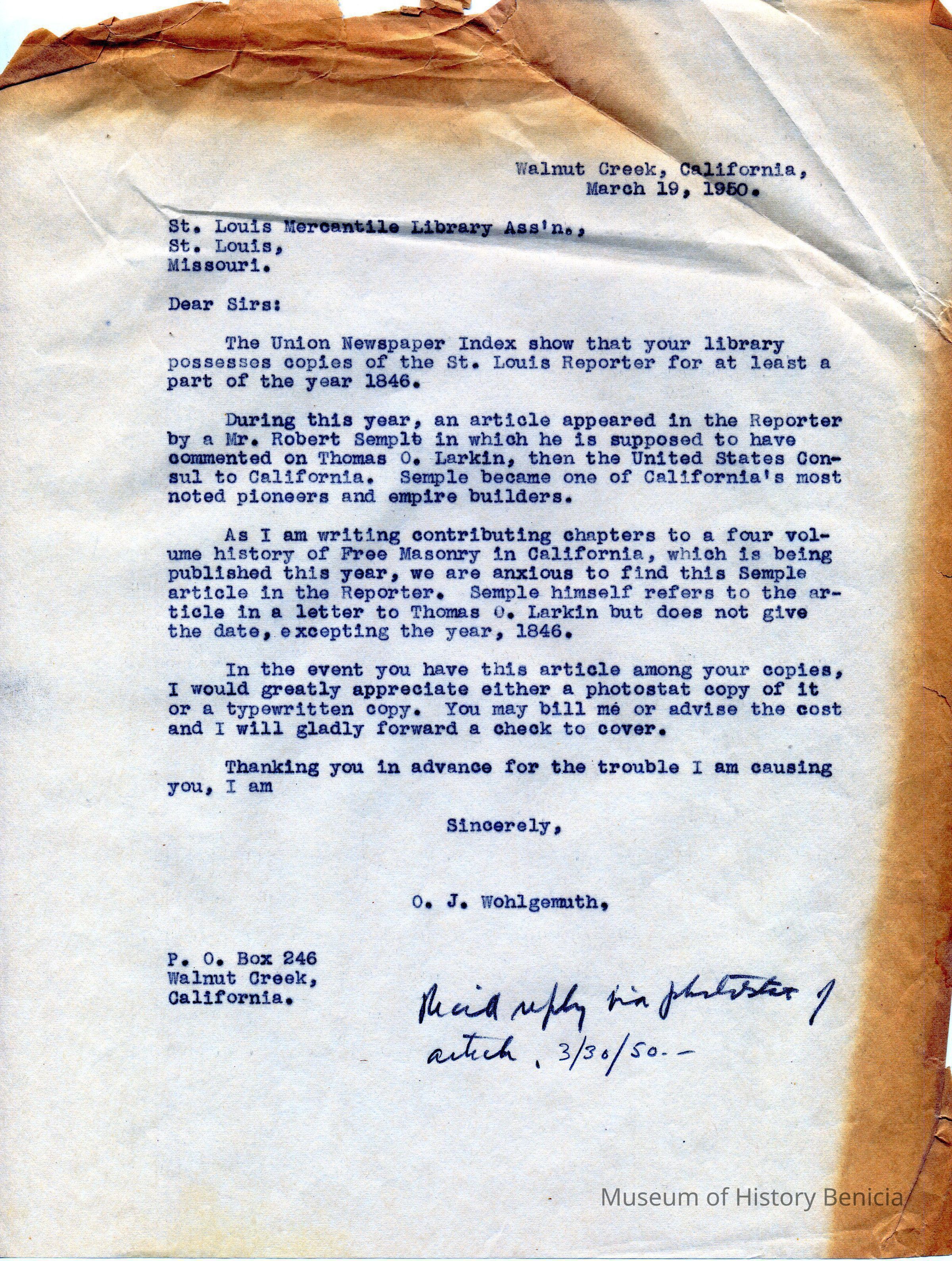 Carbon Copy of letter sent to St Louis Mercantile Library Associion by O. J. Wohlgemuth, Walnut Creek written in 1950 in which he asks for information published by Mr Robert Semple in 1846 seeking the same information as the previous archive 2015.020.0012.