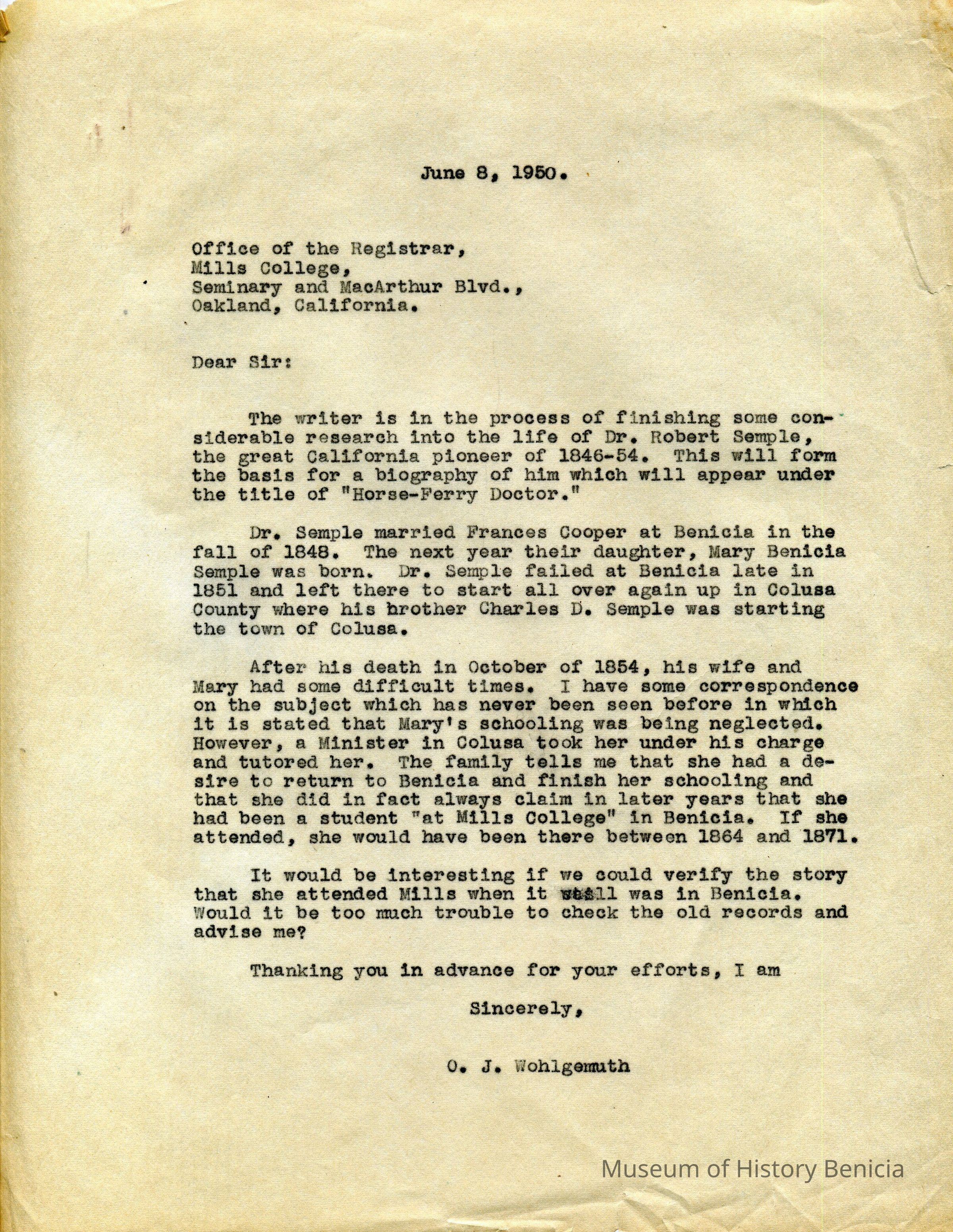 Letter from O. J. Wohlgemuth, Walnut Creek to Mills College, Oakland, California requesting verification of Dr Semple's daughter's claim that she finished her schooling as a student at Mills College while it was in Benicia sometime between 1864 and 1871.