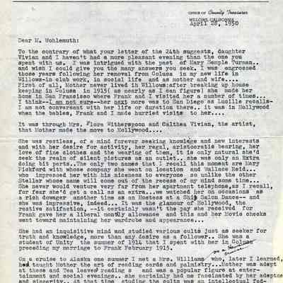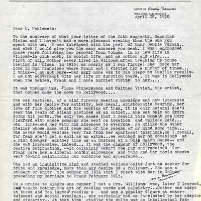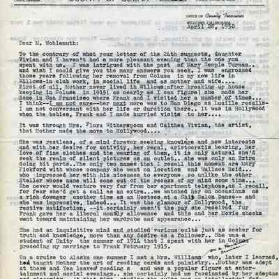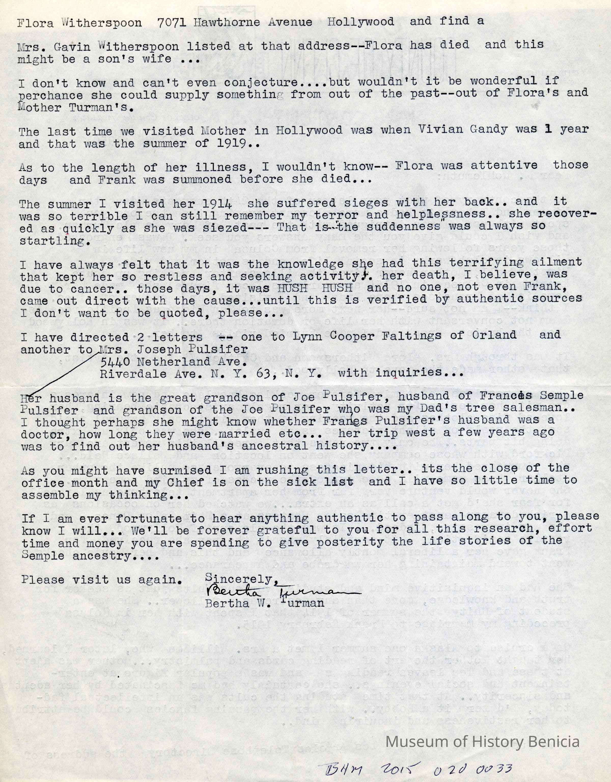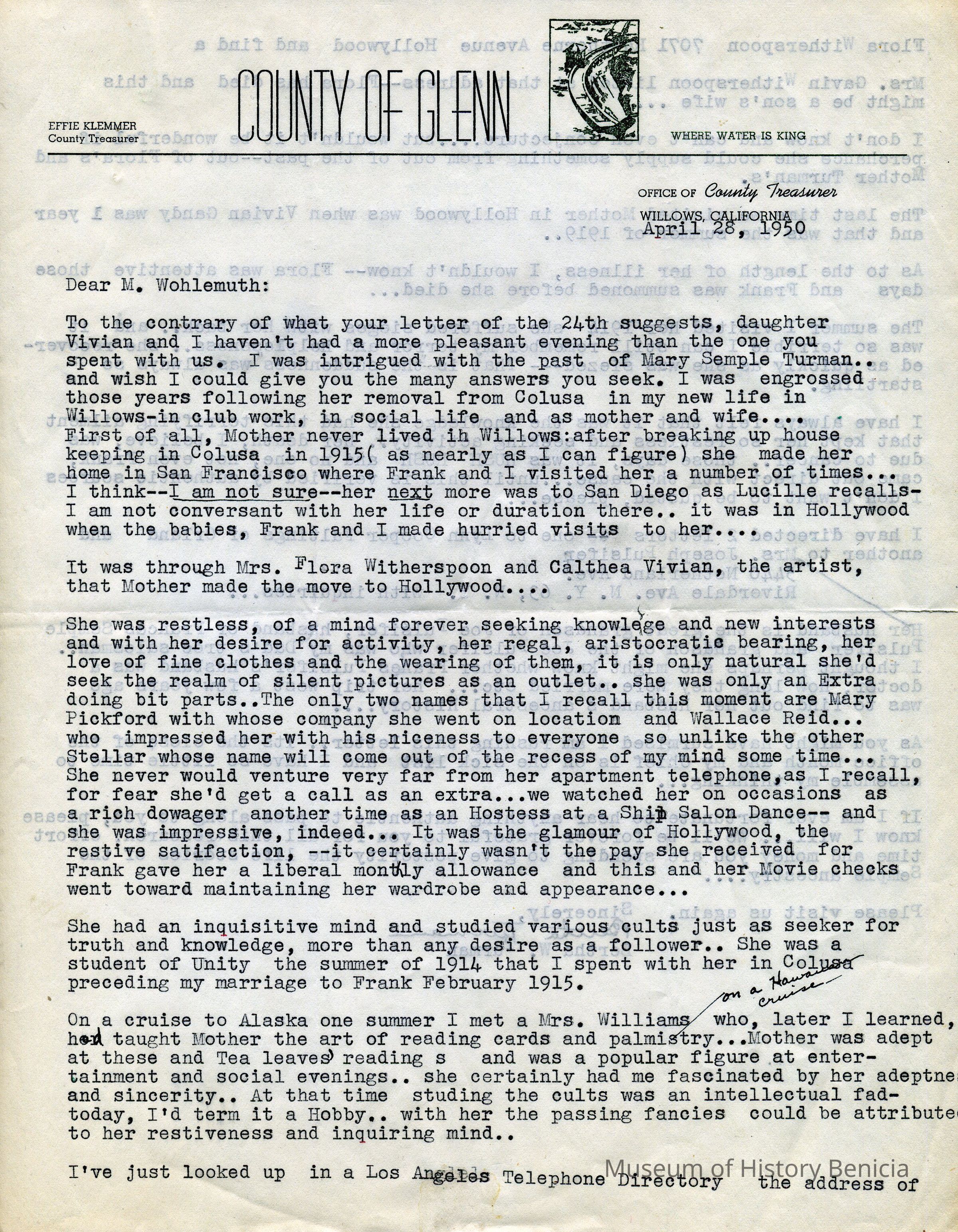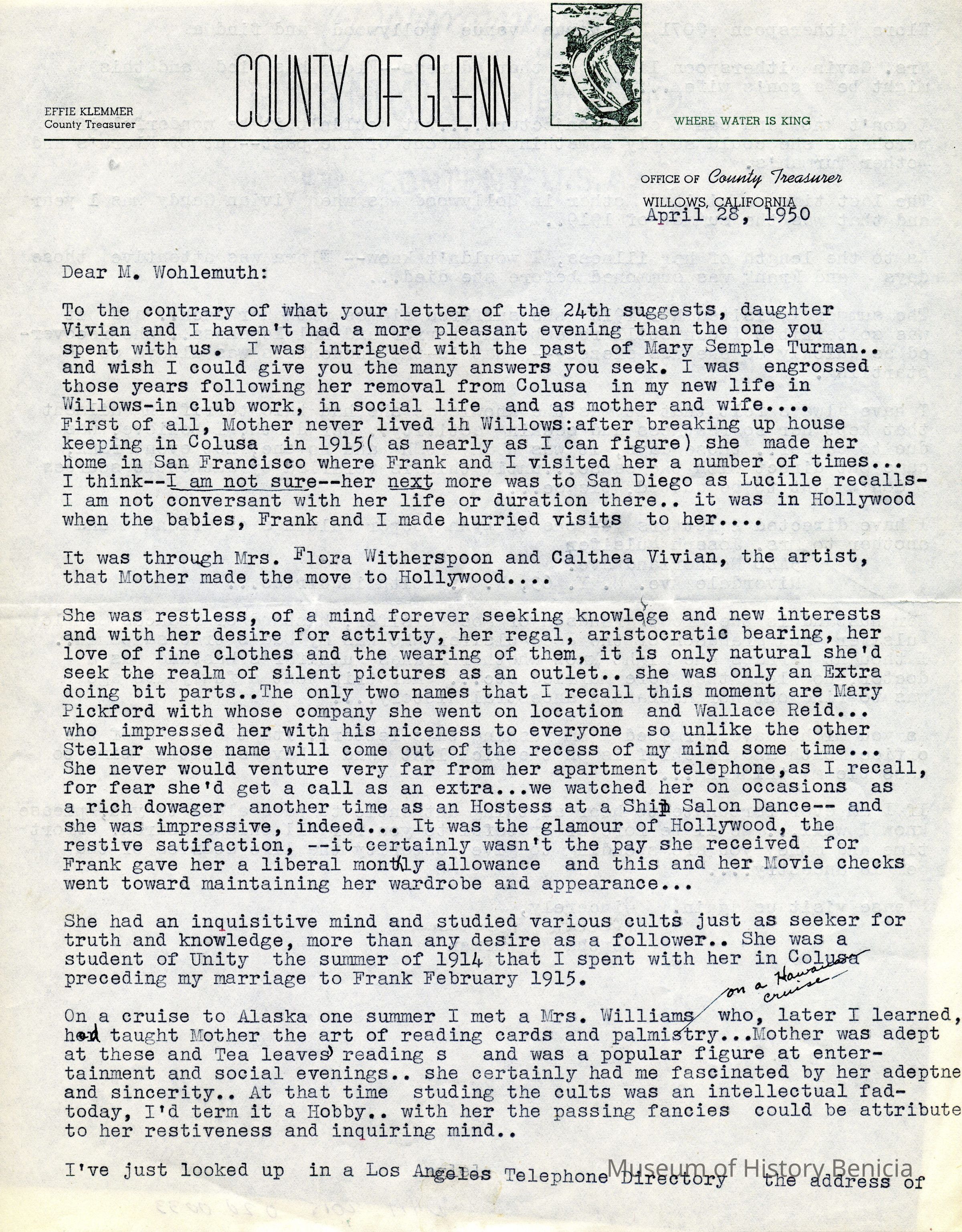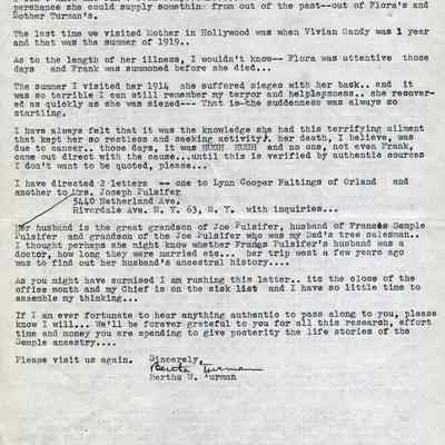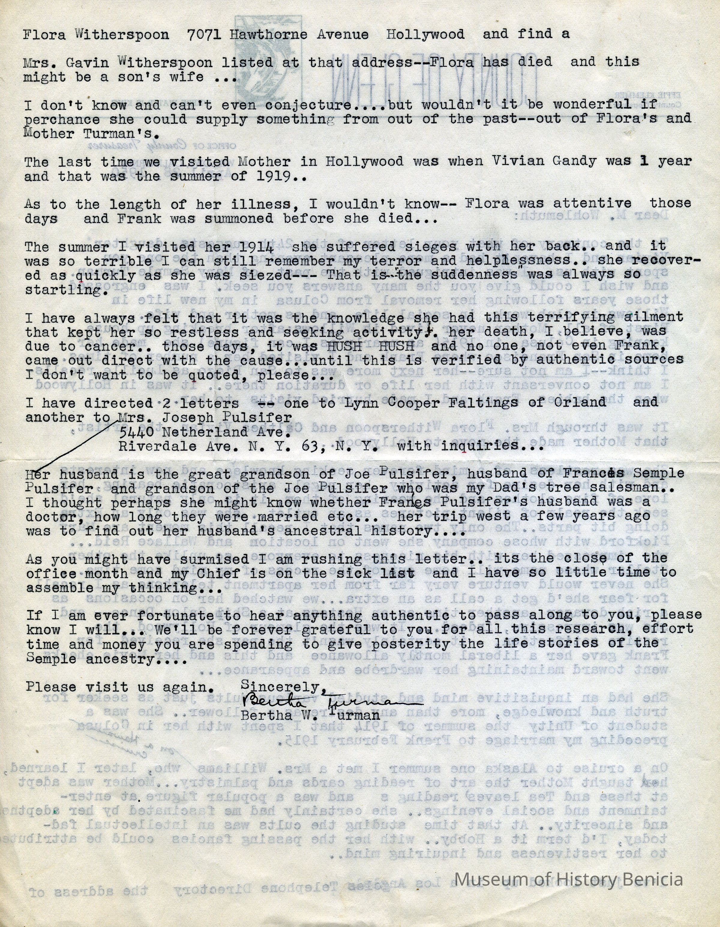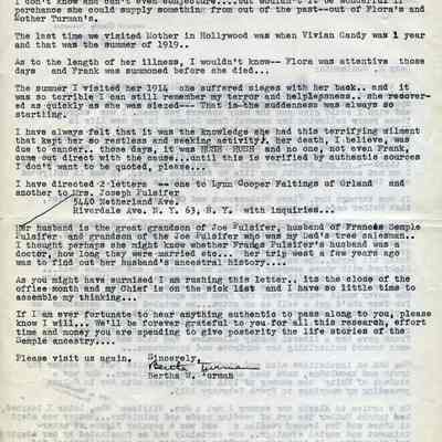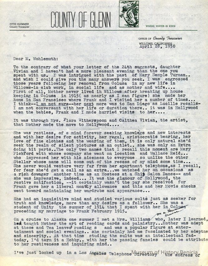Letter to O. J. Wohlgemuth, Walnut Creek from Bertha Thurman, County of Glenn, Willows, CA describing some details of Mary Semple Turman's life in Colusa and later in Willows.