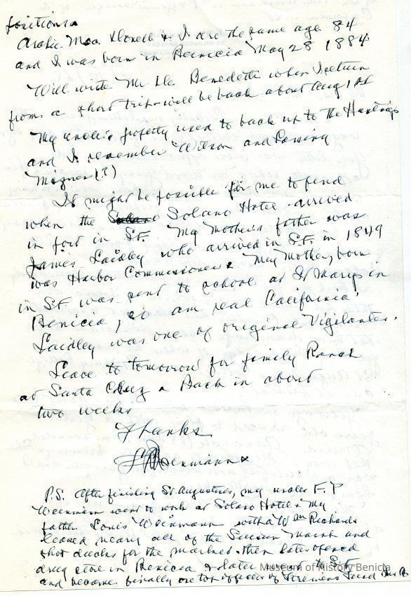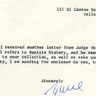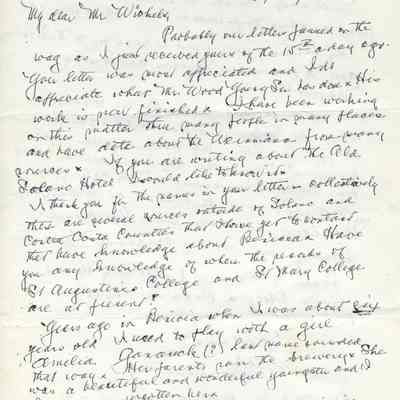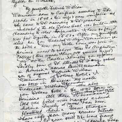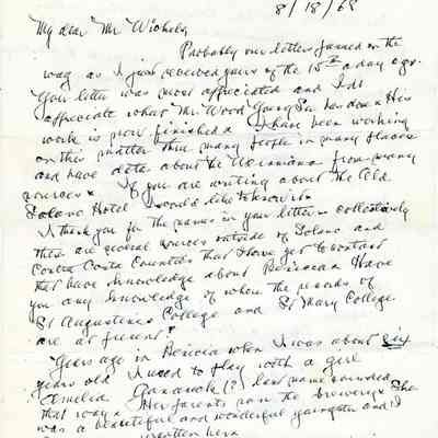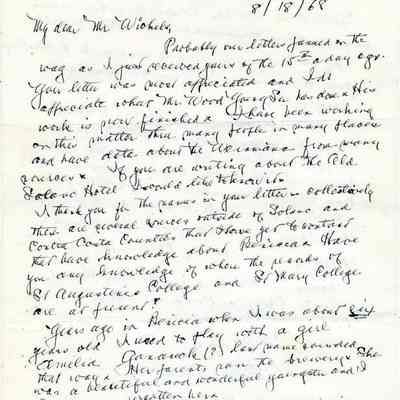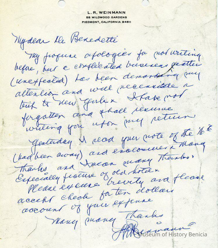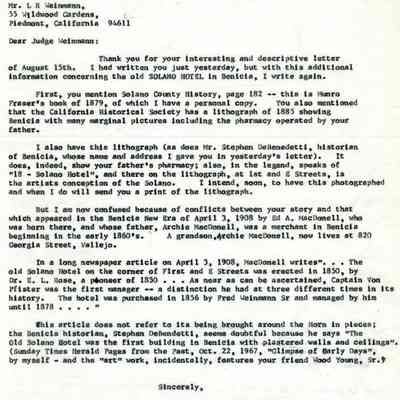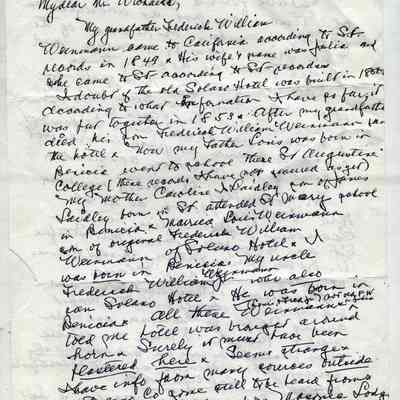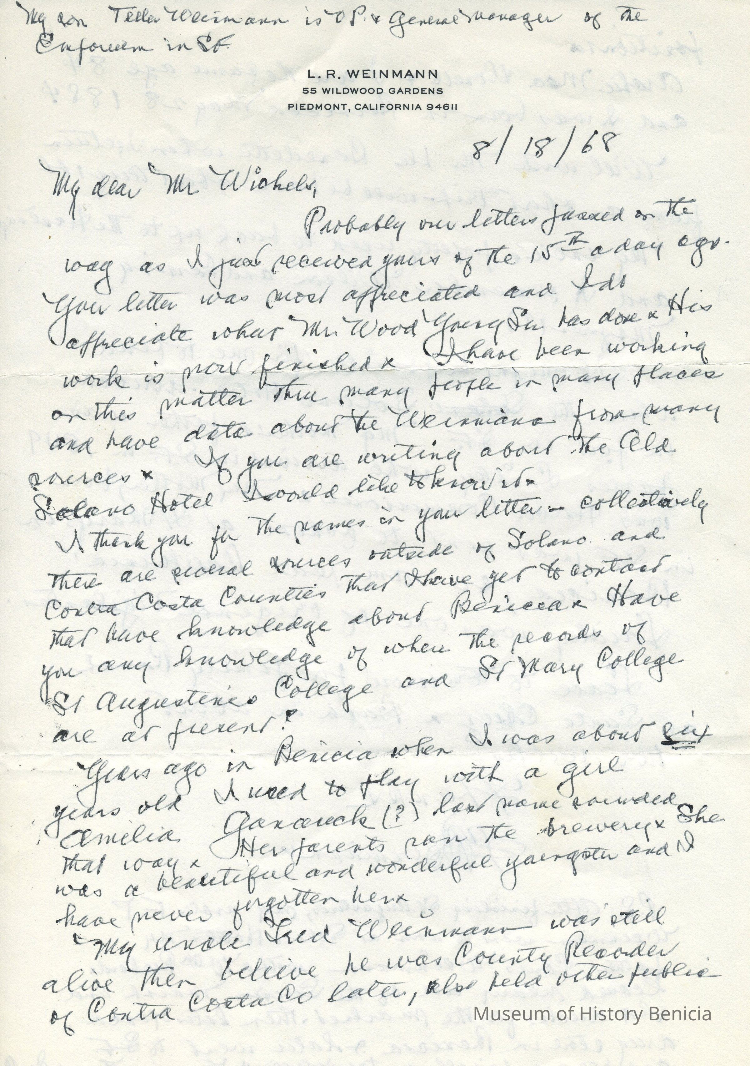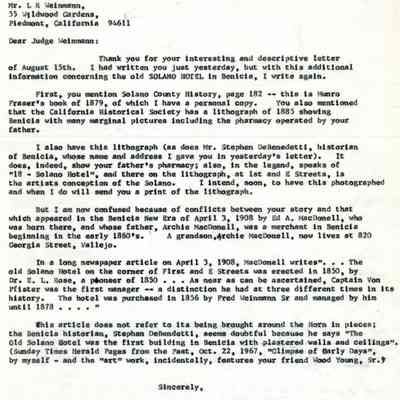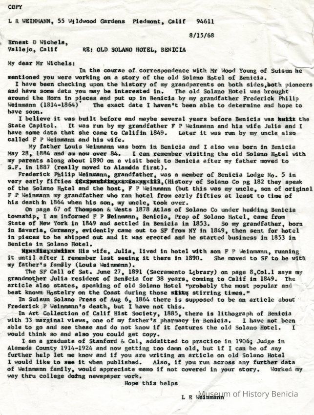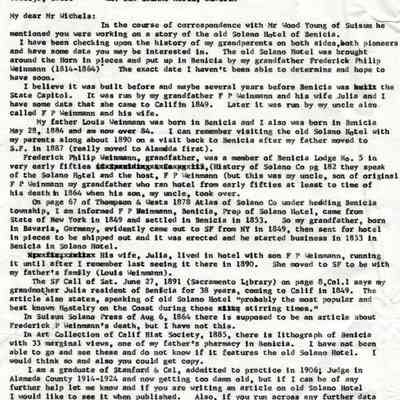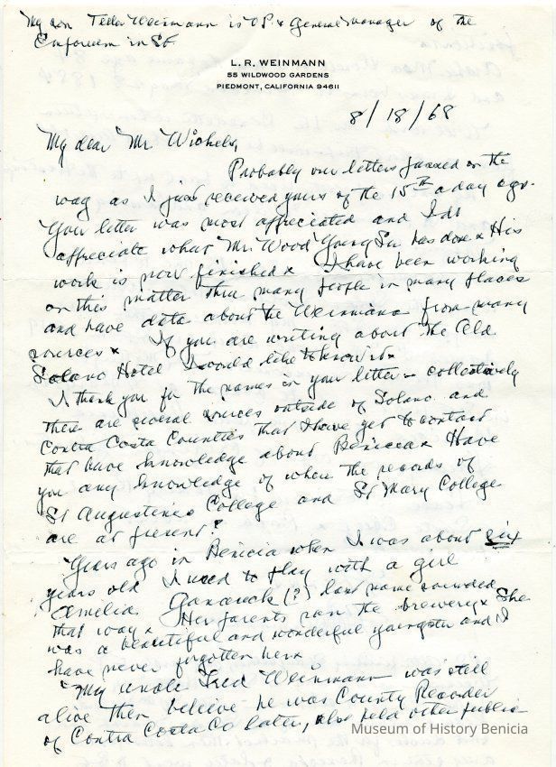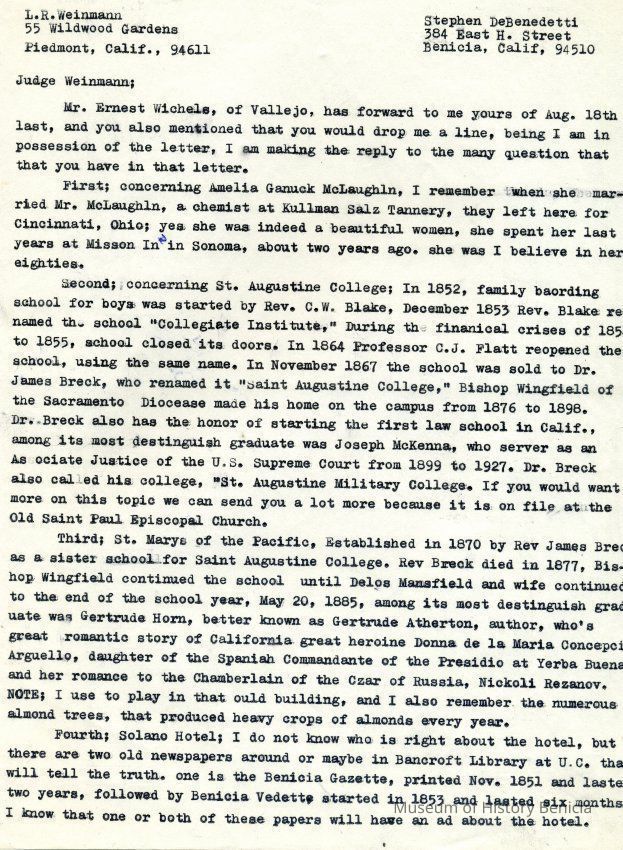 Correspondence - a group of seven letters which represent an exchange of letters in 1968 between L. R. Weinmann, Ernest Wichels and Steve DeBenedetti regarding Benicia History. Among the topics of Benicia discussion are The Solano Hotel, St. Augustine's College and St. Mary's College. There is also information about the Weinmann family, early settlers in Benicia. page sizes range from 7-1/4" x 10-1/2" to 8-1/2" x 11"; some of the letters are handwritten and others are typed.
