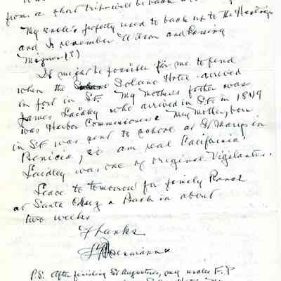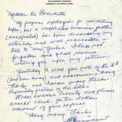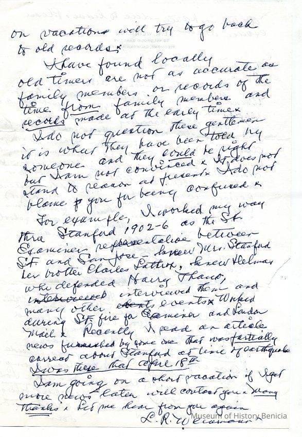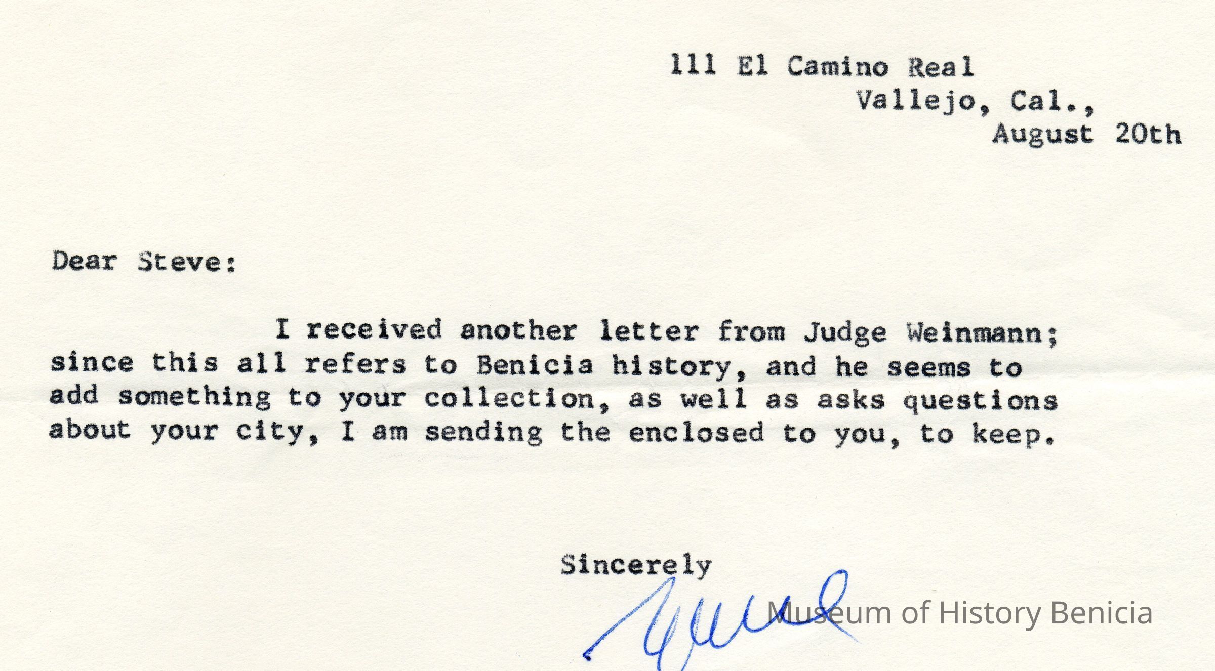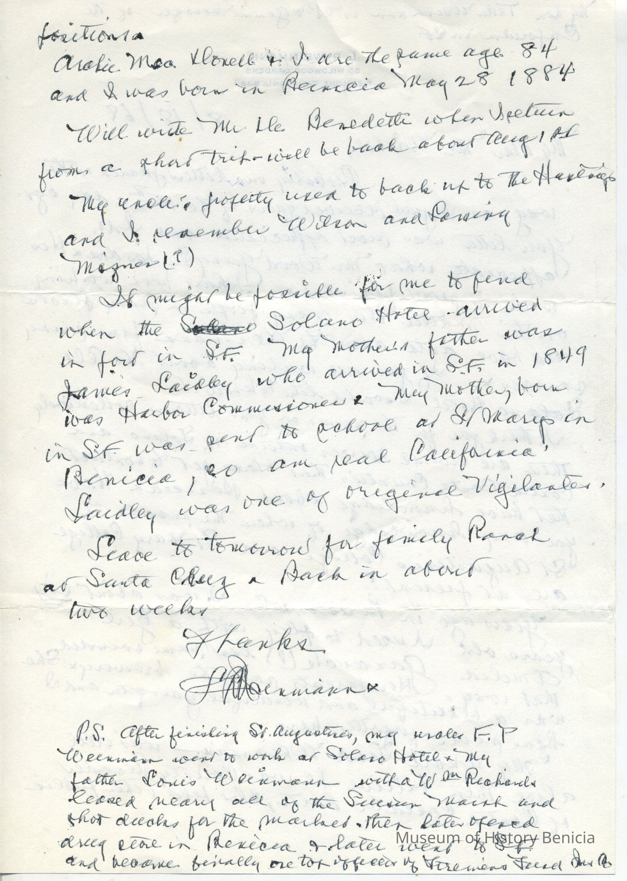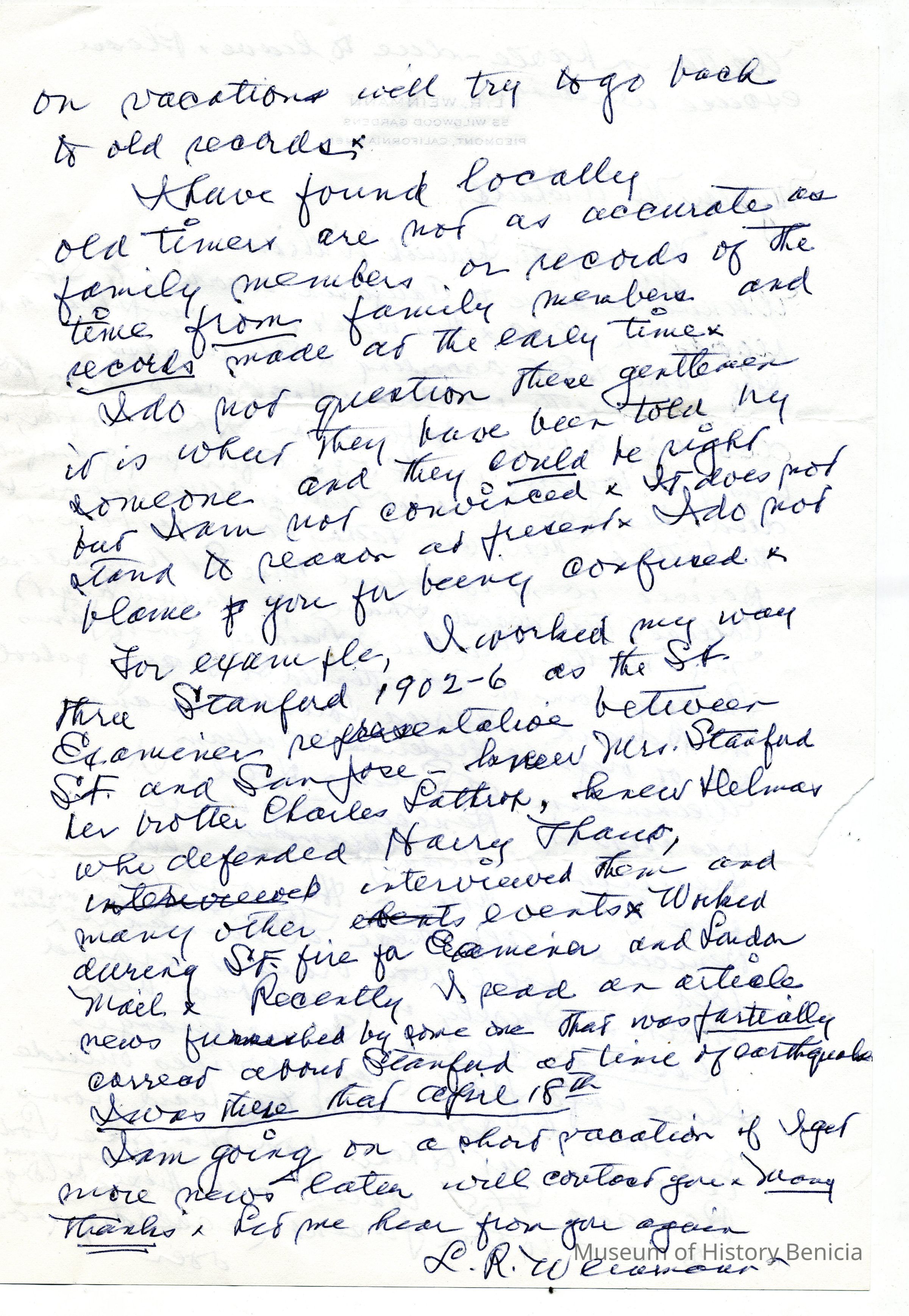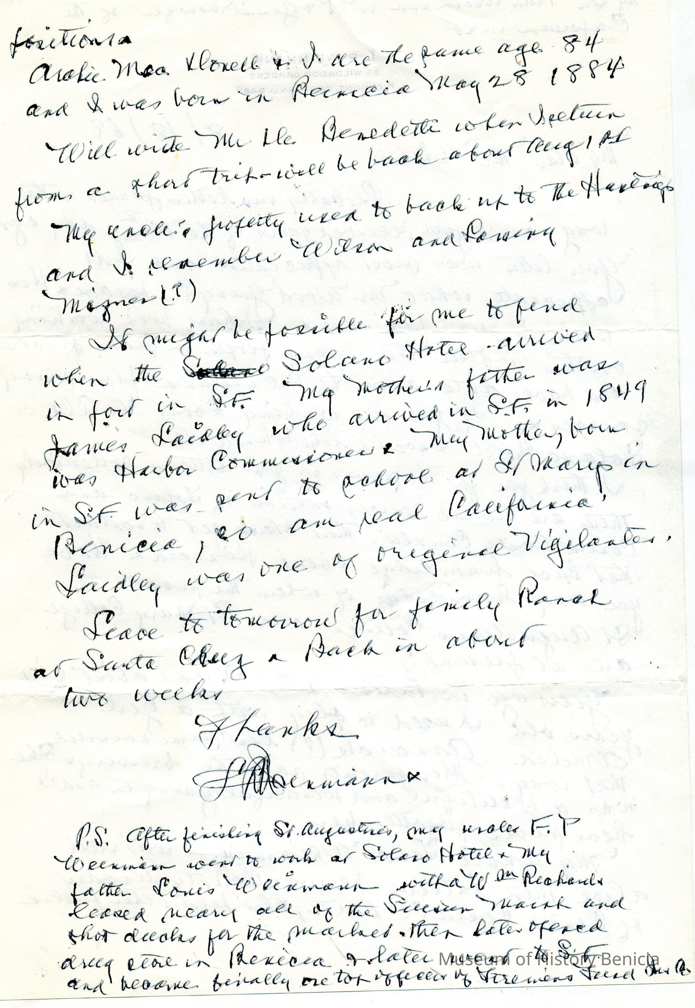 Correspondence - a group of seven letters which represent an exchange of letters in 1968 between L. R. Weinmann, Ernest Wichels and Steve DeBenedetti regarding Benicia History. Among the topics of Benicia discussion are The Solano Hotel, St. Augustine's College and St. Mary's College. There is also information about the Weinmann family, early settlers in Benicia. page sizes range from 7-1/4" x 10-1/2" to 8-1/2" x 11"; some of the letters are handwritten and others are typed.
