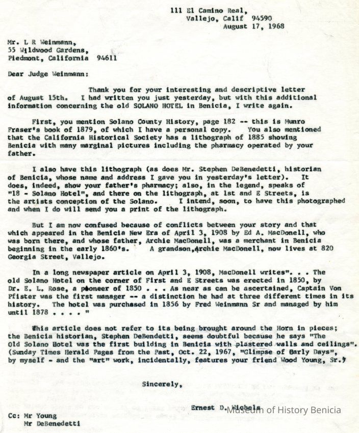 There is mention of the Solano Hotel in a Squibob article on Benicia in 10/03/1850 as the only hotel in Benicia. There is also an advertisement for selling the Solano Hotel in the Daily Alto California of 03/11/1853.Collection