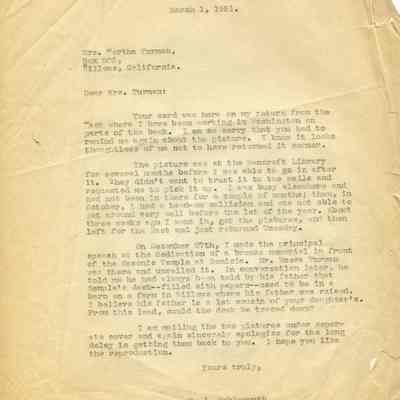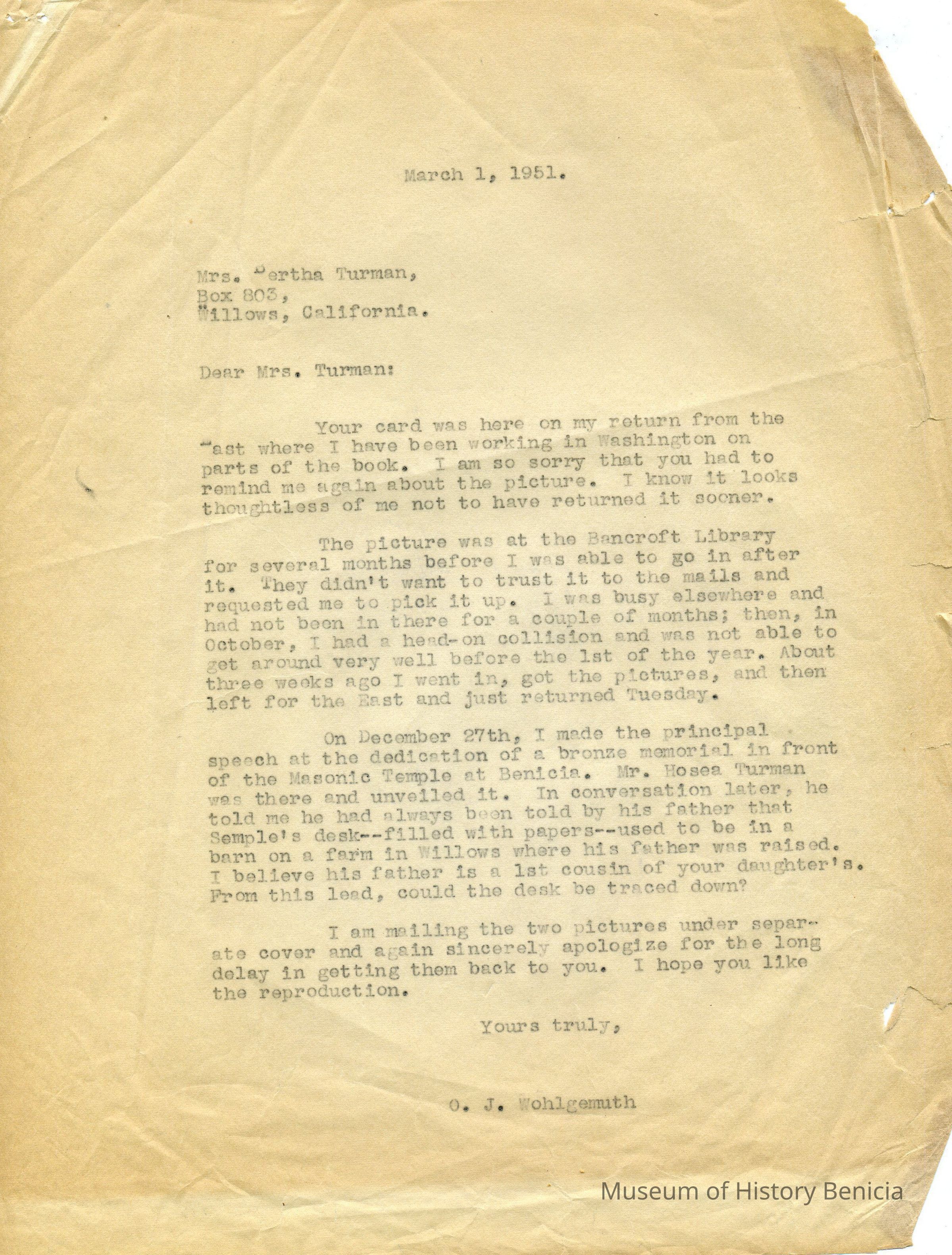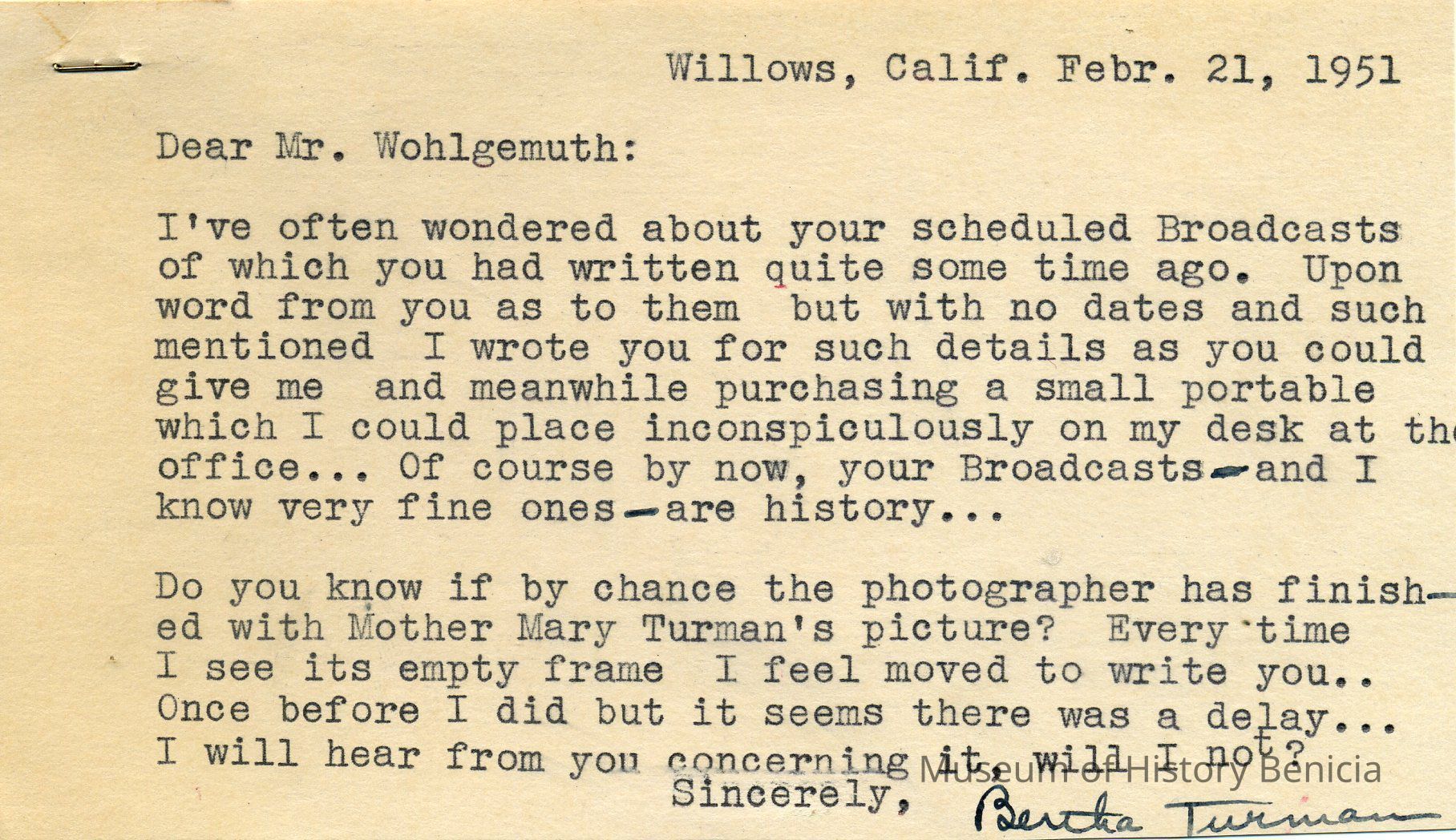A typed copy of a letter from O. J. Wohlgemuth, Walnut Creek to Bertha Turman, Willows, California is responding to a card sent by Ms Turman. Her card is attached to the letter.