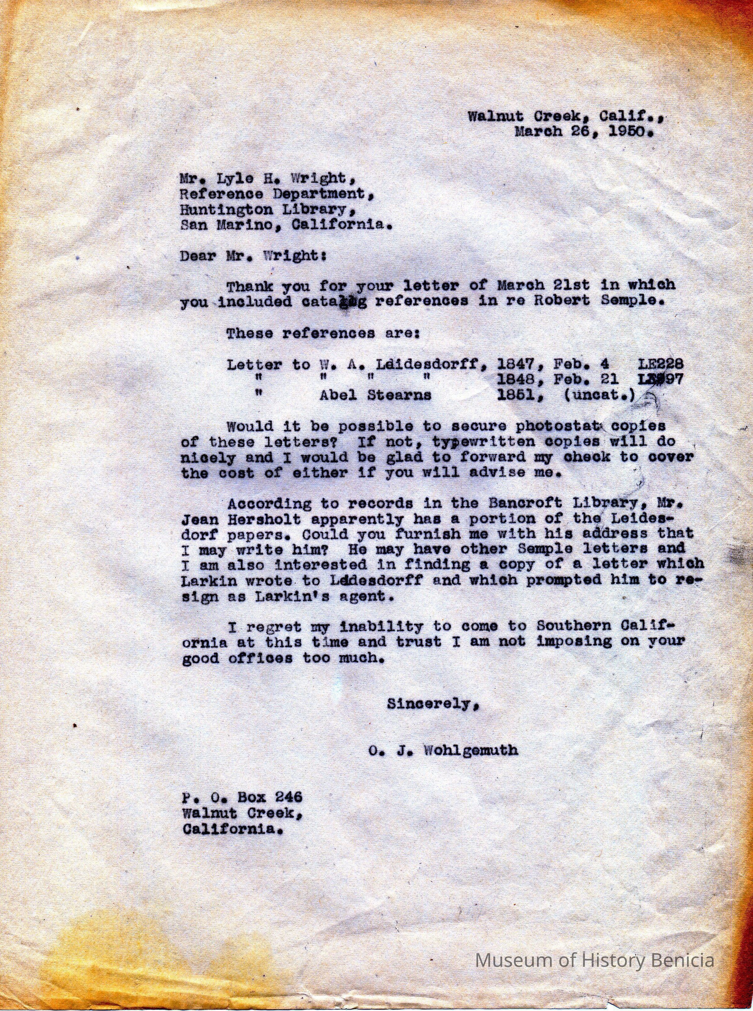 Carbon Copy of letter sent to the Huntington Library reference section San Marino, California by O. J. Wohlgemuth, Walnut Creek written in 1950 in which he asks for copies of three letters written in 1847-51.