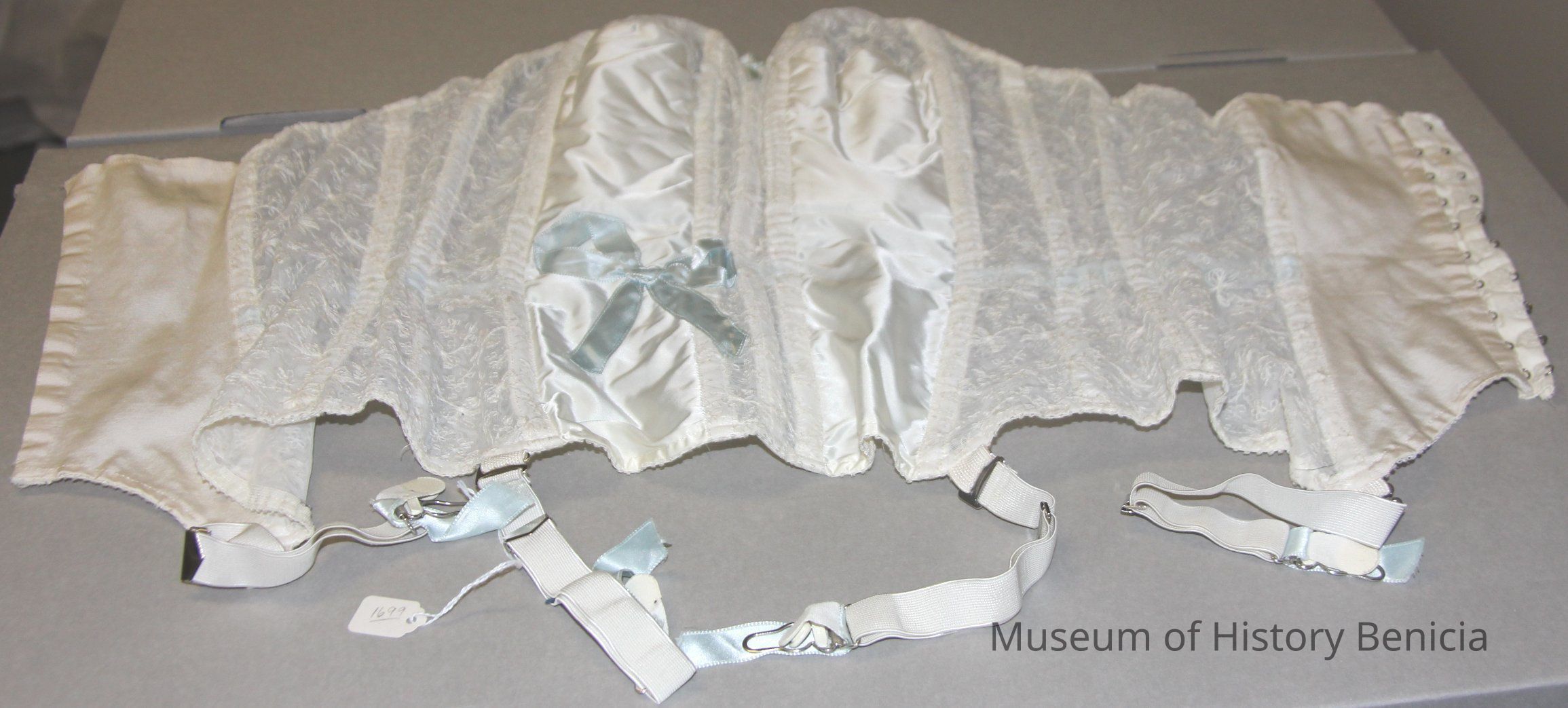 Wedding corset. White elastic and lace with embroidered blue ribbon bow. 4 garters 10 hooks and 20 eyes. Size 36C inventory number 1699