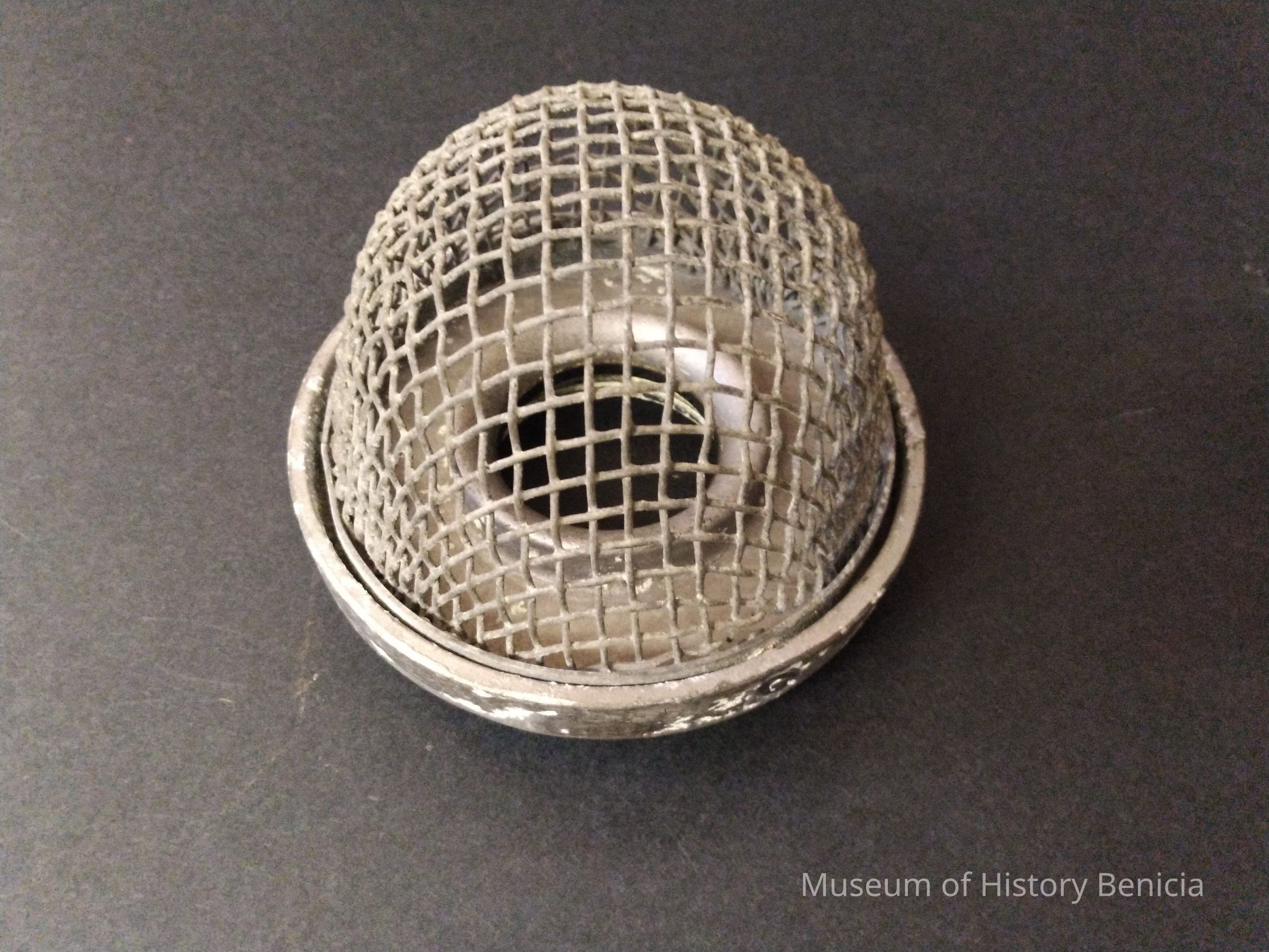Metal Bracket with cage cover - wire mesh. Looks like a cover for a lightbulb