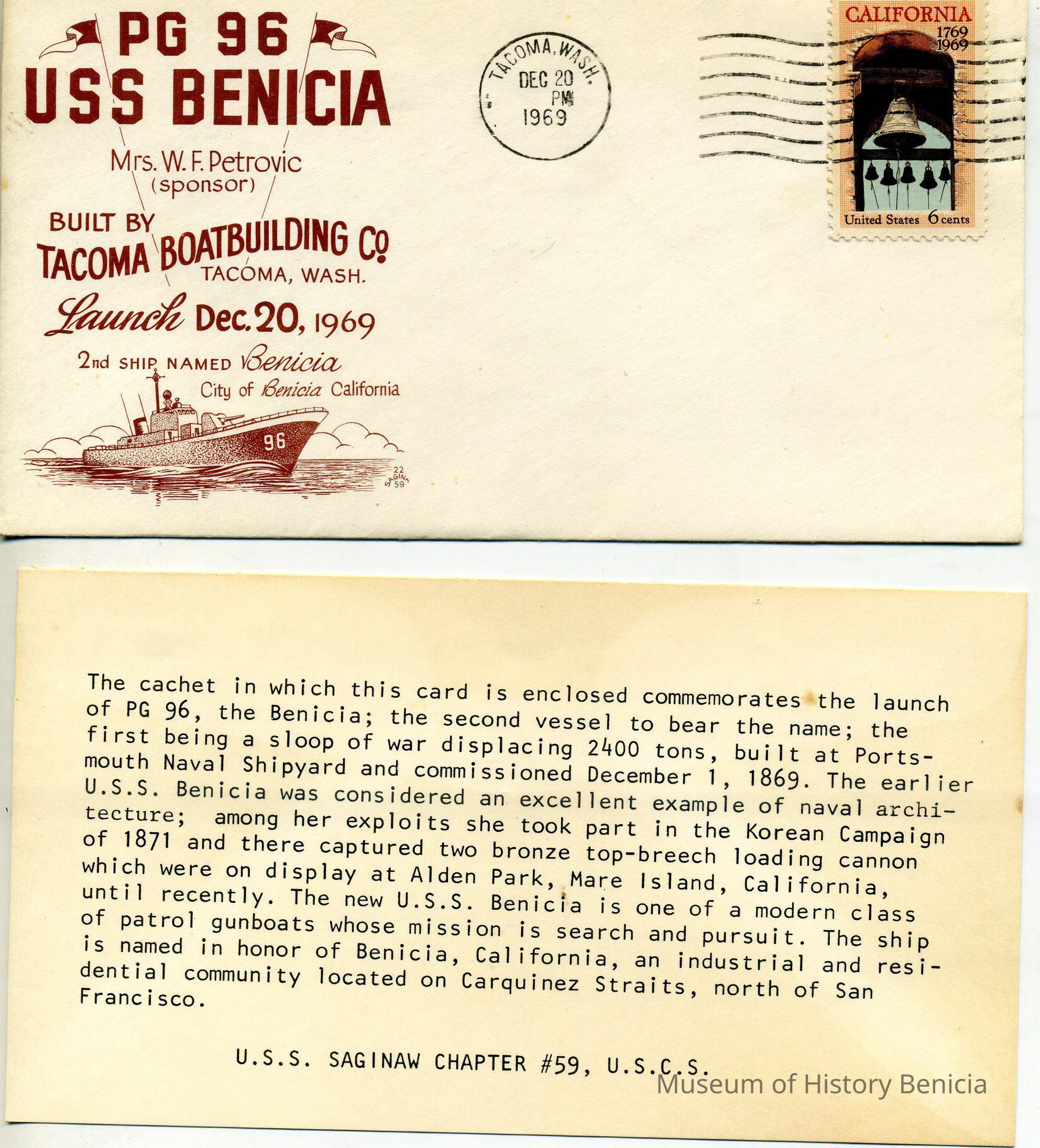 "PG96 / USS Benicia / Mrs. W.F. Petrovic / (sponsor) / Built By / Tacoma Boatbuilding Co. / Tacoma, Wash. / Launch Dec. 20, 1969 / 2nd ship named Benicia / City of Benicia California" Stamped (6 cents) and cancelled "Tacoma Wash. Dec. 20 PM 1969"