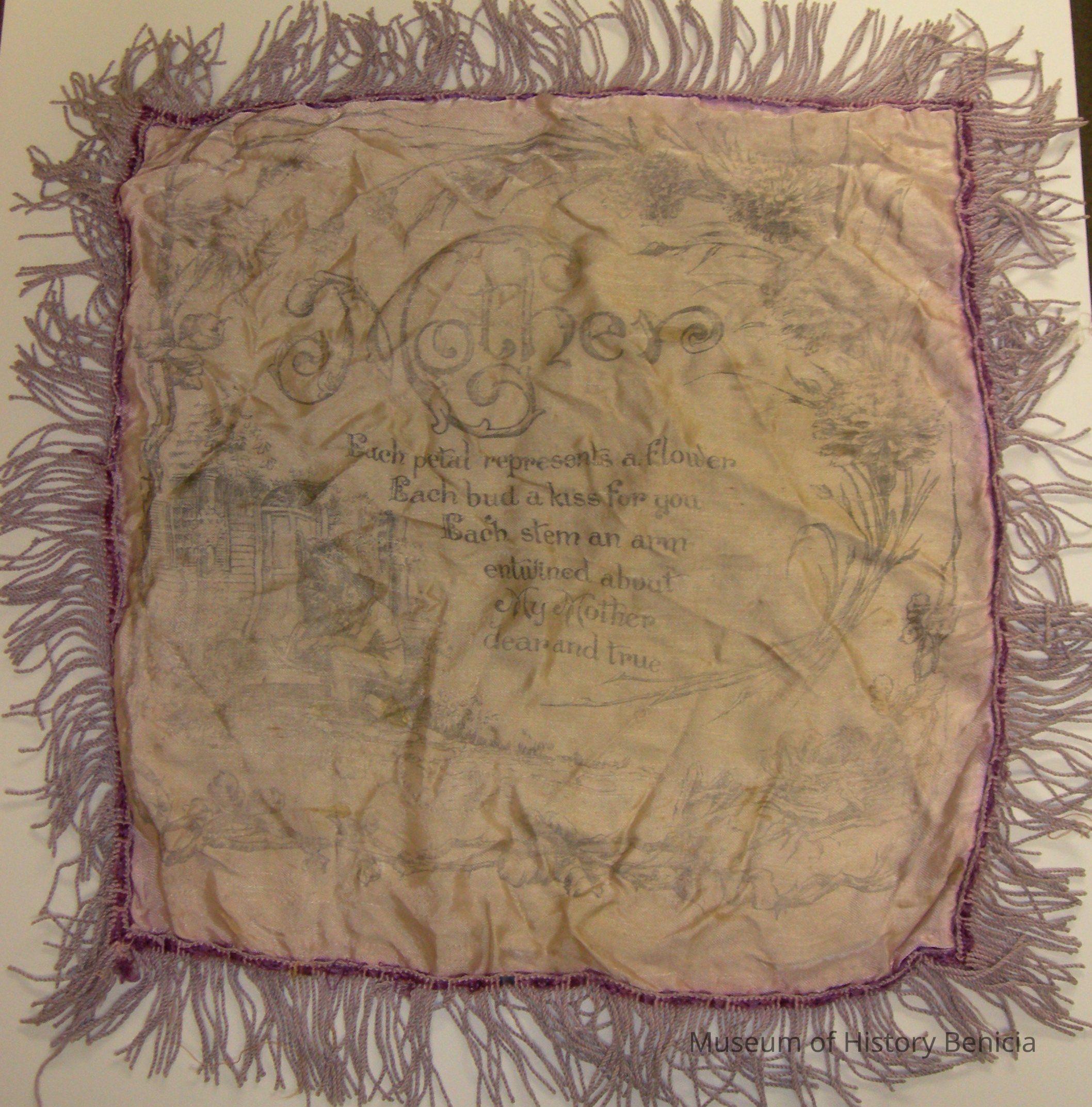 faded lavender silk top, cotton back, lavender fringe, drawing in black ink (faded): a young man and an older woman on a front porch section of a house, various flowers are drawn around the edge (carnations, roses) no service name is indicated