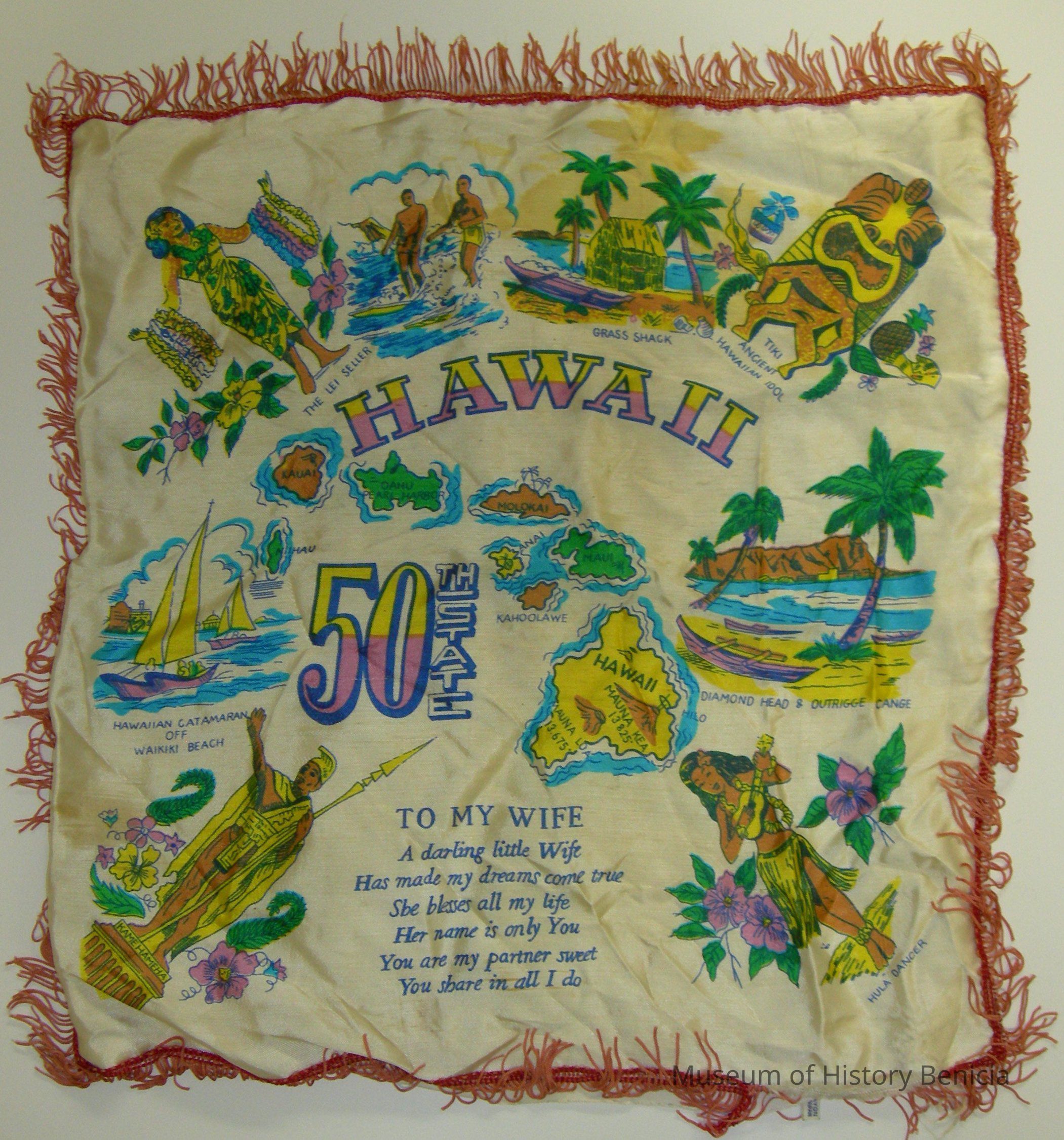 cream rayon per tag, (made in Japan) front and back, red fringe, multi color pictures with state information about islands and landmarks.