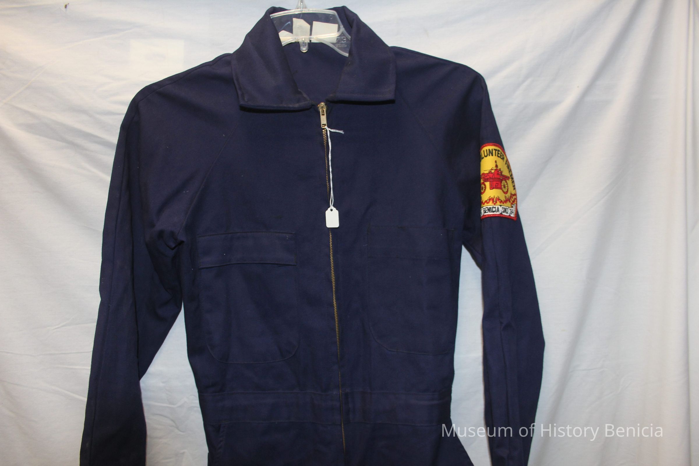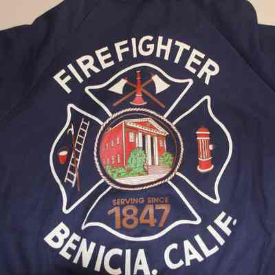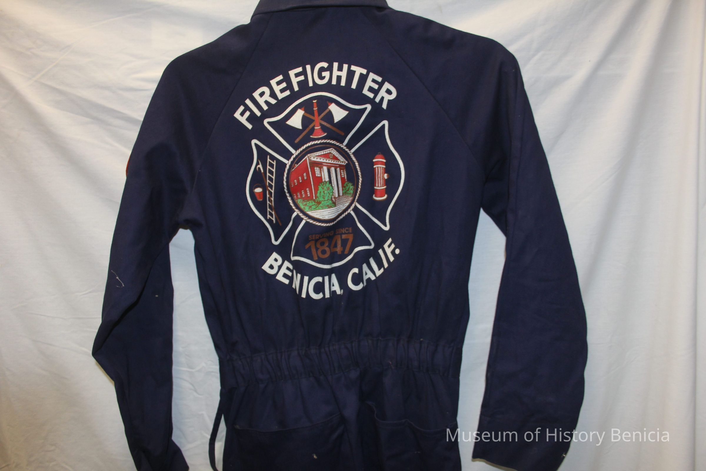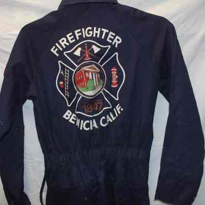Dark or navy blue long sleeved fire uniform coverall. Brand unknown. 100% cotton heavy twill, fire resistant. Size small. Half zipper front closure with snap closures at cuffs. Benicia Volunteer Firemen patch on left shoulder. Large screenprint on back with Firefighter, Benicia CA in large white block letters. Patch pockets front and back.Collection