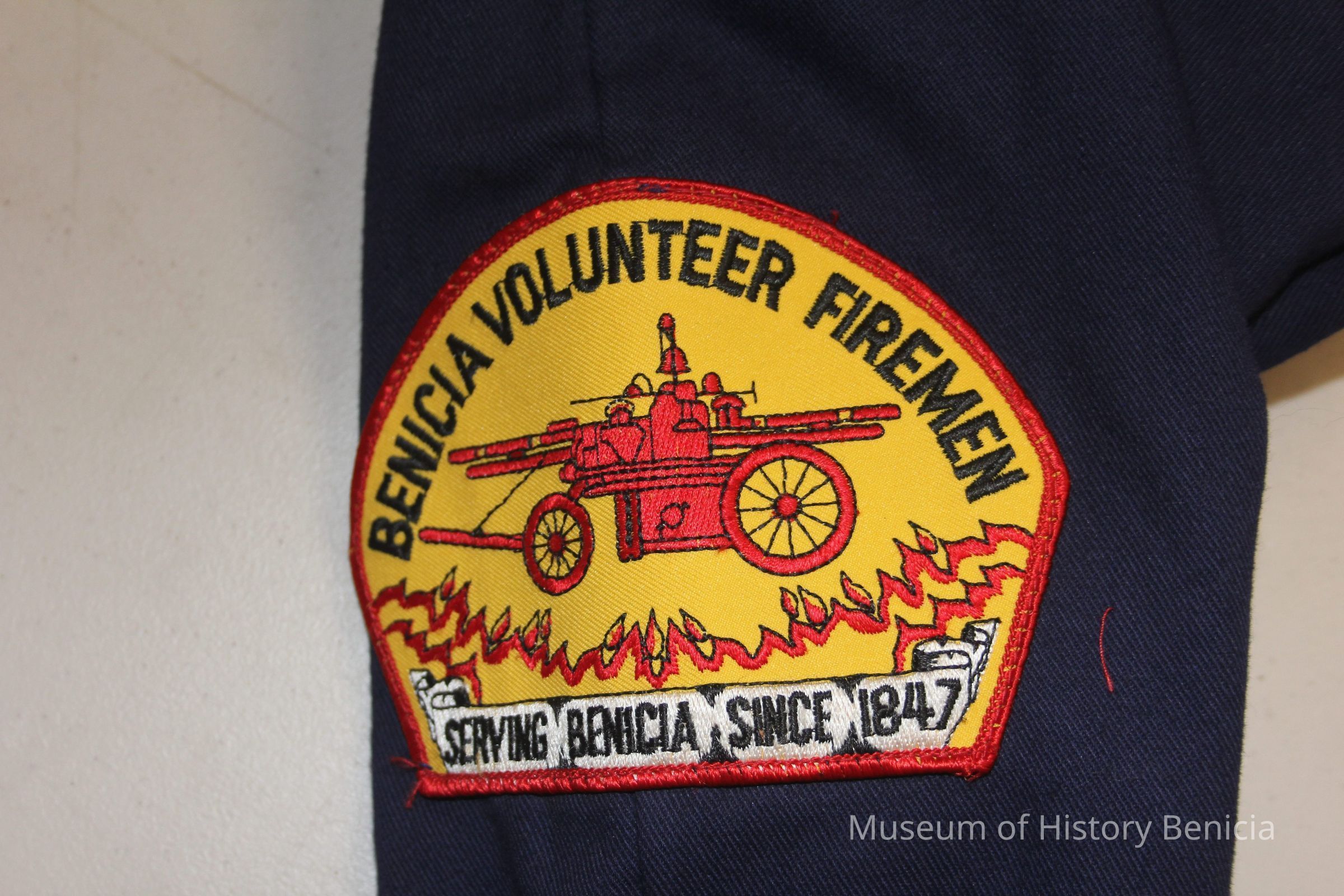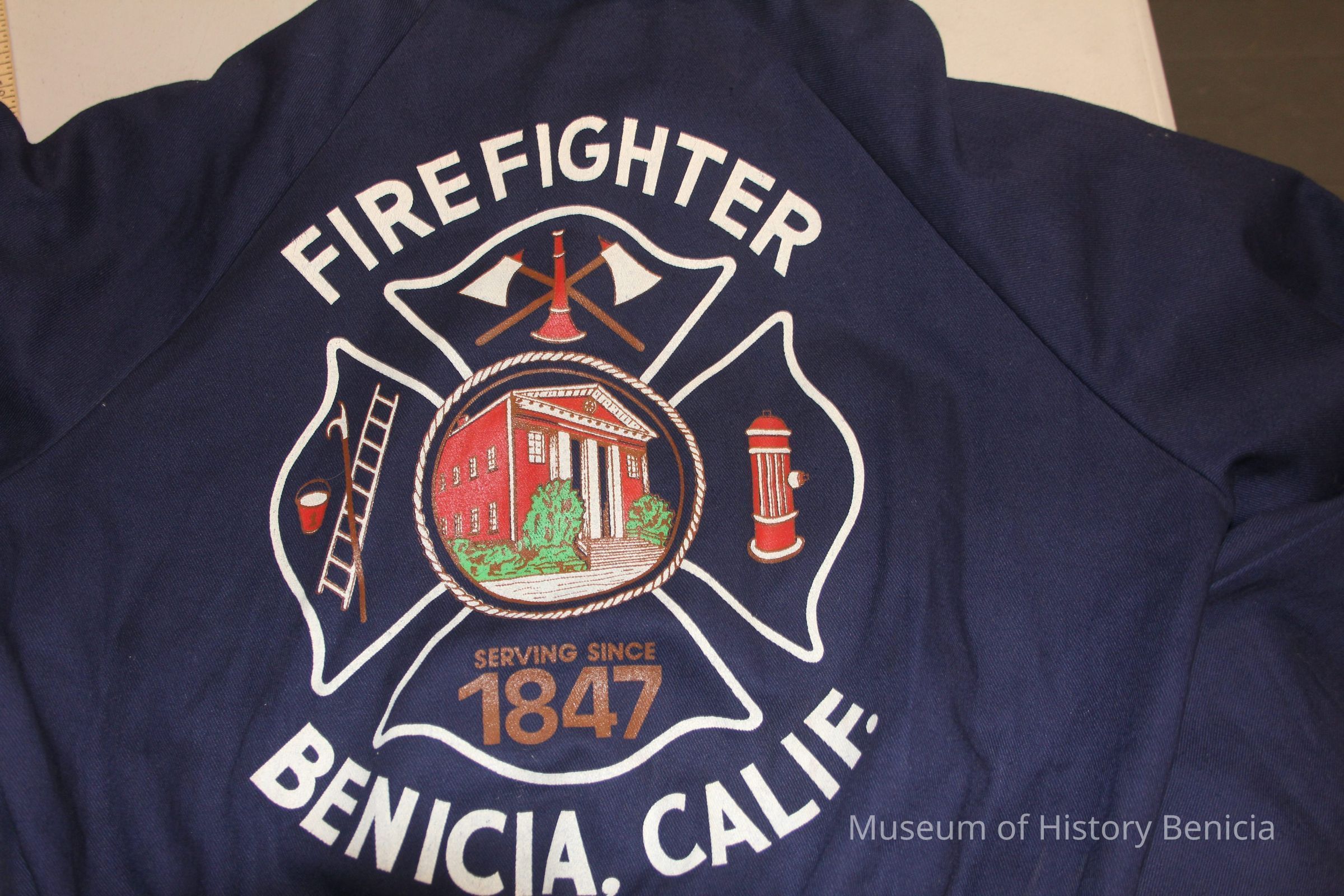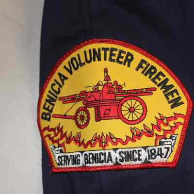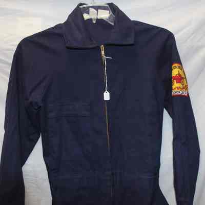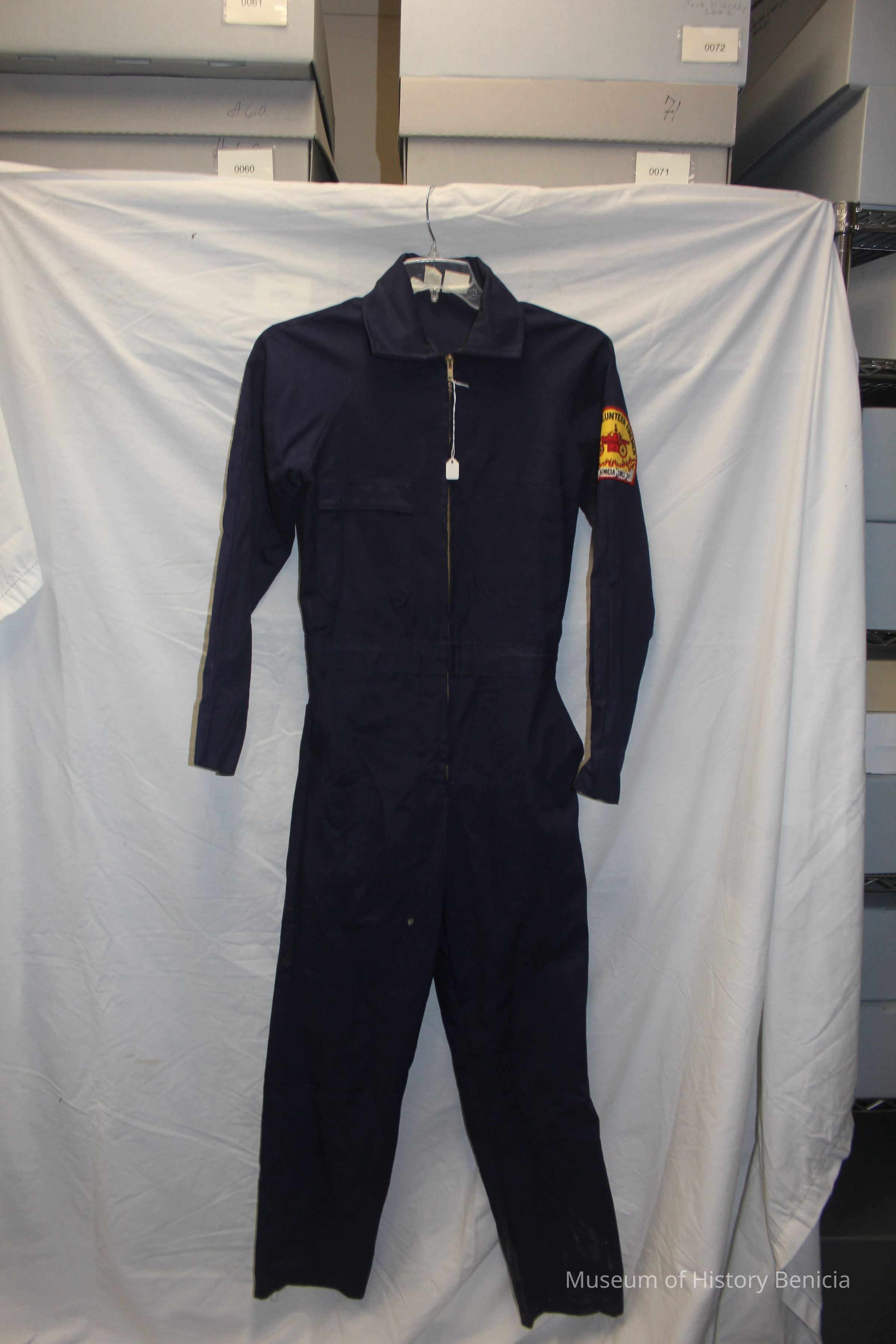 Dark or navy blue long sleeved fire uniform coverall. Brand unknown. 100% cotton heavy twill, fire resistant. Size small. Half zipper front closure with snap closures at cuffs. Benicia Volunteer Firemen patch on left shoulder. Large screenprint on back with Firefighter, Benicia CA in large white block letters. Patch pockets front and back.Collection