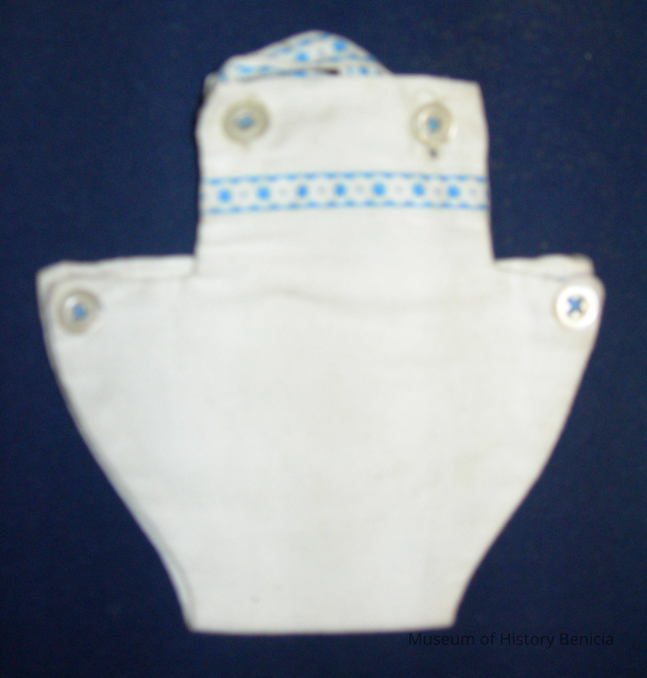 doll one piece coveralls/romprs - bib style with botton closing straps; button trim w/snap closure at hips, no pant legs; white cotton with blue and white straps and trim on bib.Collection