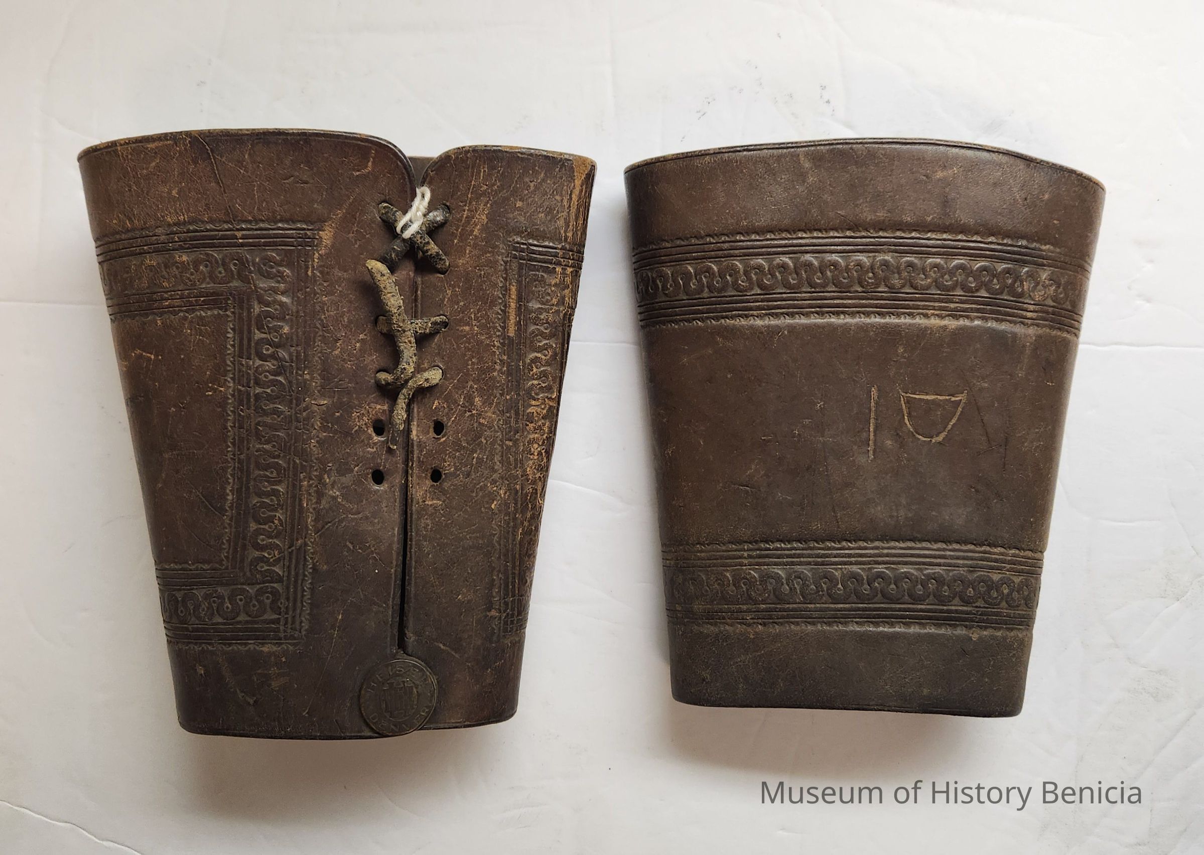 A two-piece set of brown leather wrist cuffs with a snap and leather laces on each one. There are decorative carvings in the leather.