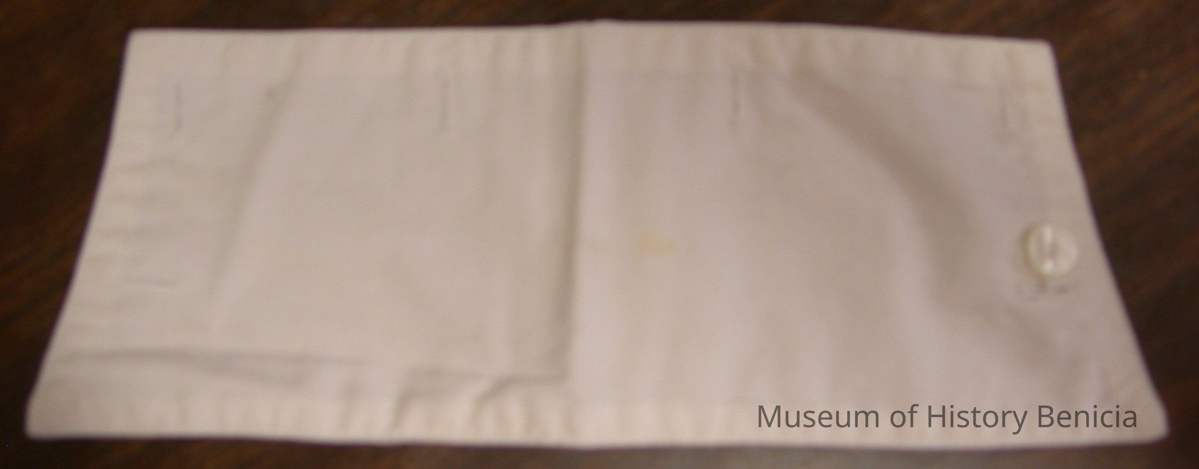 Sleeve Cuff - white - one button and one button hole for closing; four button holes for attaching to a sleeve edge; 3-3/4" width x 10" and 8-1/4" lengths