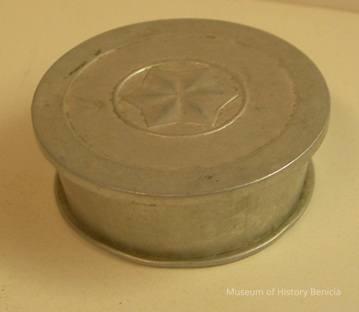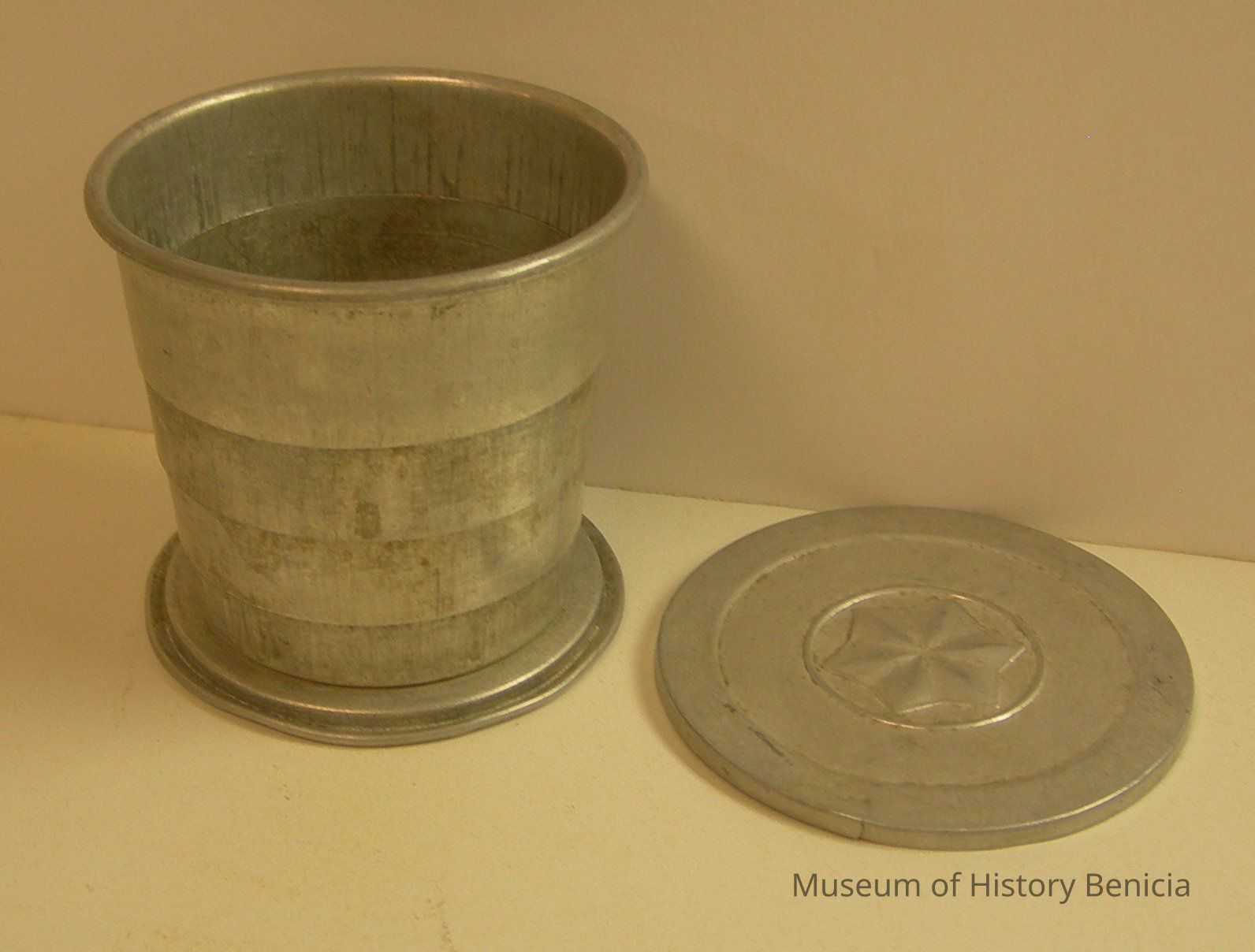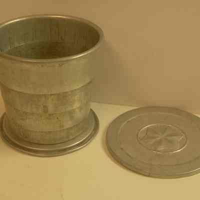 Collapsible, aluminum cup with lid; star molded into lid; open: 2-3/8" deep x 2-1/2" diameter; closed:1" deep x 2-3/4" diameter