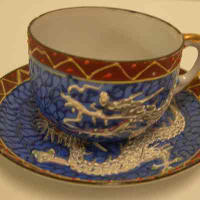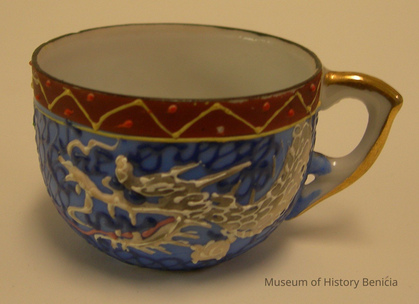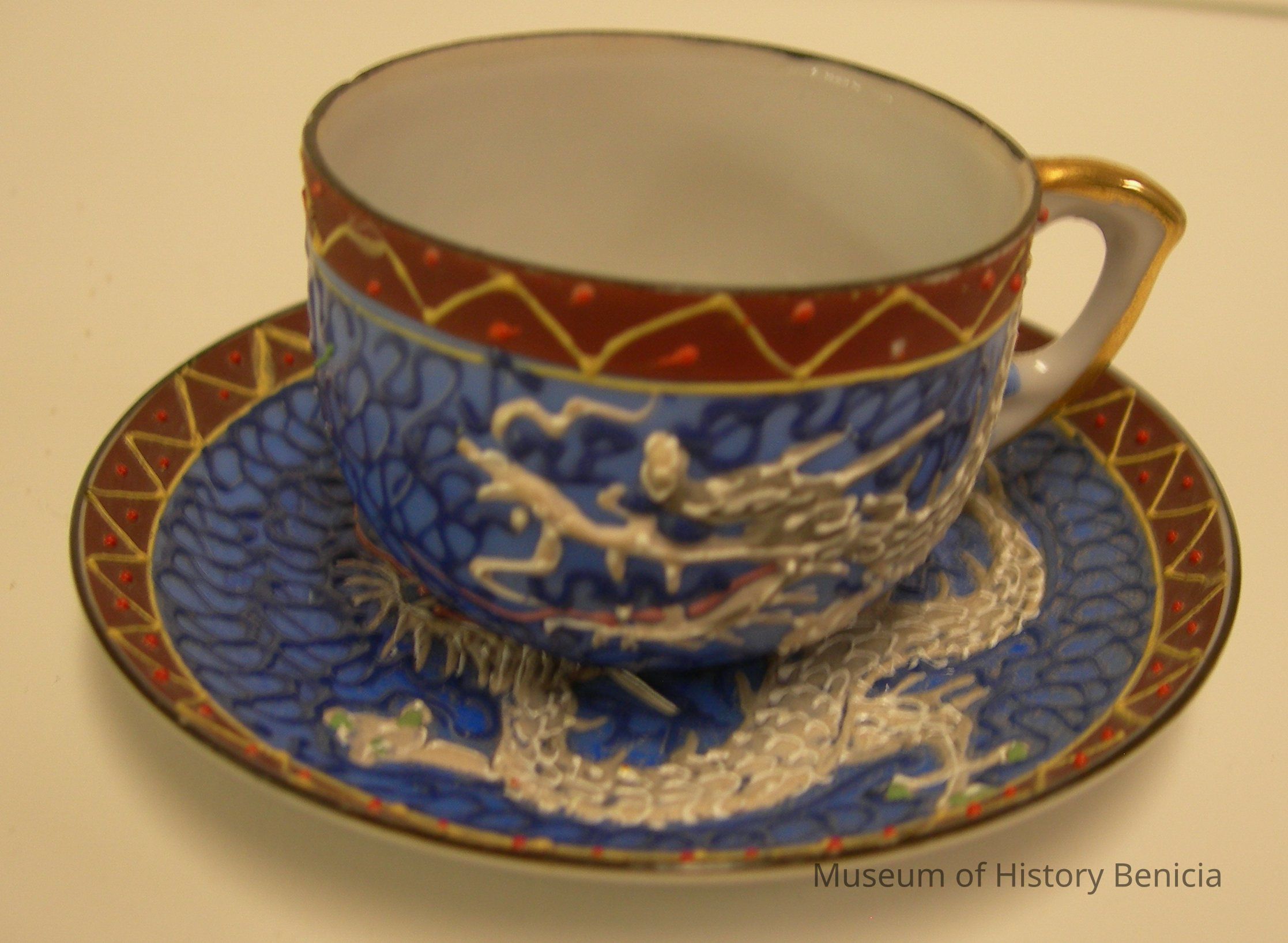 Raised relief (sculptual detail) gray dragon and blue background with brown edging at rim, gold detail on handle
