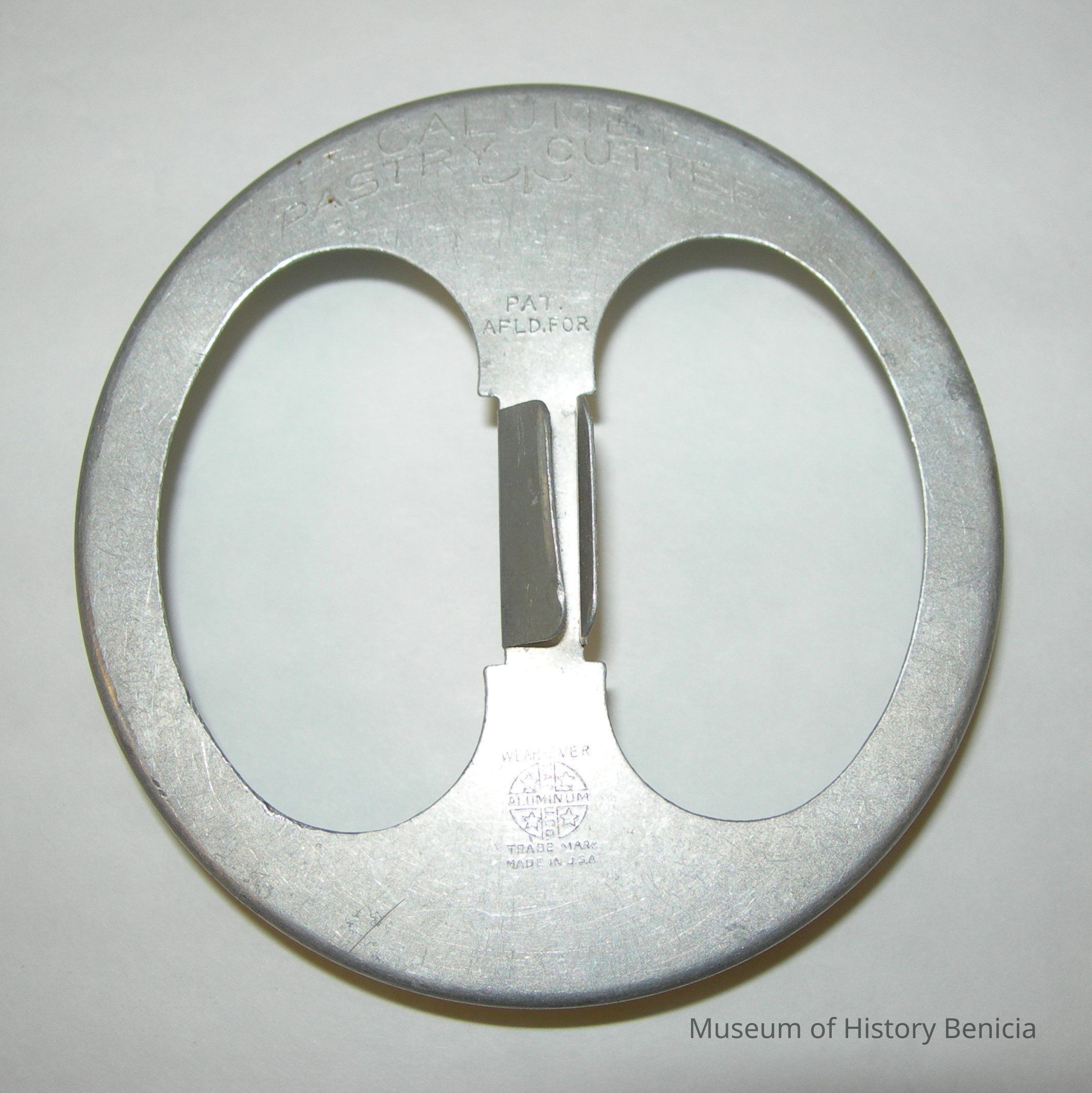 round, silver metal "Pastry Cutter" from Calumet brand, two holes and short handle on top