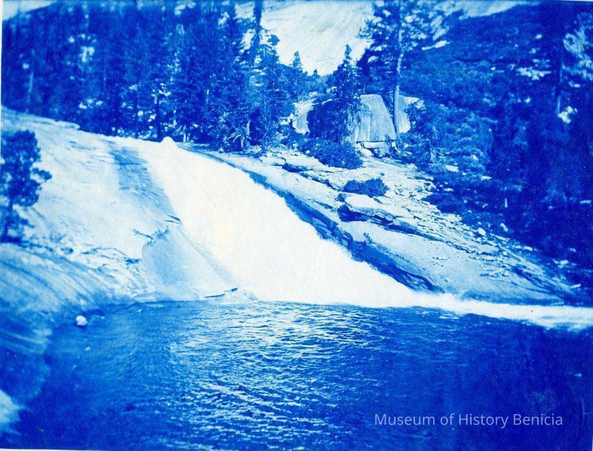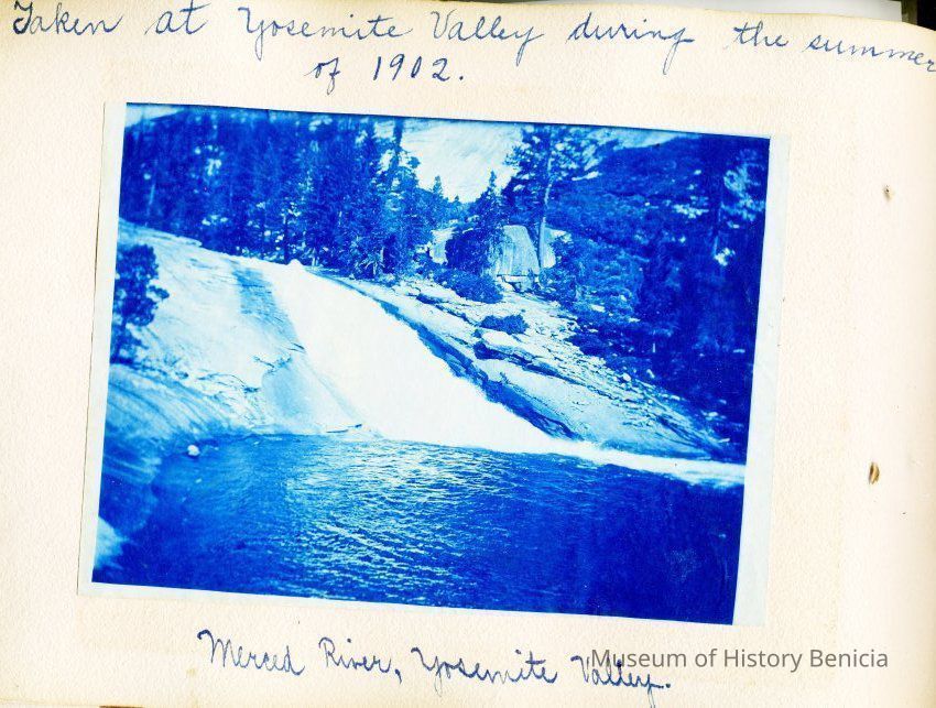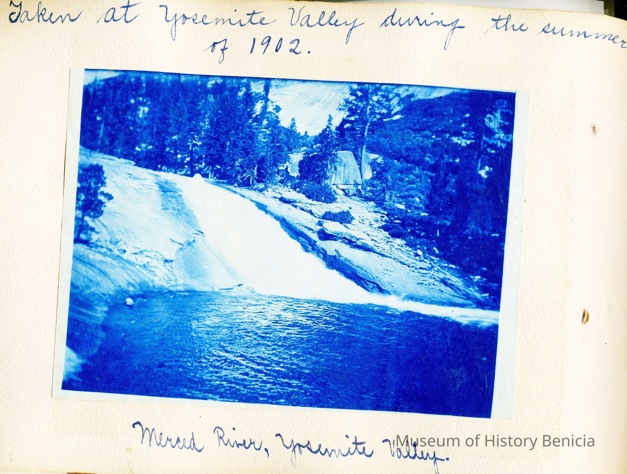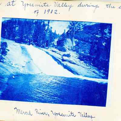 This is a scan of one of the pages in that album. It shows a Cyanotype photo of the Merced River in Yosemite Valley during the Summer of 1902.Collection