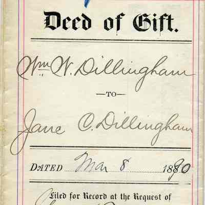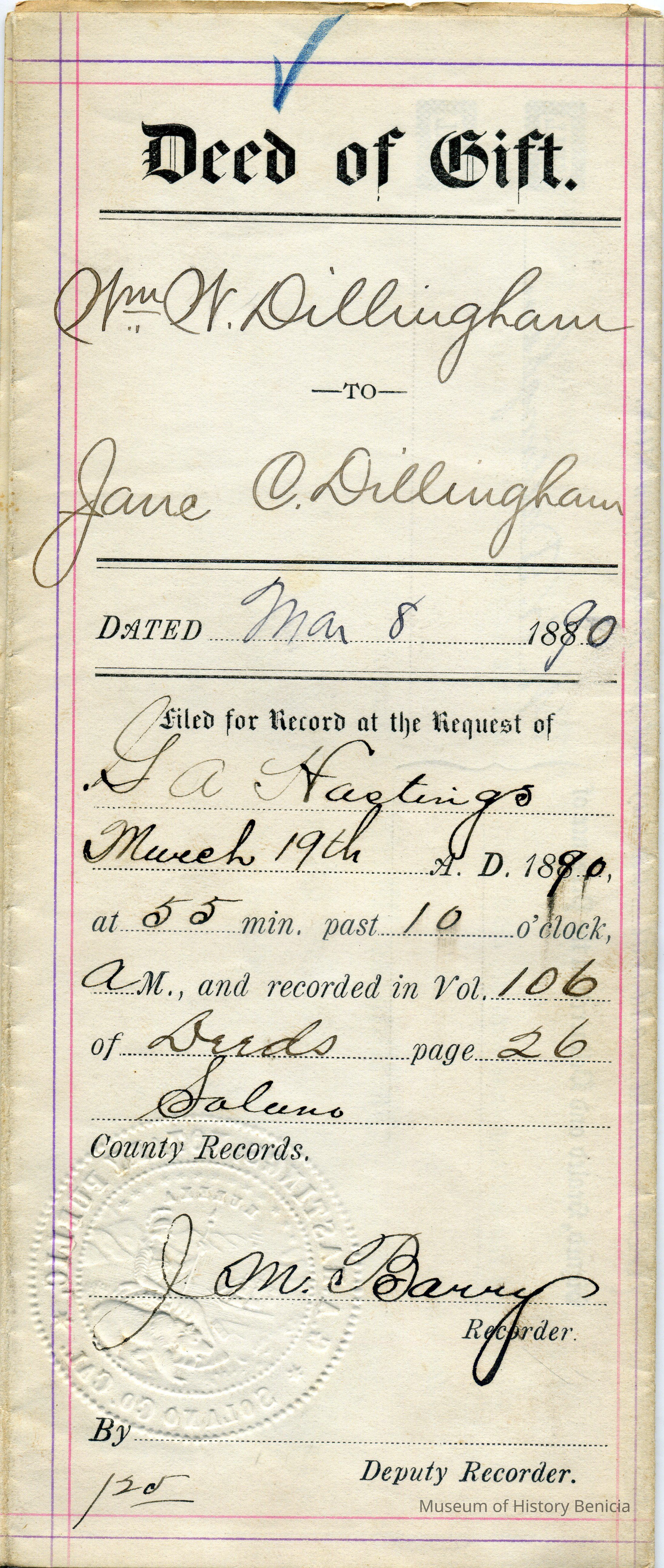 This is a deed transferring property from William W. Dillingham to Jane Dillingham, his wife, on 03/8/1890. The property was the East 2/3rds of the West half and the East half of lot 3 block 13 in Benicia.