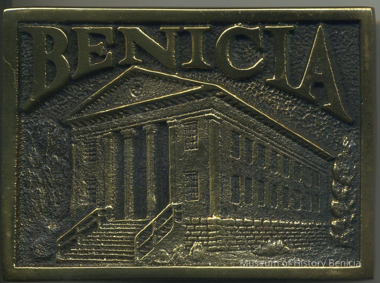 Commemorative Belt Buckle - 2-1/4" x 3" brass: "Benicia" Buckle with a representation of the capitol building on the front; clip and hook to attach to belt on back; also on back: "Solid Brass", "Made in USA", "D. Stewart & Co. Ione, Calif. 1852", "Limited Edition"Collection
