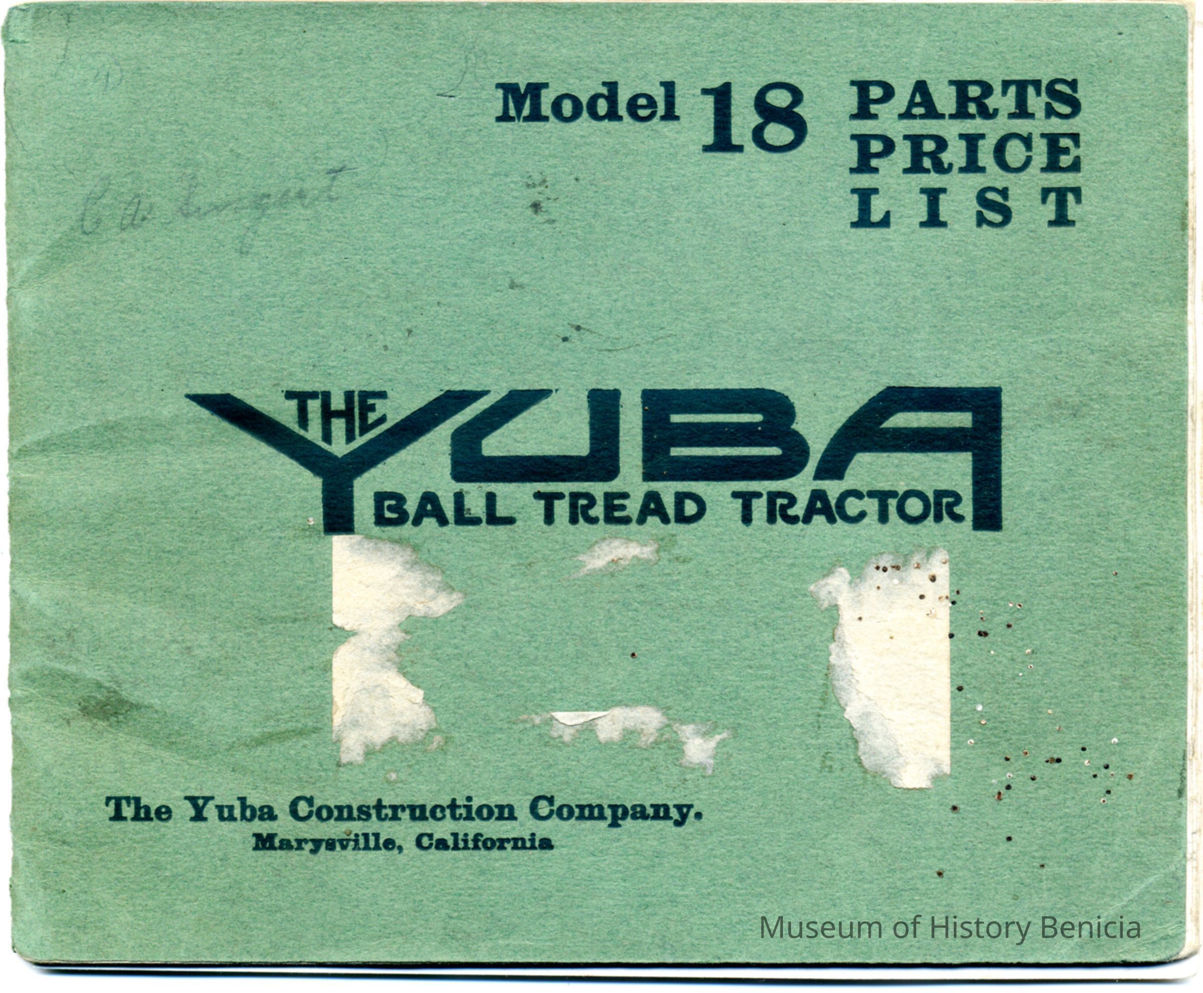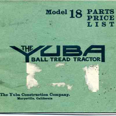 Parts list book for Yuba Ball Tread tractor- Model 18. No engine parts listed. Tractor Made at Marysville. 32 pages and covers