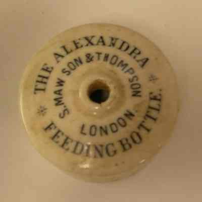 Slide on ceramic bottle cap - "The Alexandra Feeding Bottle" "S. Maw Son & Thompson London", has a hole in top middle; use is unknown; 1-5/8" diameter x 3/4" tall