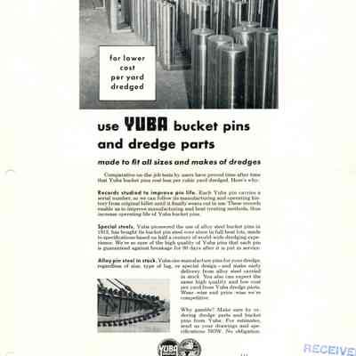 Advertisement for Yuba bucket pins and dredge parts Sept, 1956