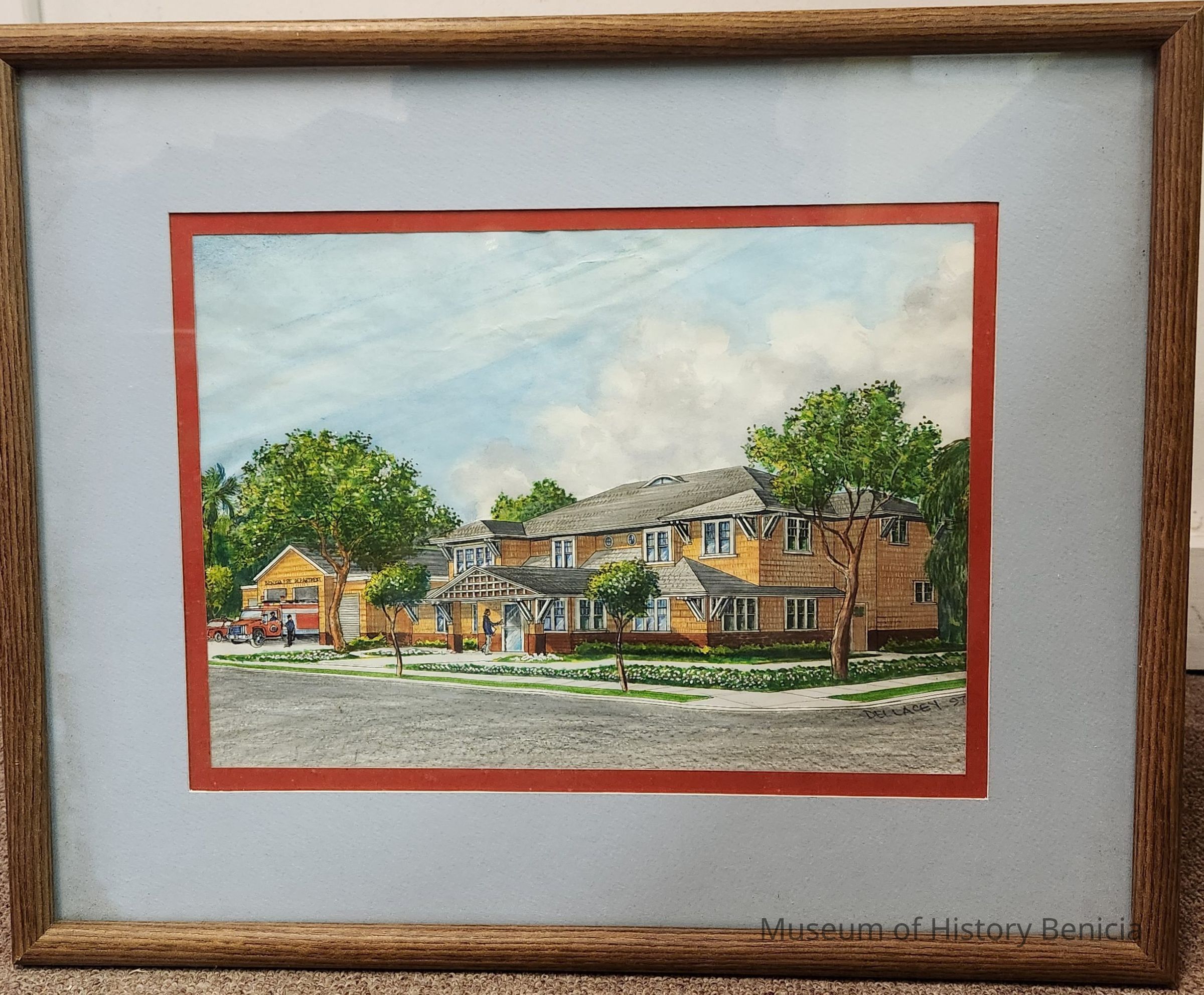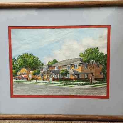 Color drawing (artist concept) of current firehouse by Del Lacey in 1997 framed and matted under glass.