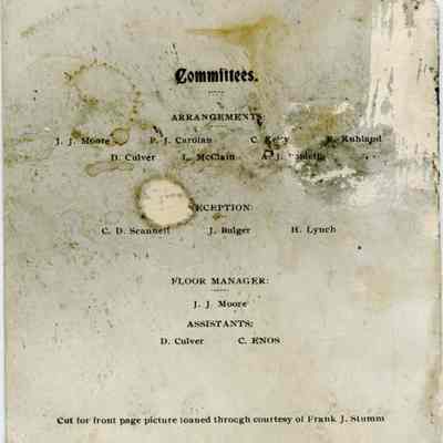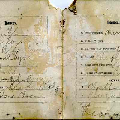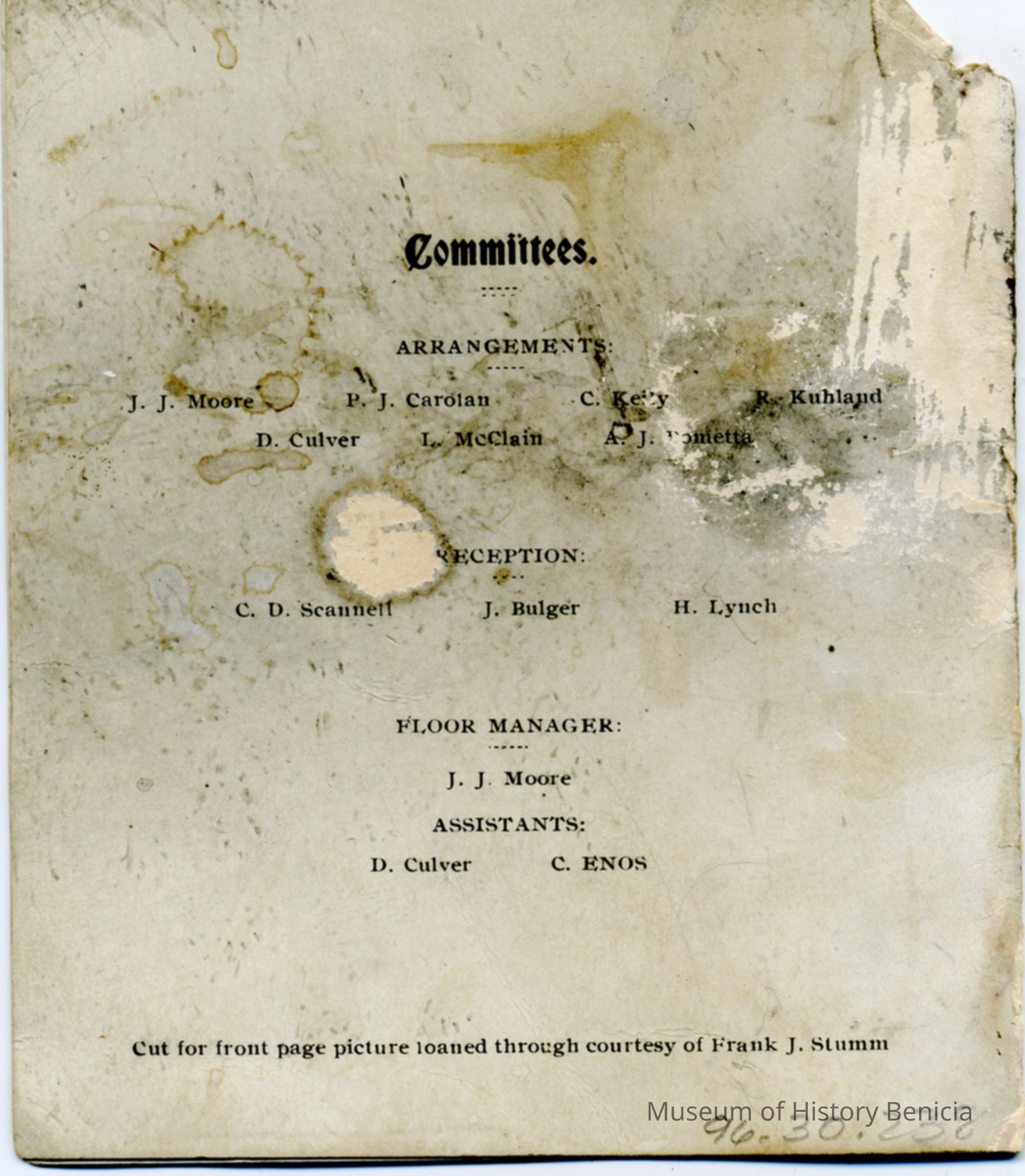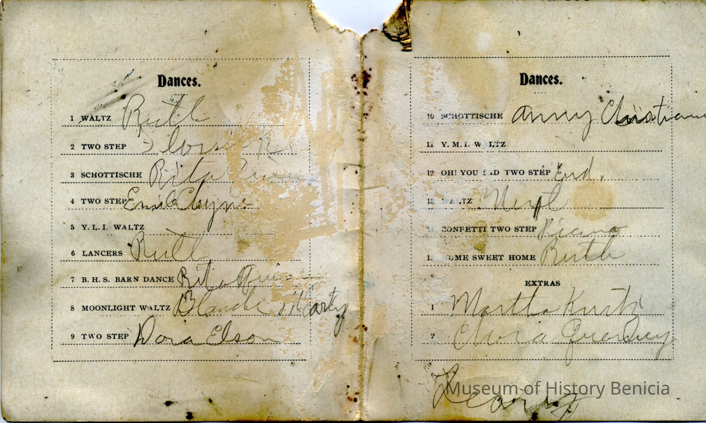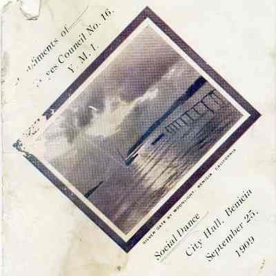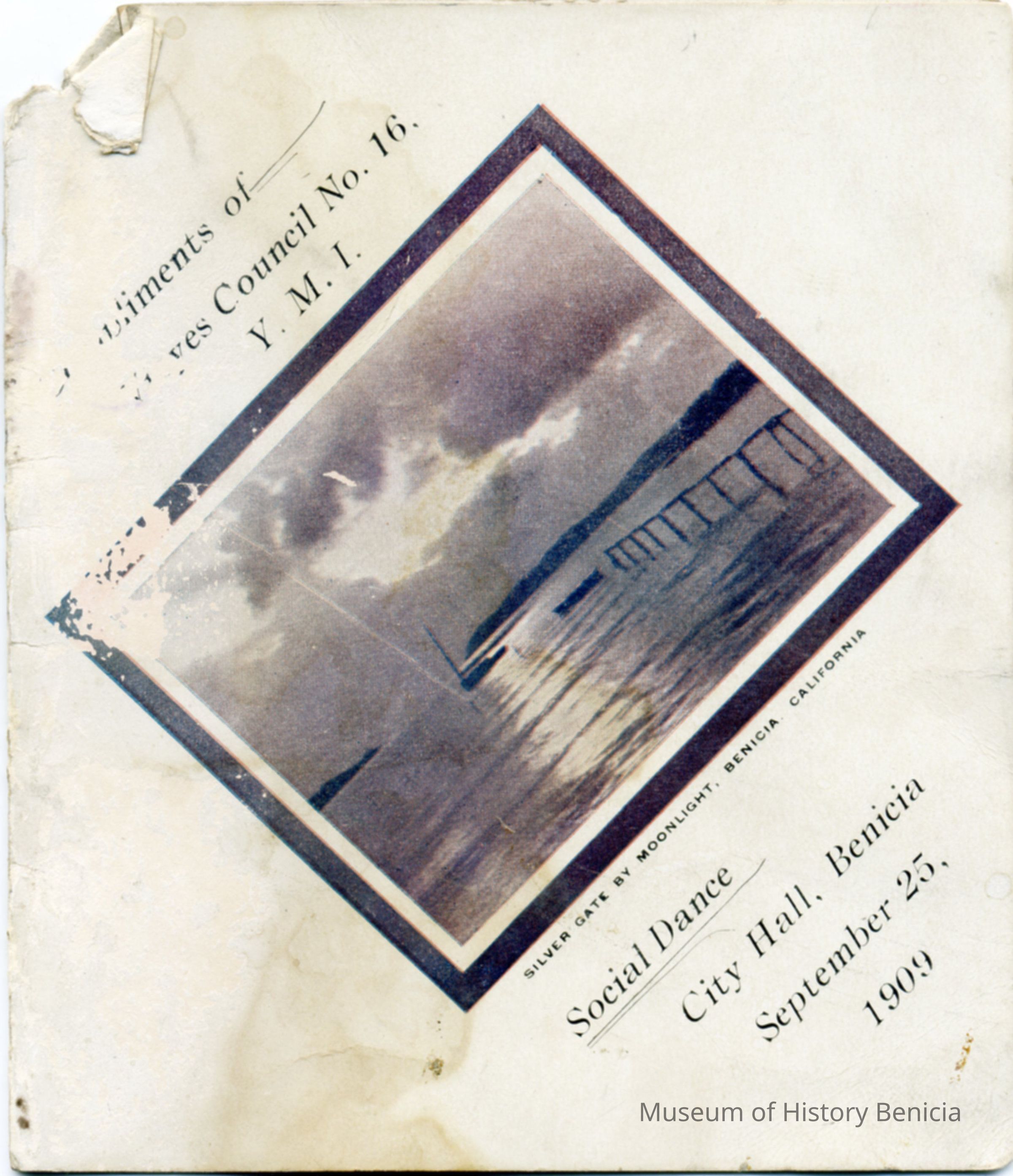 Card for a dance in City Hall, Benicia Sept. 25, 1909. It was put on by the Young Men's Institute Council No. 16. The photo on the cover is by Frank Stumm and is of the "Silver Gate by Moonlight". Inside are the names of the women that this person danced with. Most are just first names; Rita, Ruth, etc. Some have both first and last names. The ones I can read are: Rita Quinn, Blanche McCarthy, Dora Elson, Amy Christian, and Martha Kurtz.