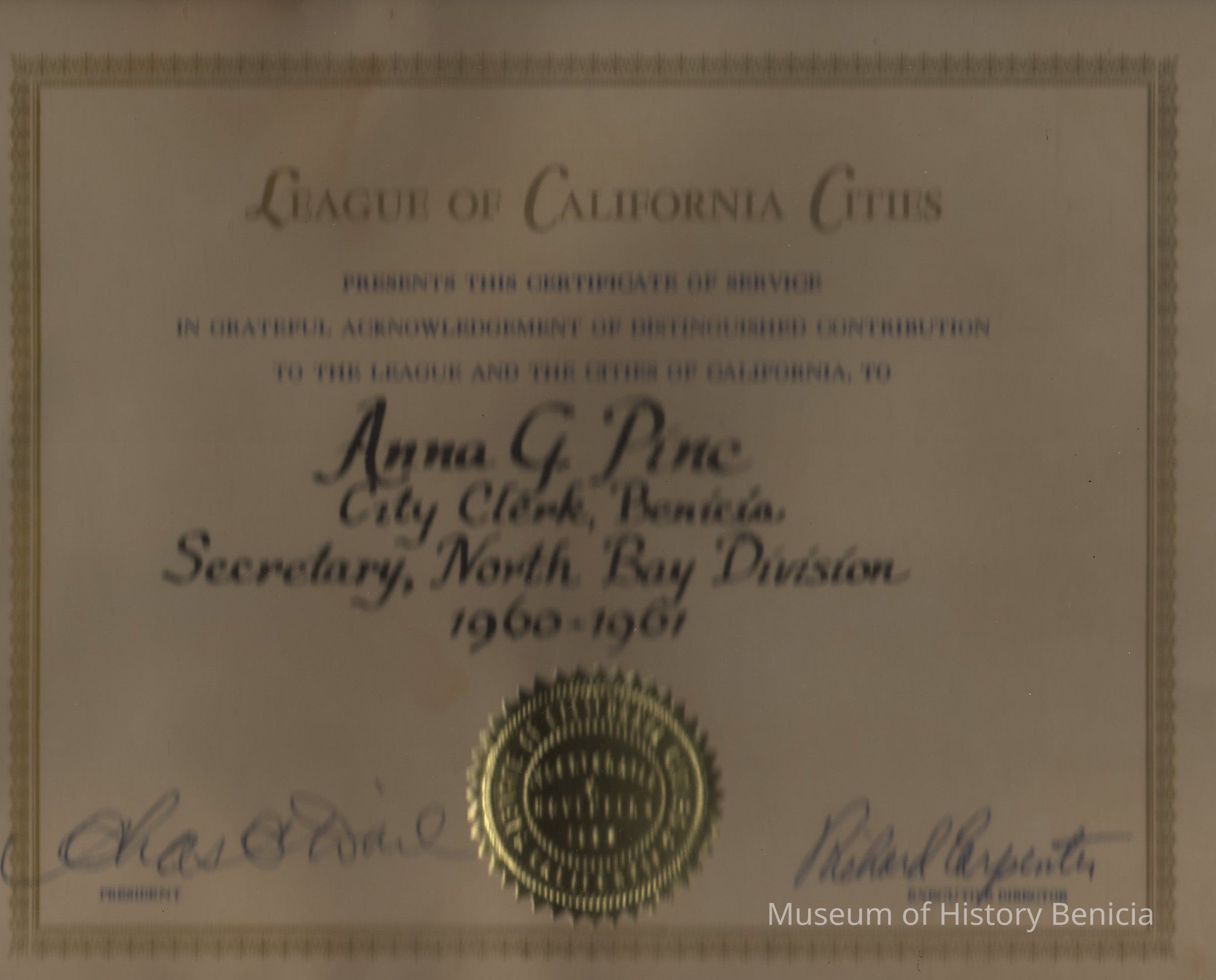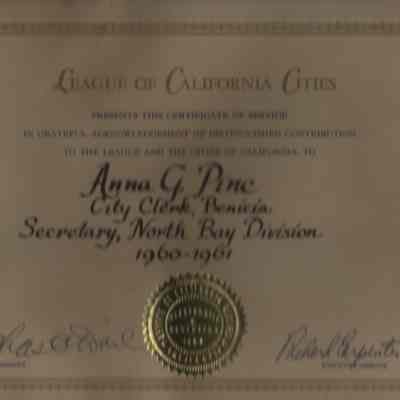 Tan paper with gold and blue, and gold seal. "League of California Cities...Anna G. Pine...Secretary, No. Bay Division 1960-61."