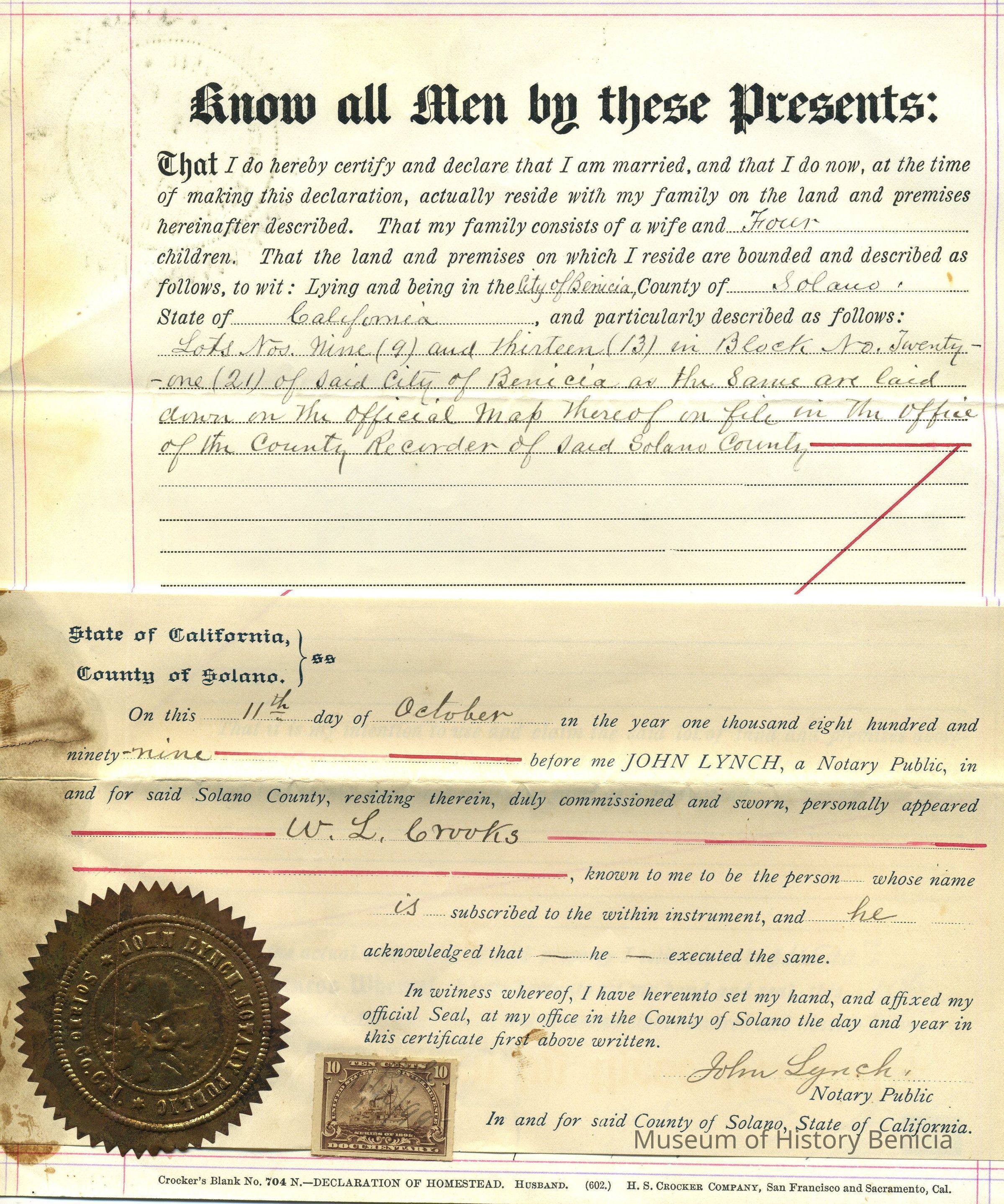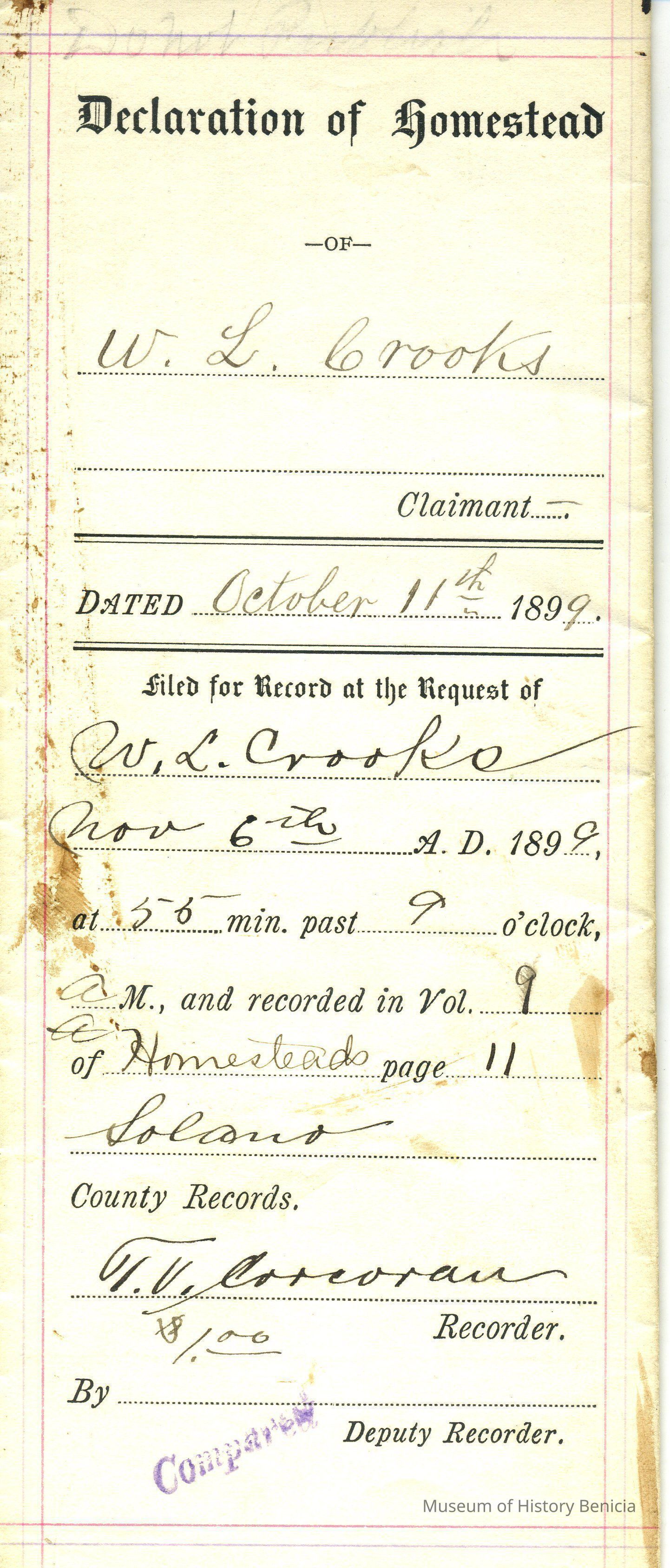 dated October 11, 1899, filed by W.L. Crooks for recording on November 6, 1899 at 9:56 am in Volume 9 of Homesteads page 11 Solano County Office of Records.