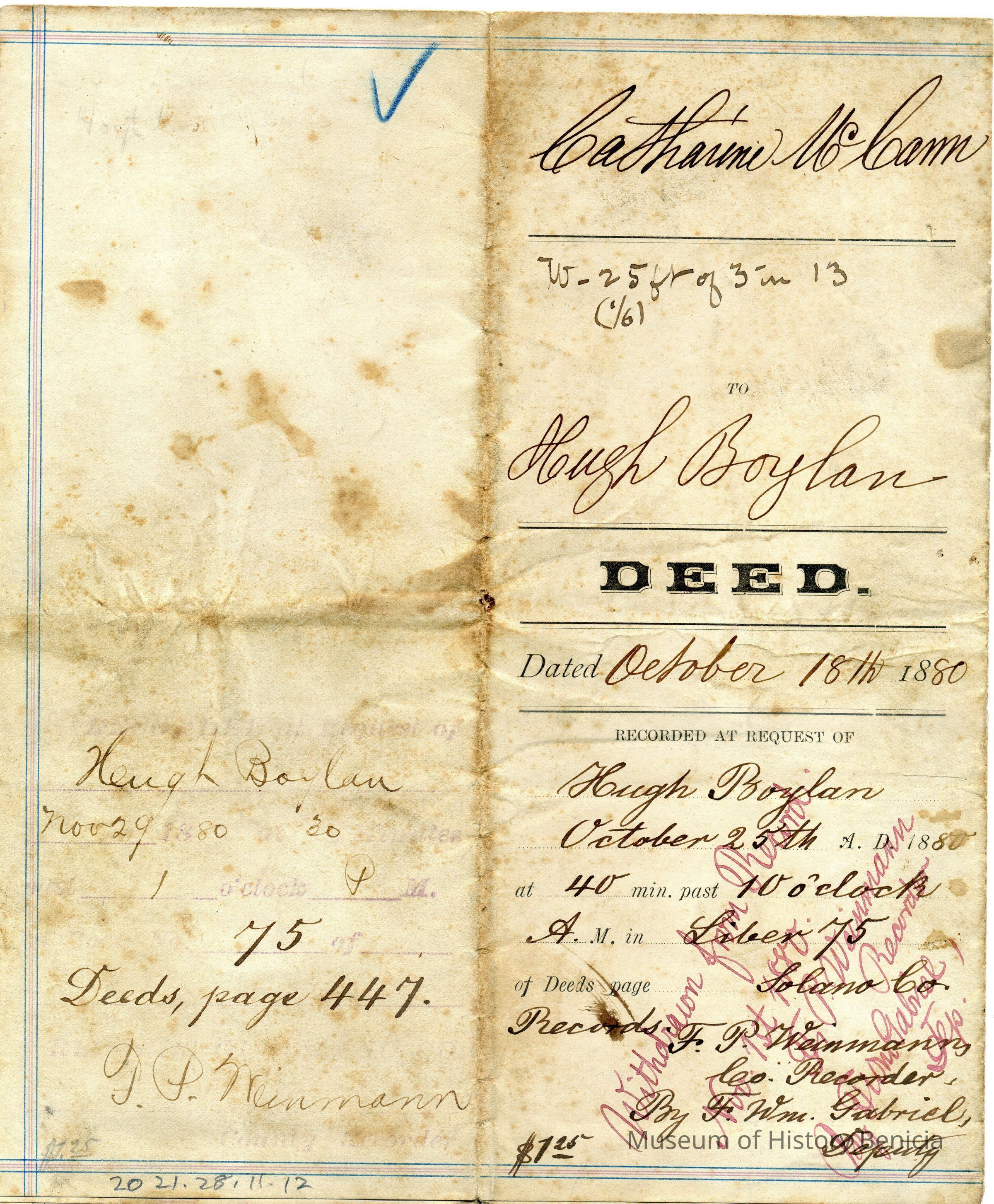 This is an official deed of transfer between Catherine McCann and Hugh Boylan for lot 3 block 13 in Benicia on 10/18/1880 for $400. This is the official paperwork of record 221.28.11.10 which is a letter describing this property.