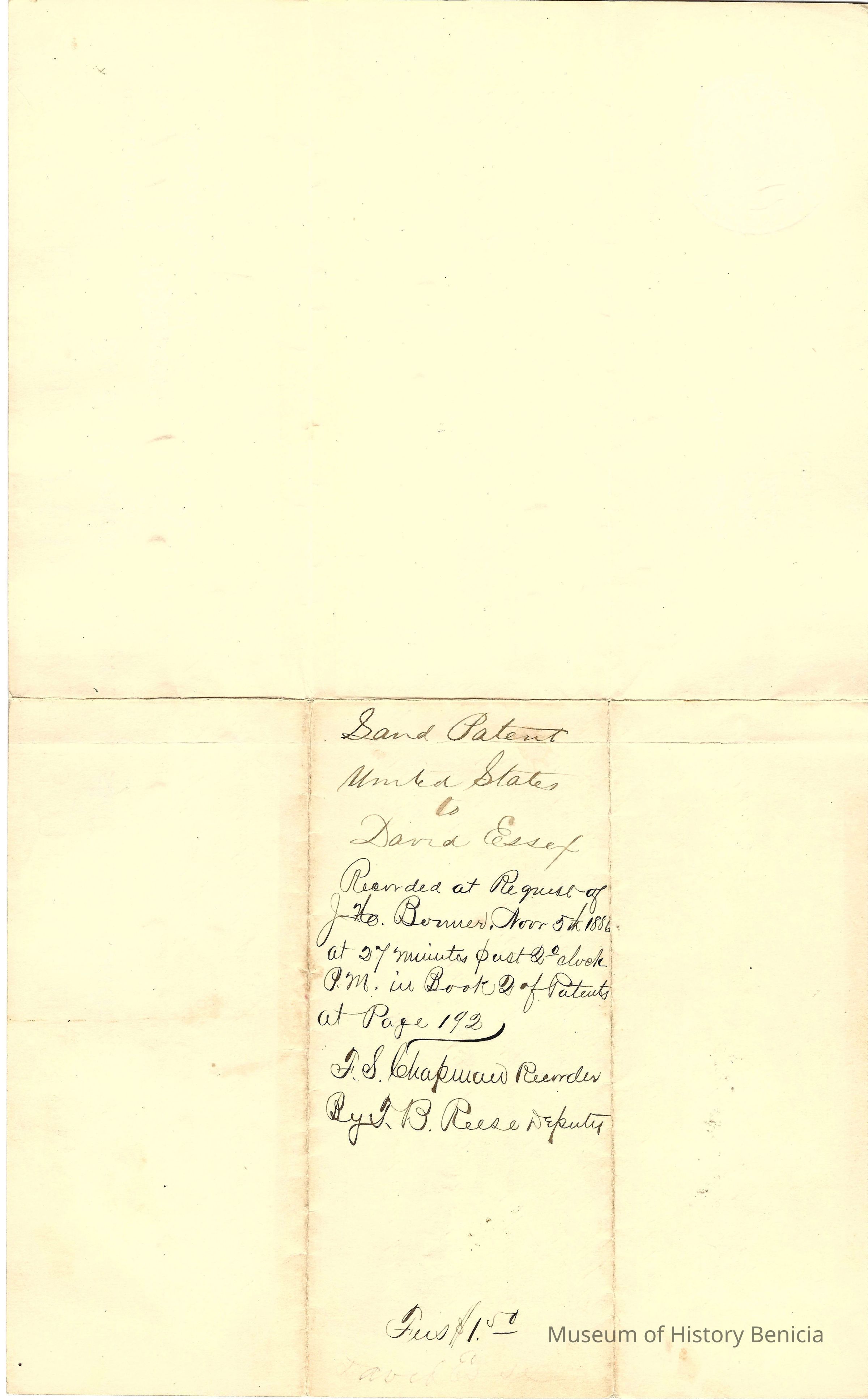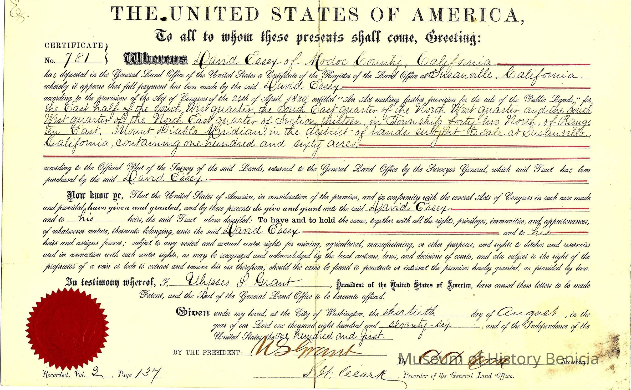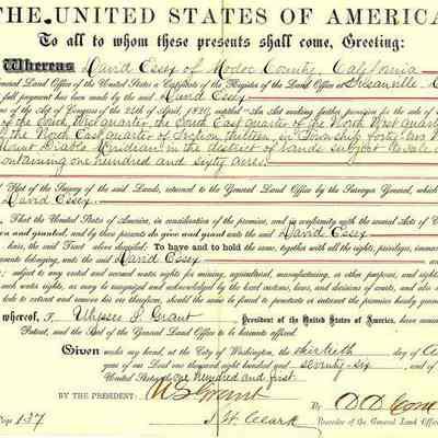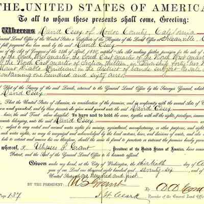 Original land grant to David Essex of Modoc County, Ca for the purchase of 160 acres near Susanville, Ca in 1876. This sale was based on the Land Act of 1820.