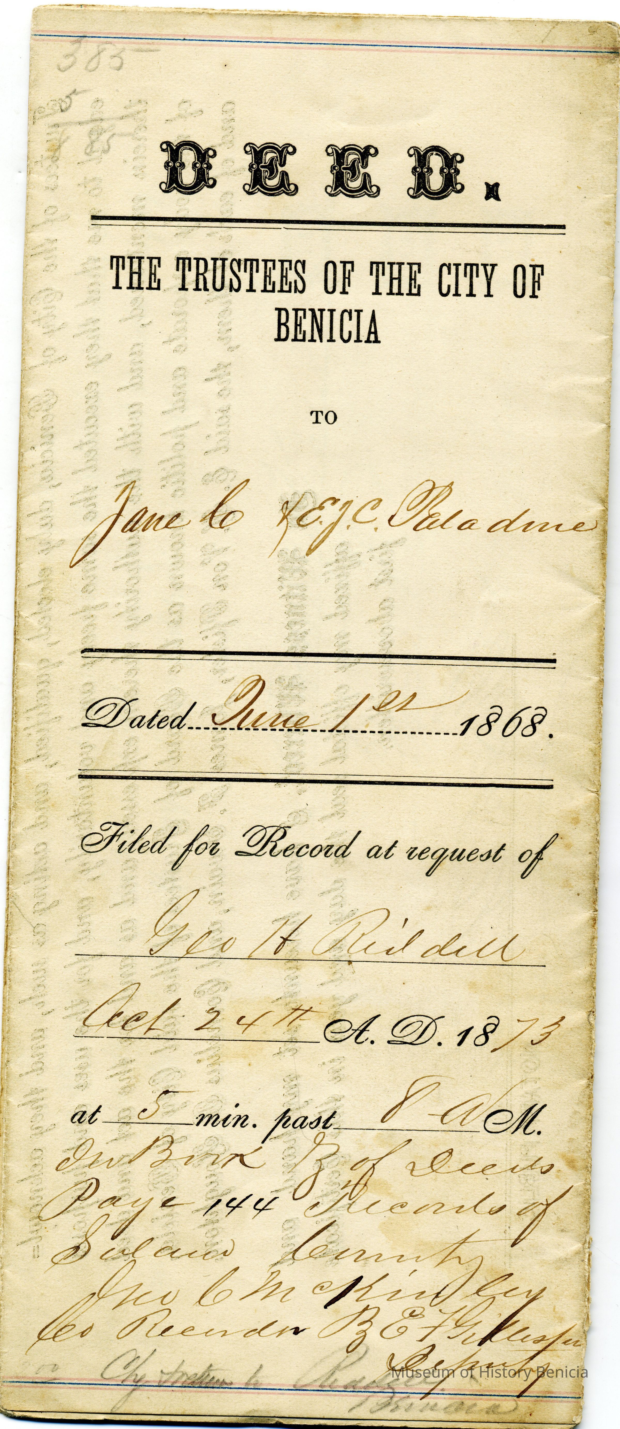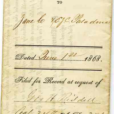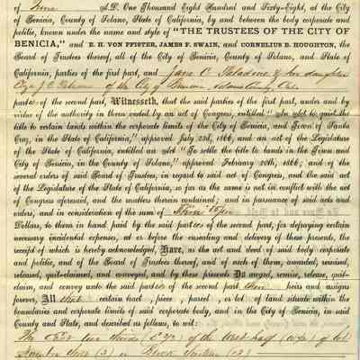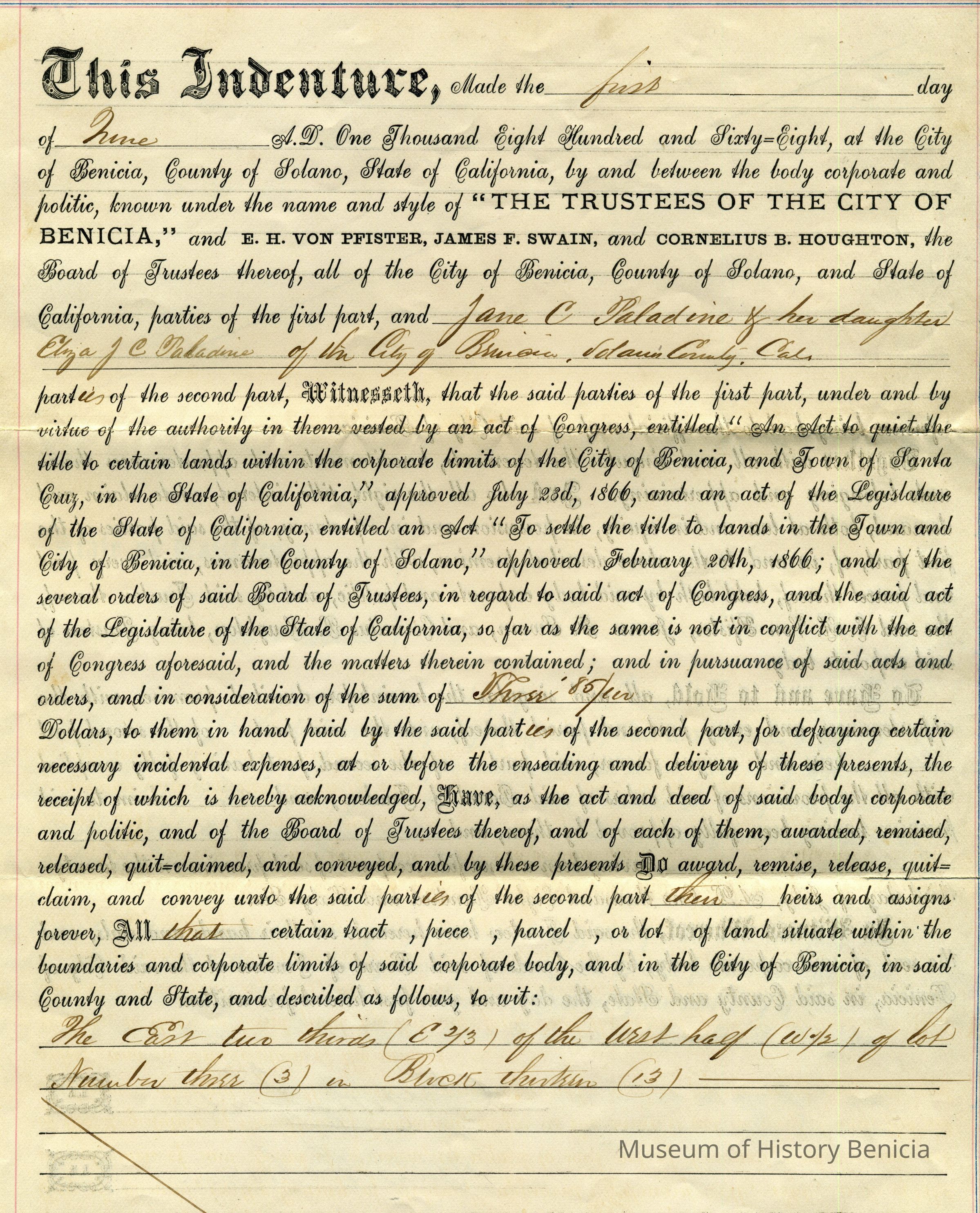 This is a deed to Jane C. & E.J.C. Paladine (her daughter) dated 06/01/1868. It is part of the activities to entitle people in Benicia to their own property after the Supreme Court decided the sales from General Vallejo related to the Soscol Ranch were invalid. This deed conveys the East two-thirds of the West half of lot 3 in block 13 to Jane and Elizabeth Paladine. (This is the lot just off First street on East "D" street.)