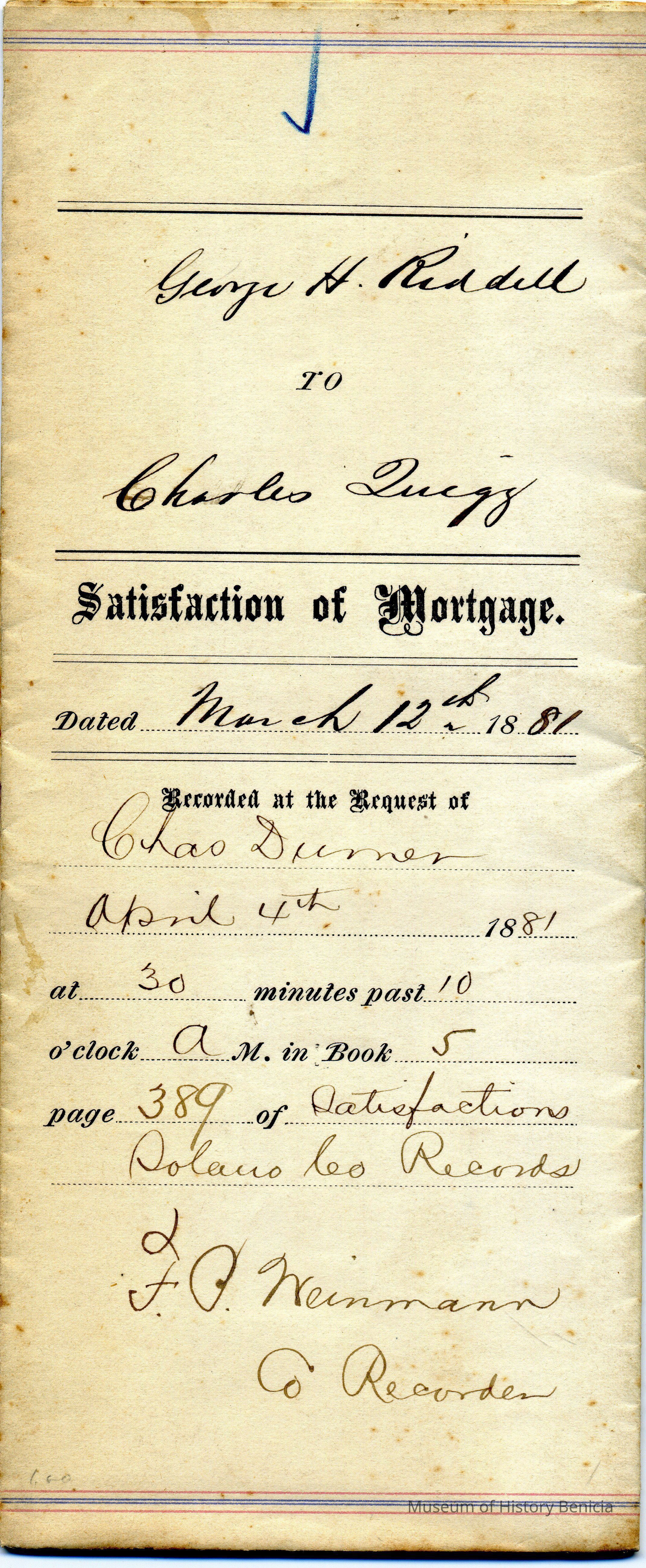 Filing showing thesatisfaction of a mortgage from George H. Riddell to Charles Durner on 03/12/1881.