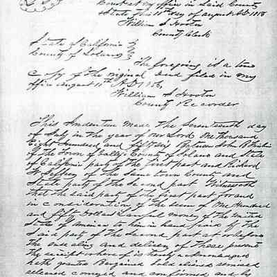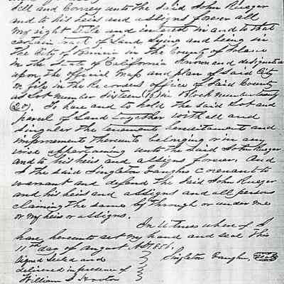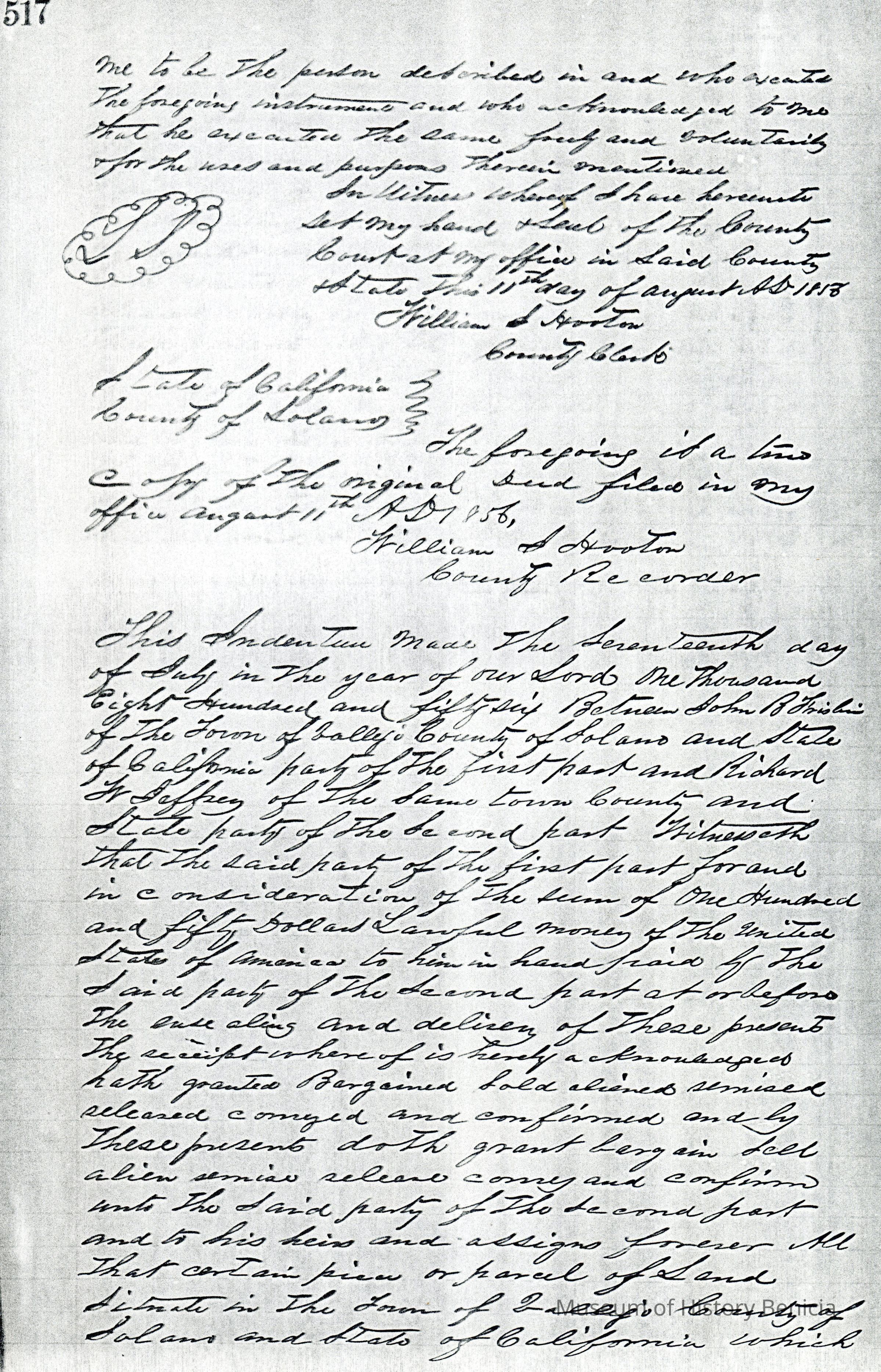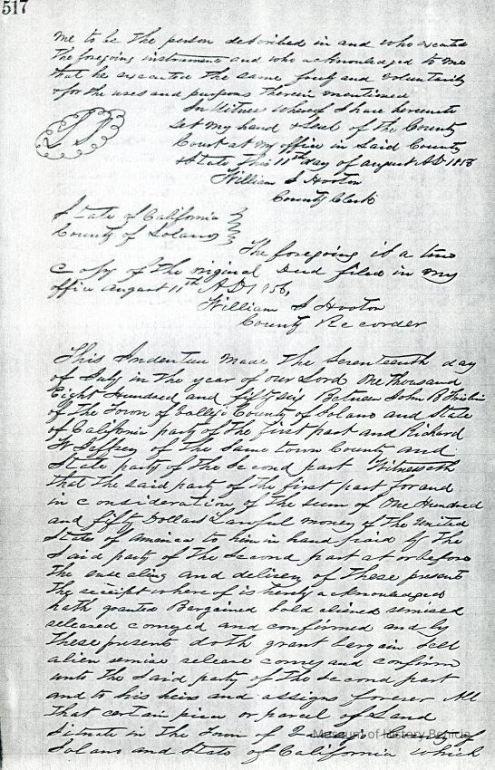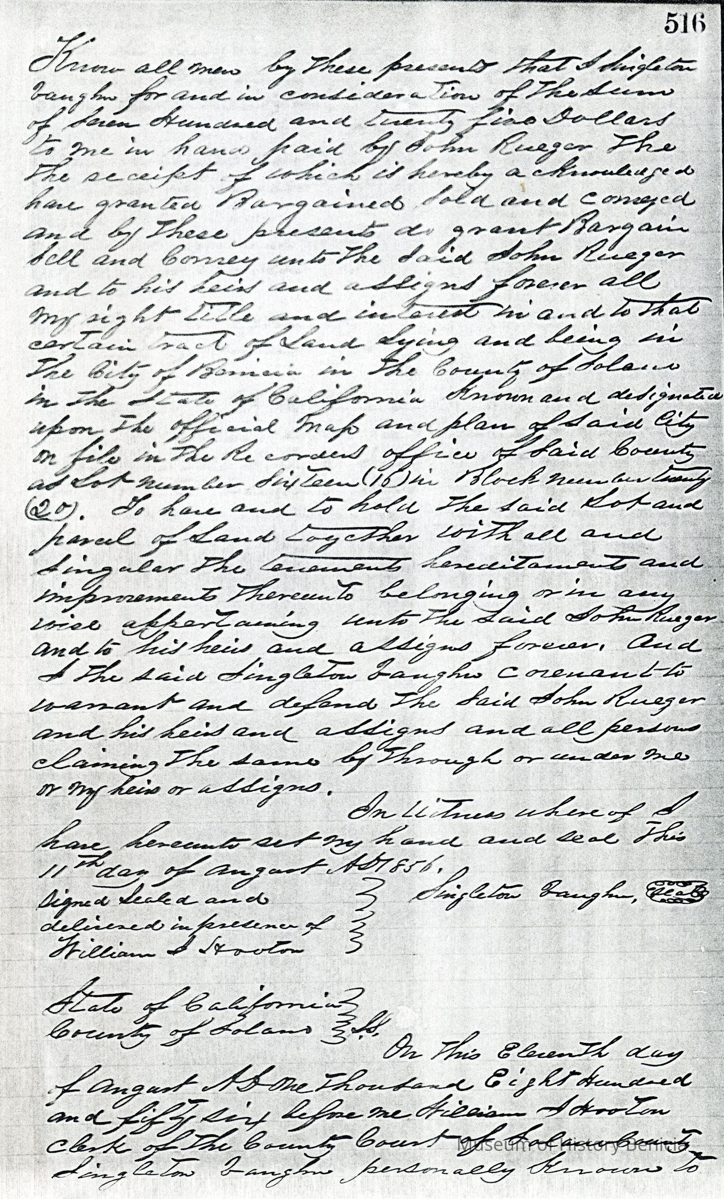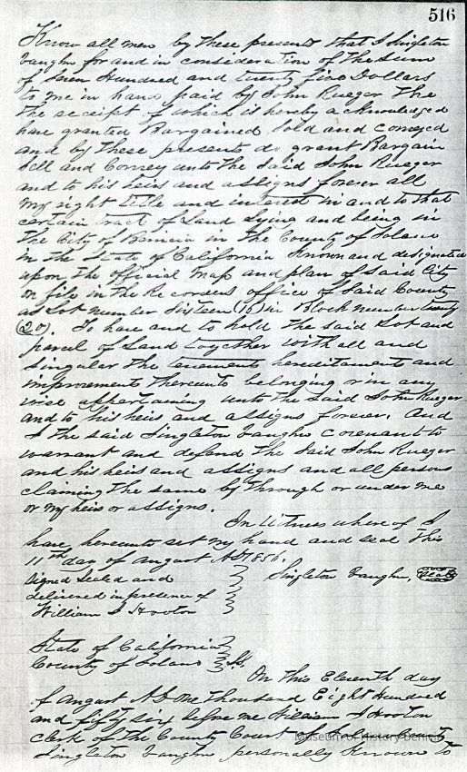 Copy of deed transfer (2 pages) from Singleton Vaughn to John Rueger (Sr.) as of 08/11/1856. This was in the Solano County records in Book "J" pages 516-517.